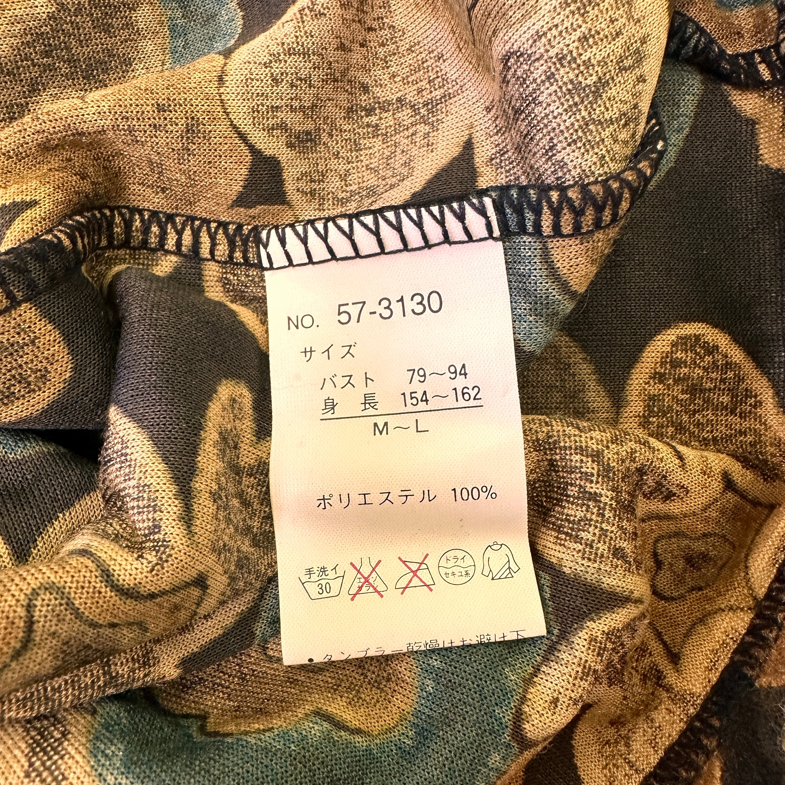 ブラウン、ベージュ、グリーンなどを基調としたレトロで大きな花柄が特徴的で、暖かみのある素材感が秋冬のレイヤードスタイルにぴったりです。