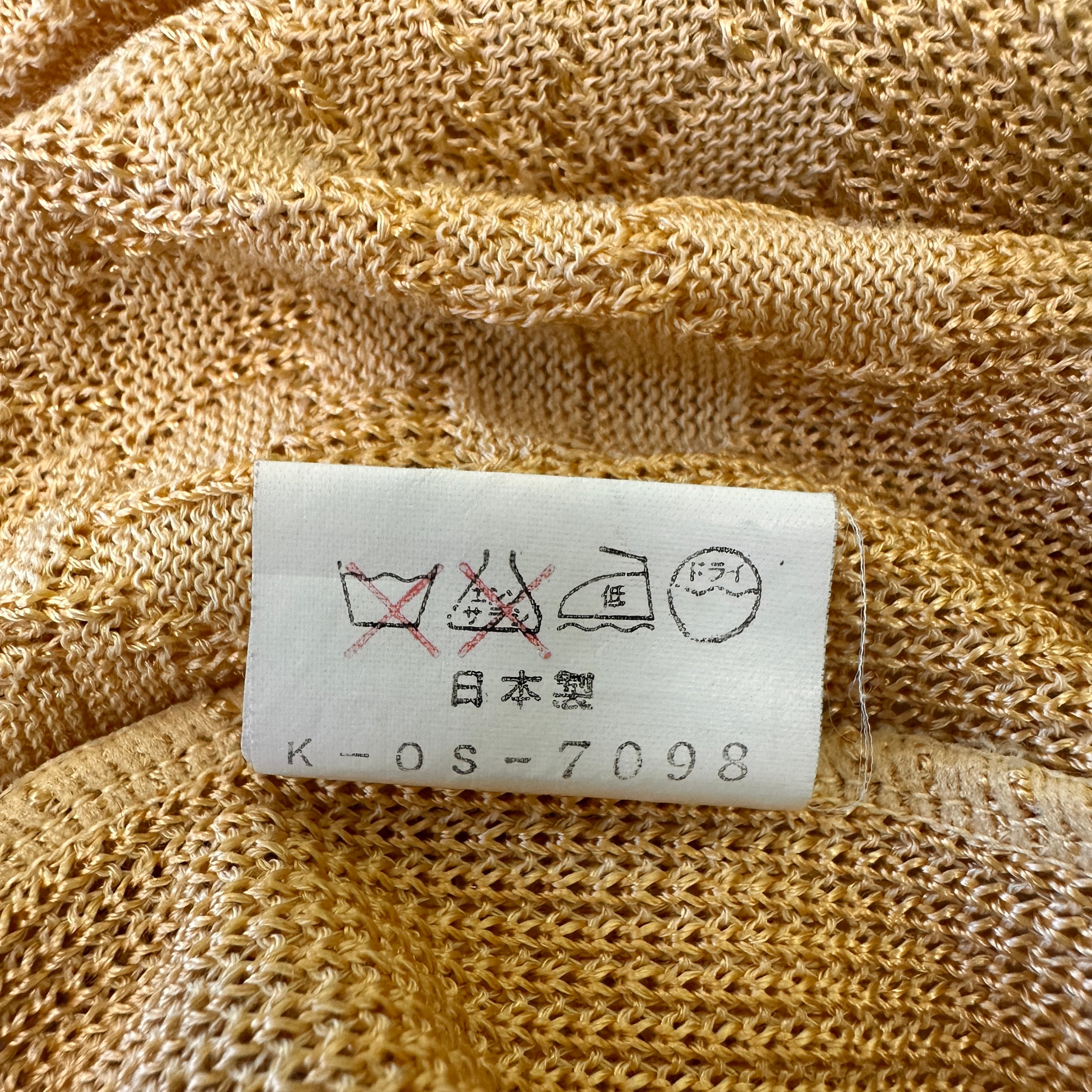明るいイエロー系、またはマスタードのような色味で、全体が透かし編み(メッシュニット)になっています。