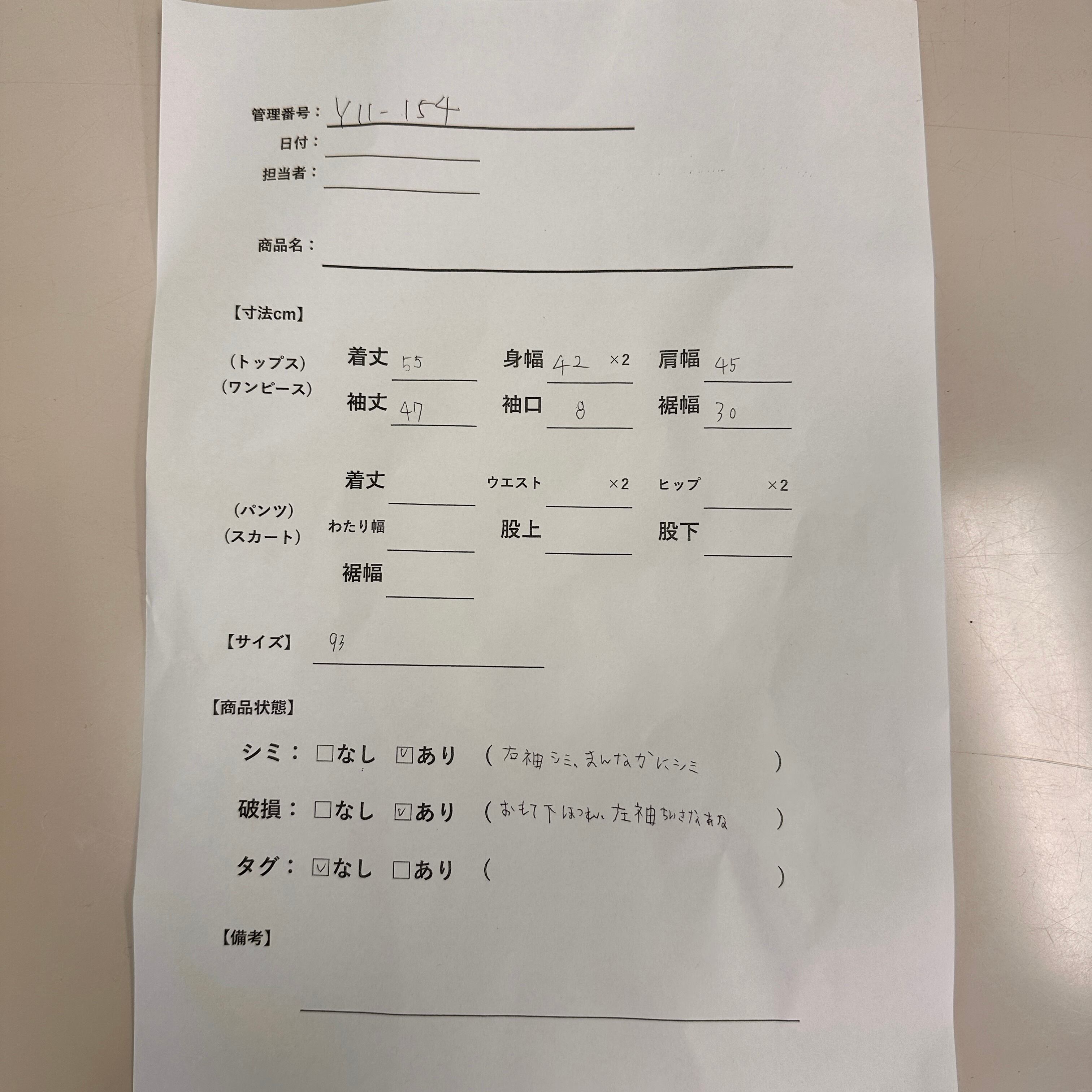 シミ/汚れ: あり(右袖口のシミ、中央にシミ)