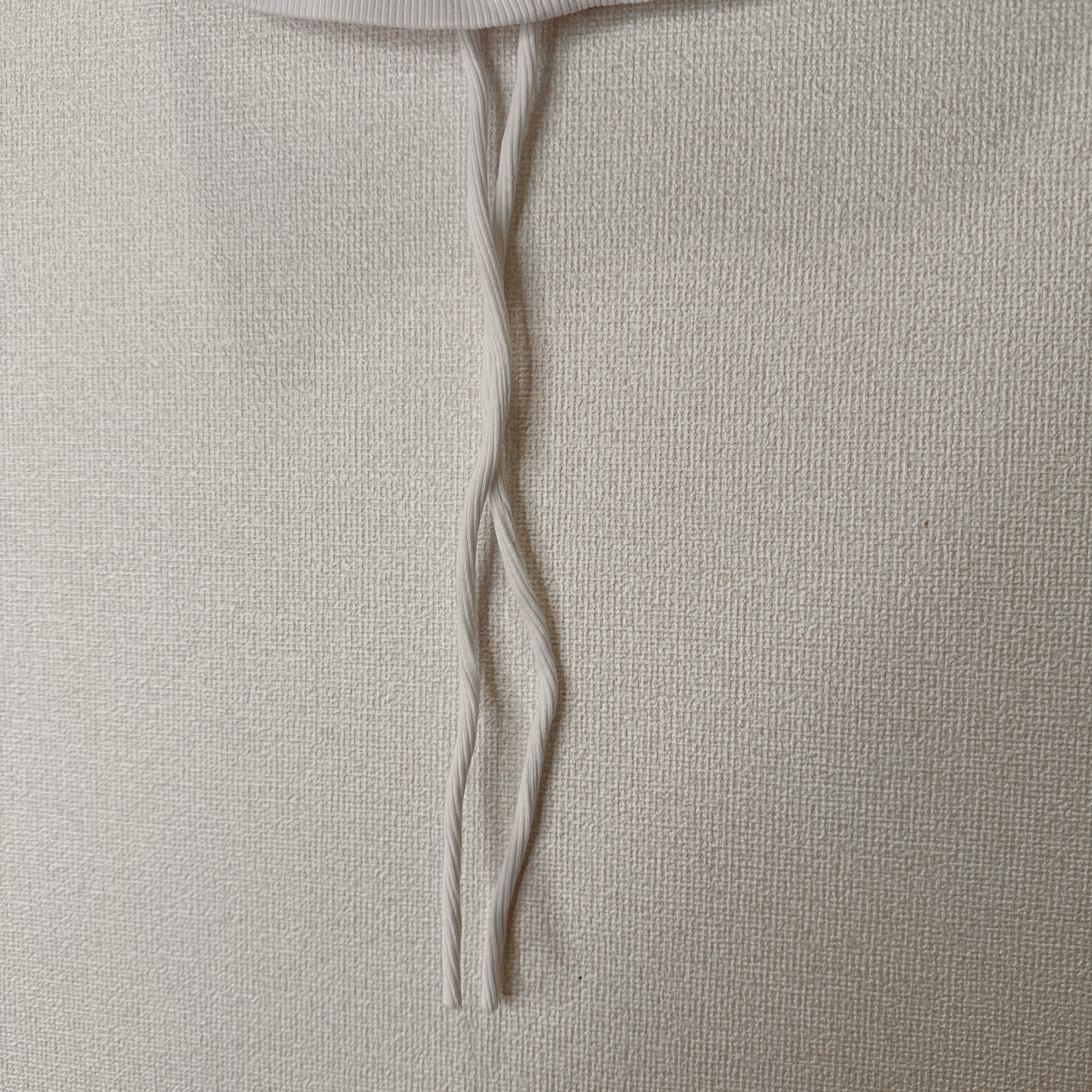 フロント中央にシャーリング(ギャザー)を寄せるためのドローストリング(絞り紐)があり、着丈やデザインを調整できるデザインです。