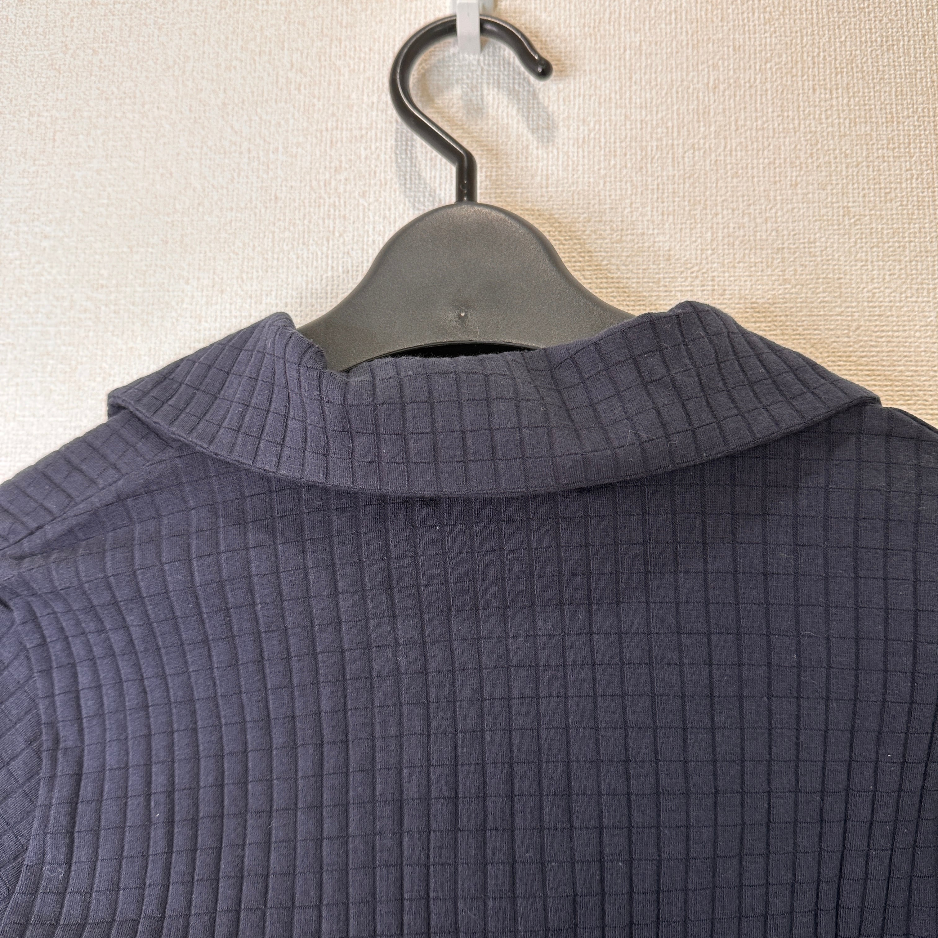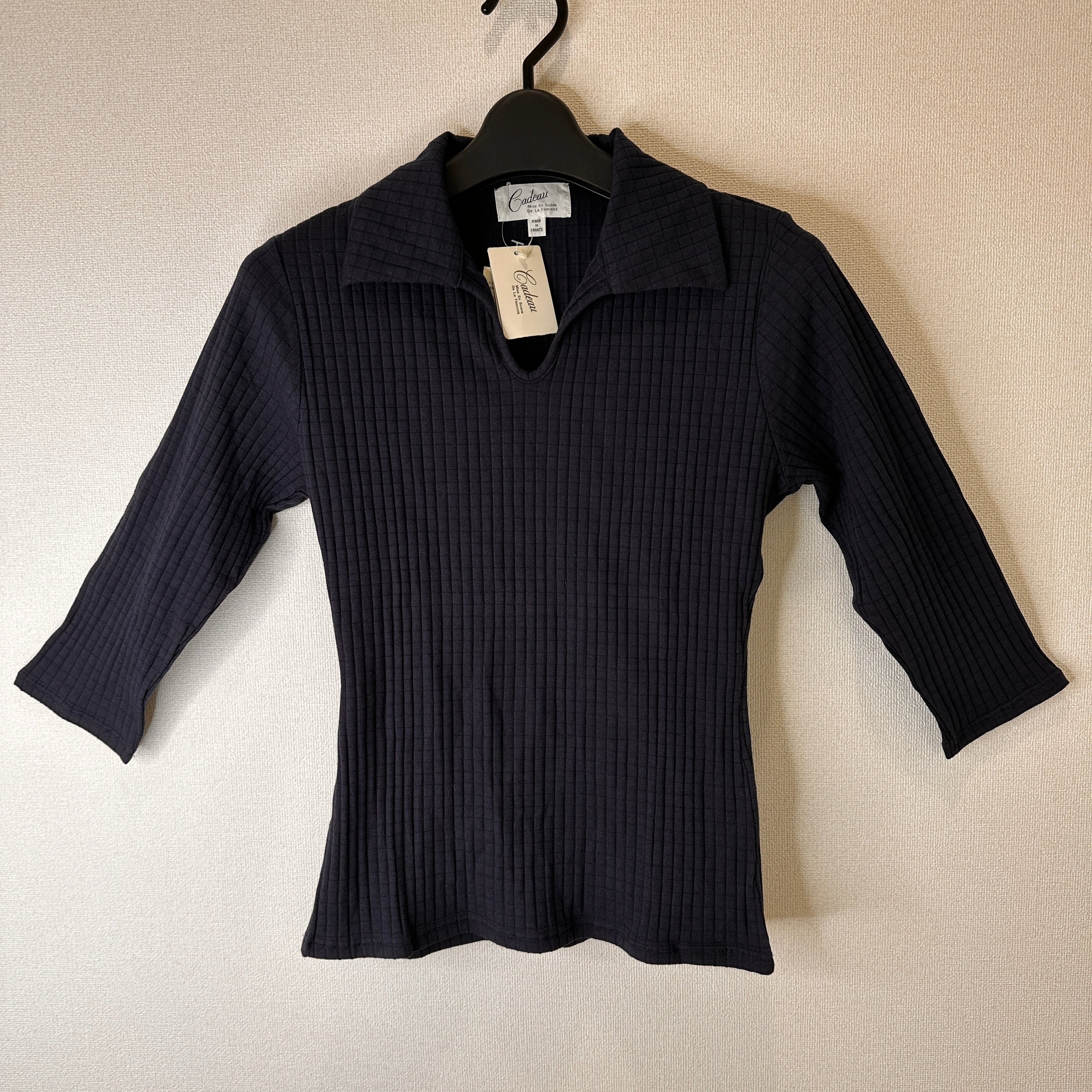 リブ編みのネイビー五分袖トップス、フランス製の襟付きデザイン。