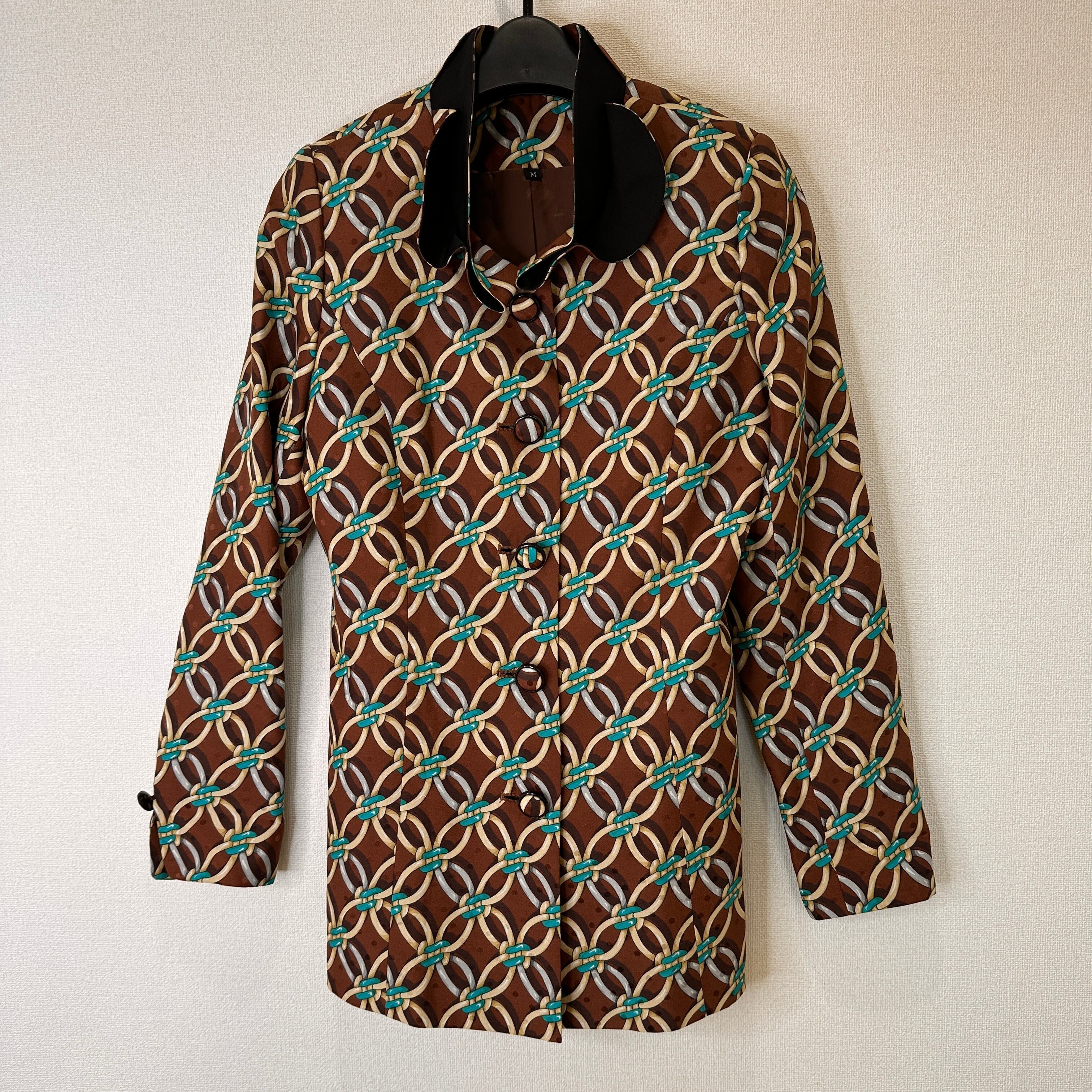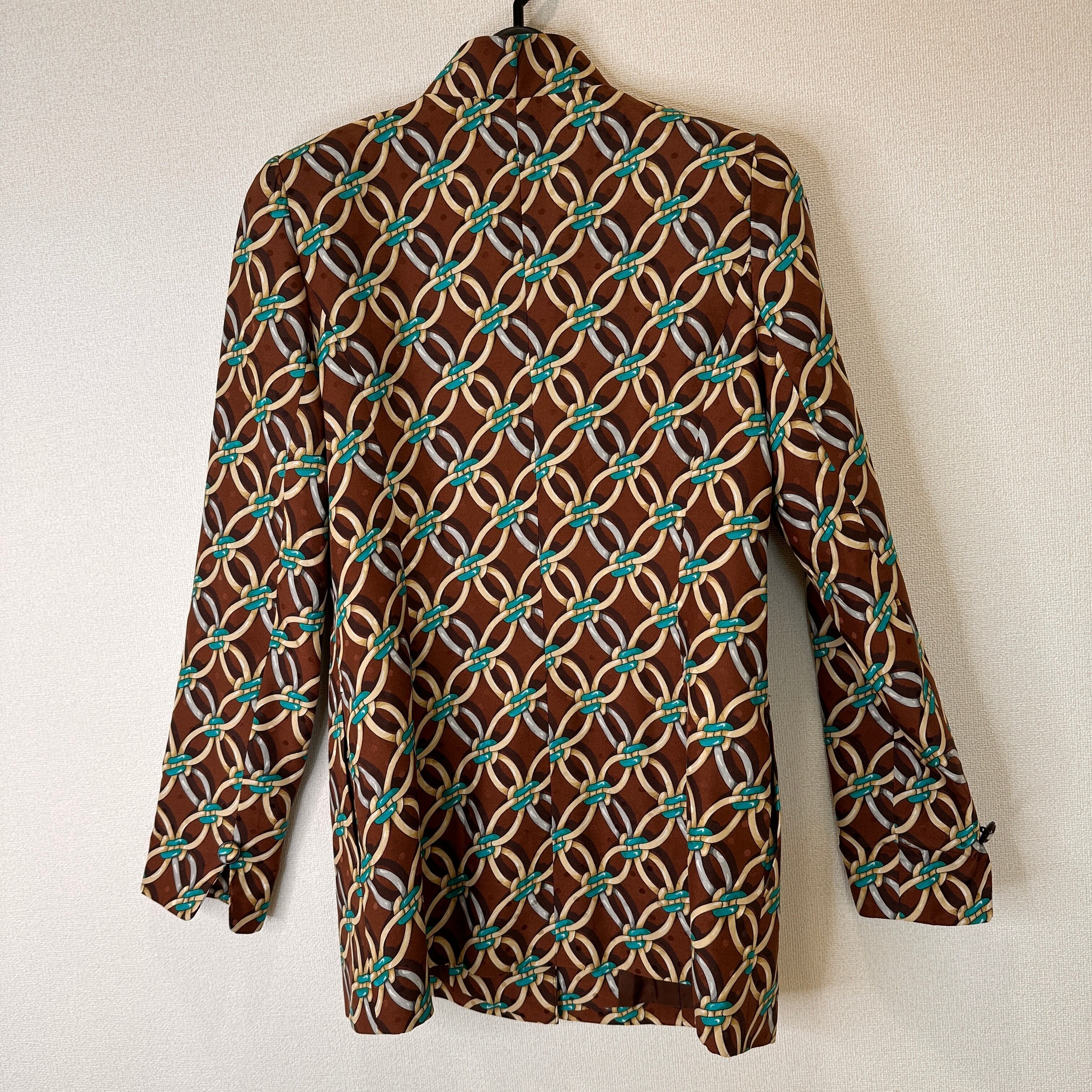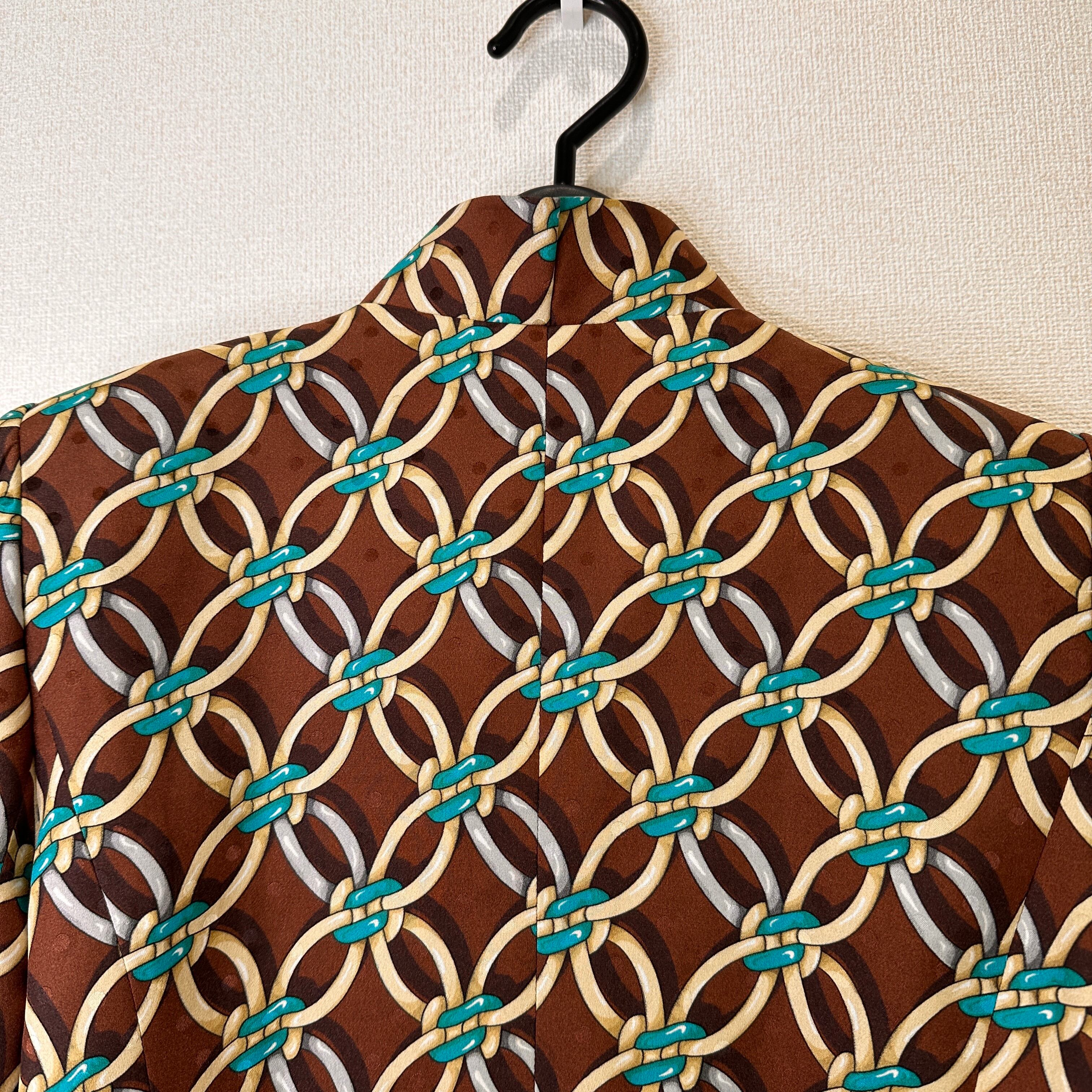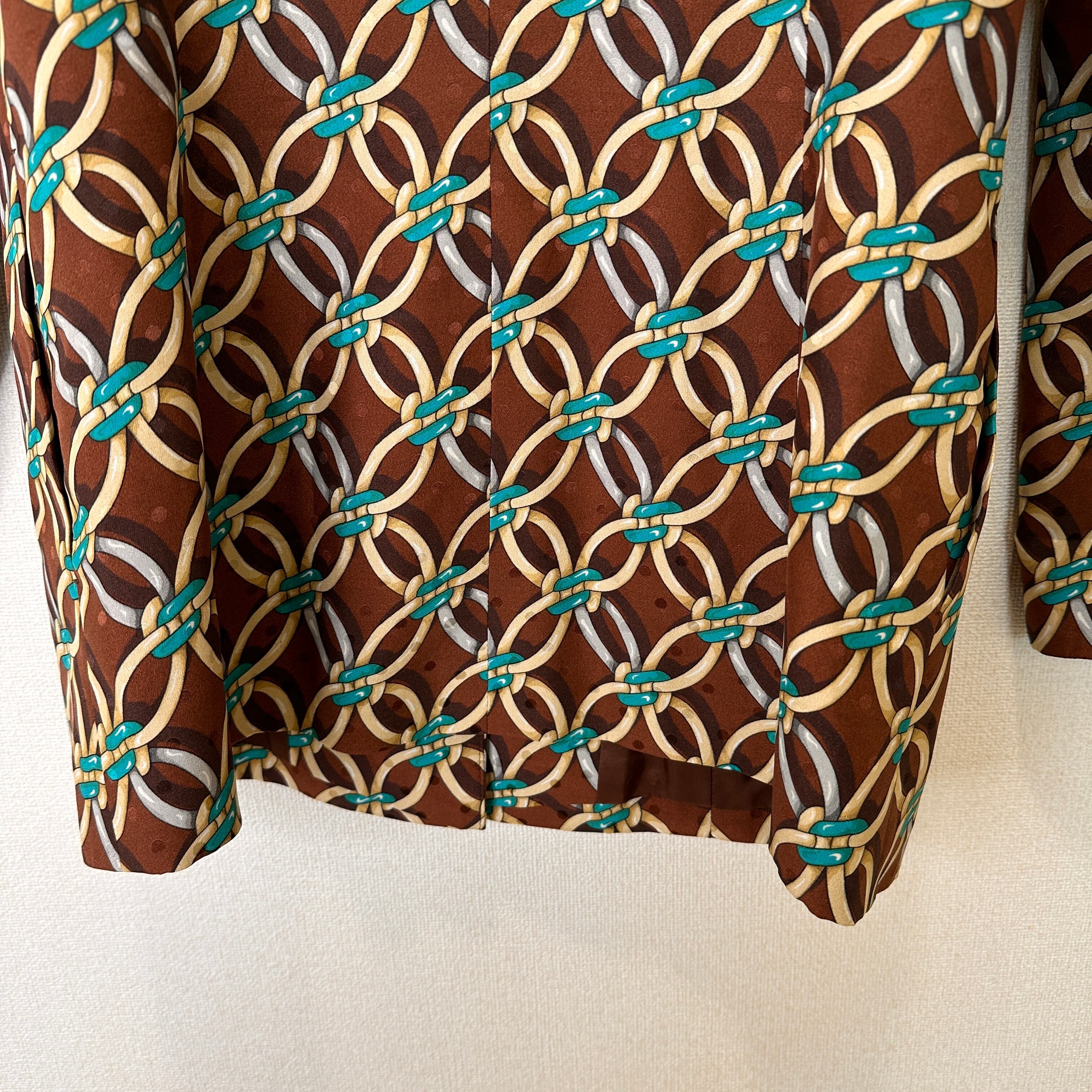 ブラウンを基調に、ターコイズブルーやベージュ、シルバーなどのチェーンモチーフが連続する華やかなデザインジャケットです。