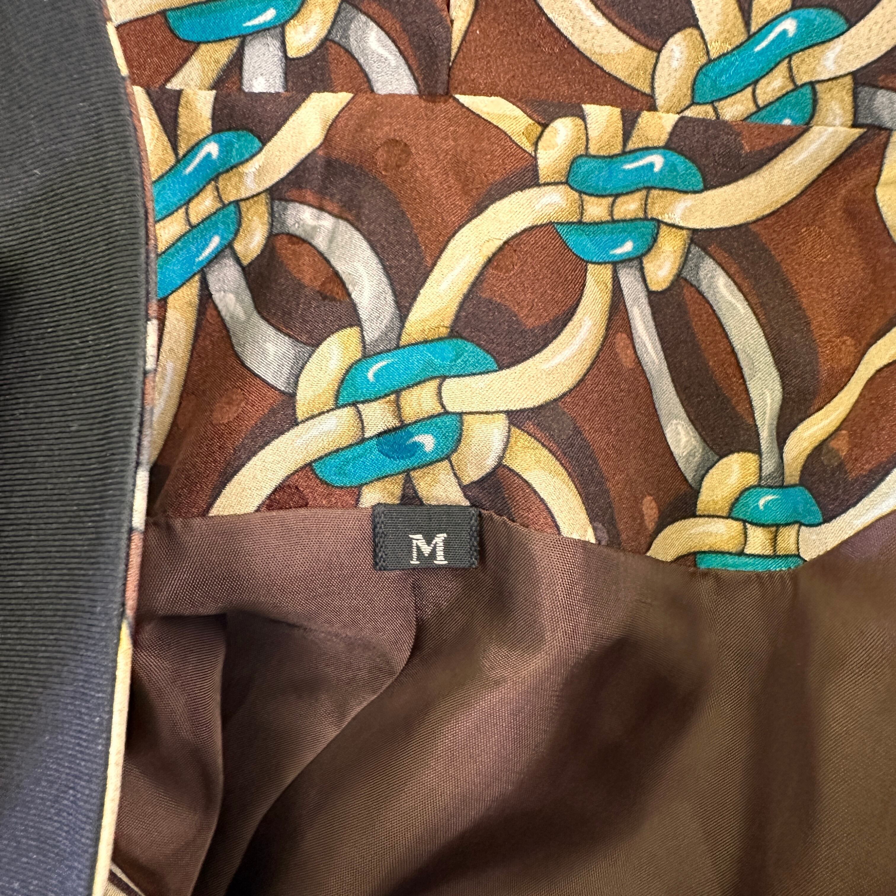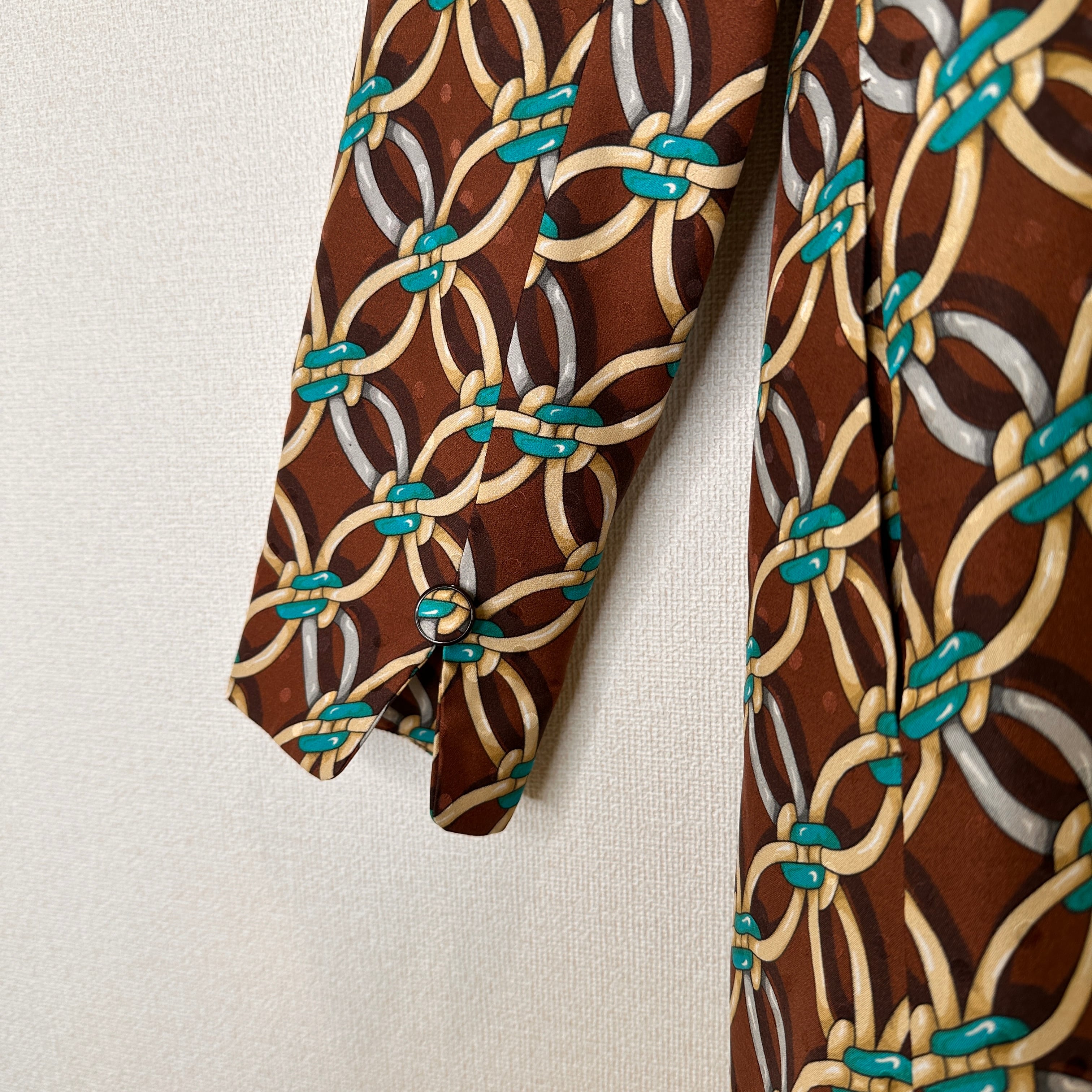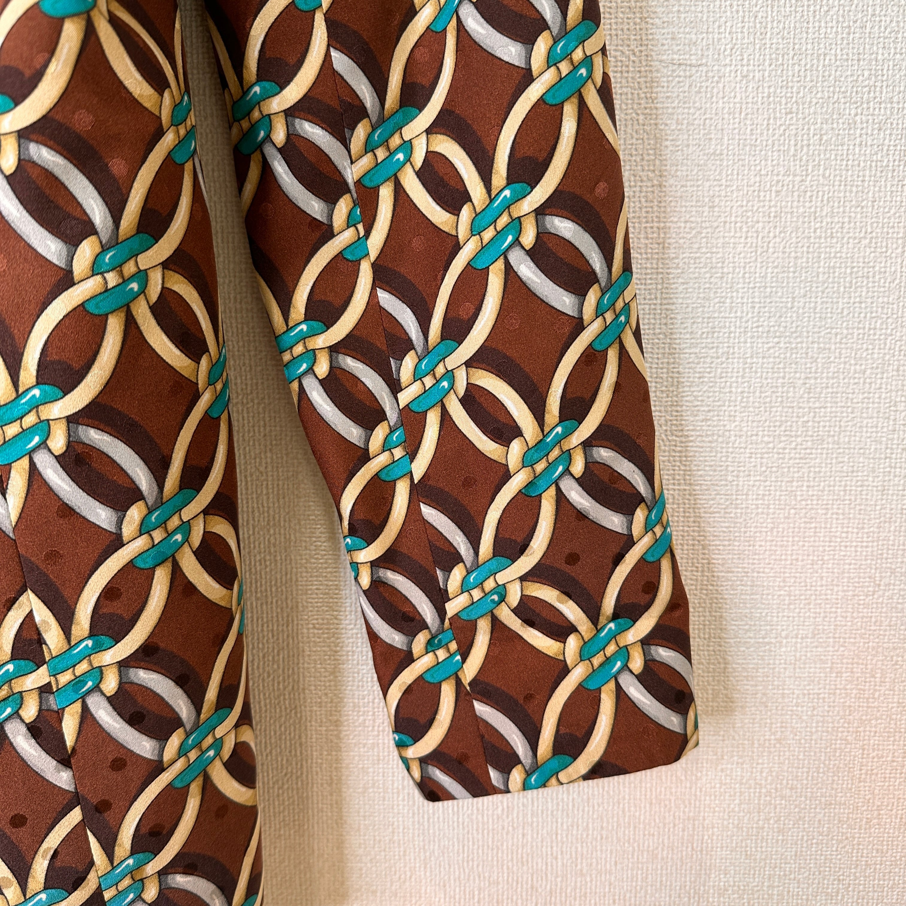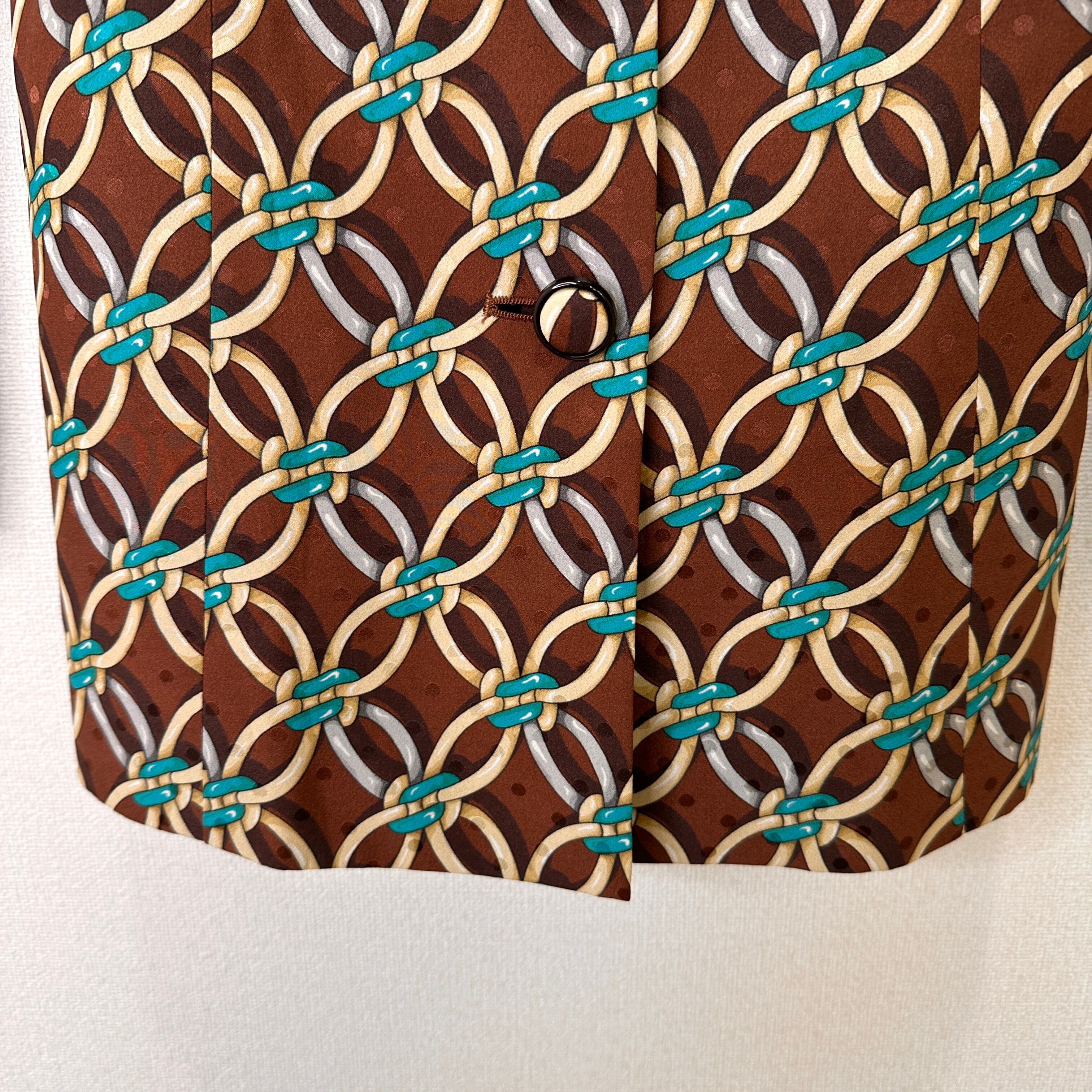 ブラウンを基調に、ターコイズブルーやベージュ、シルバーなどのチェーンモチーフが連続する華やかなデザインジャケットです。
