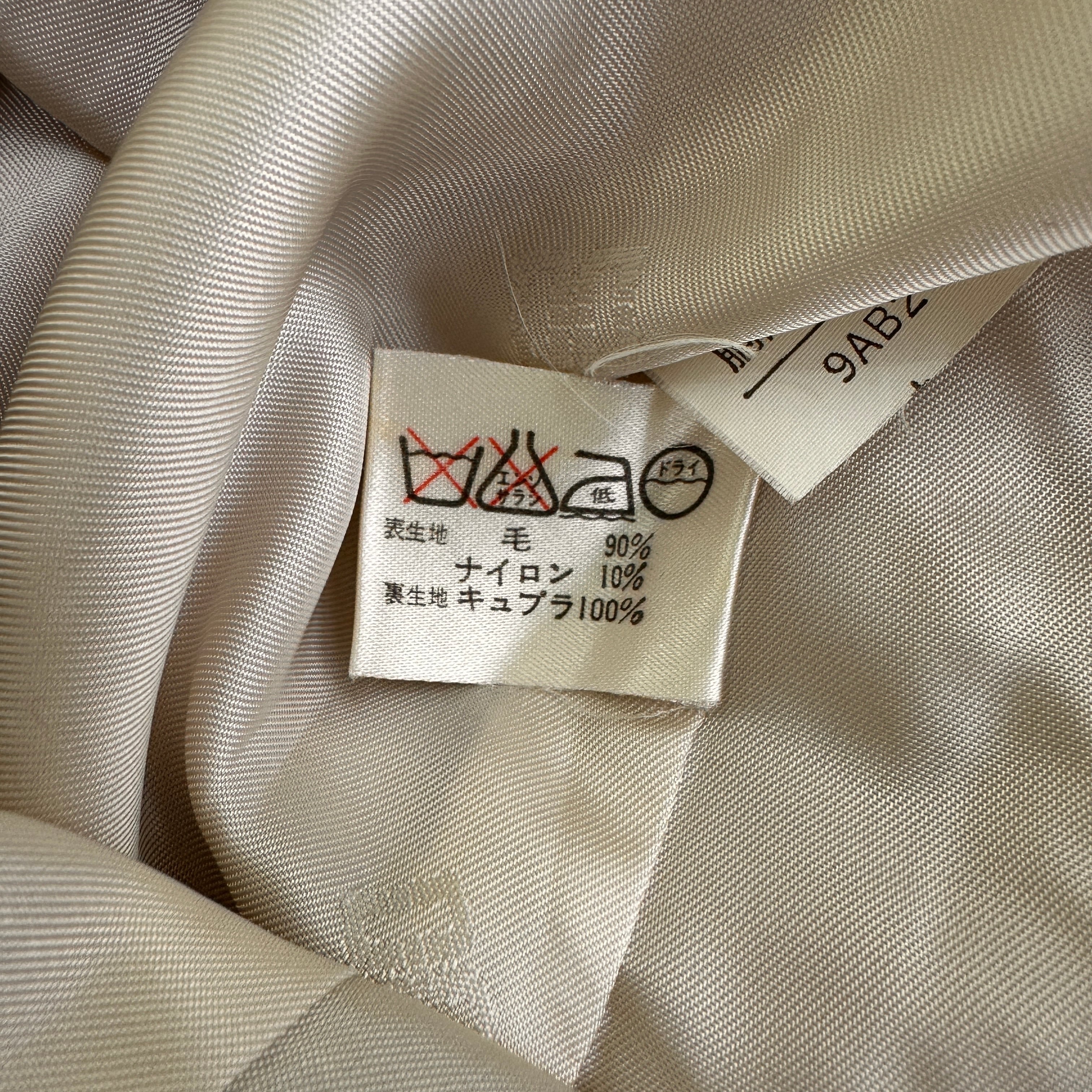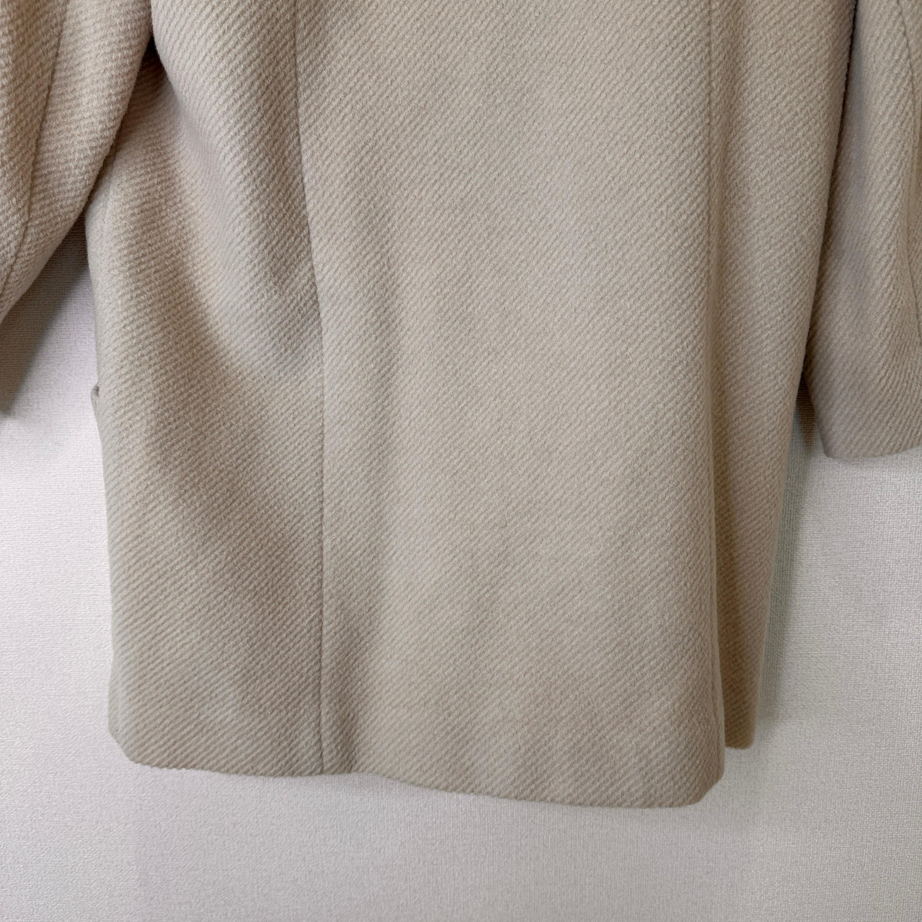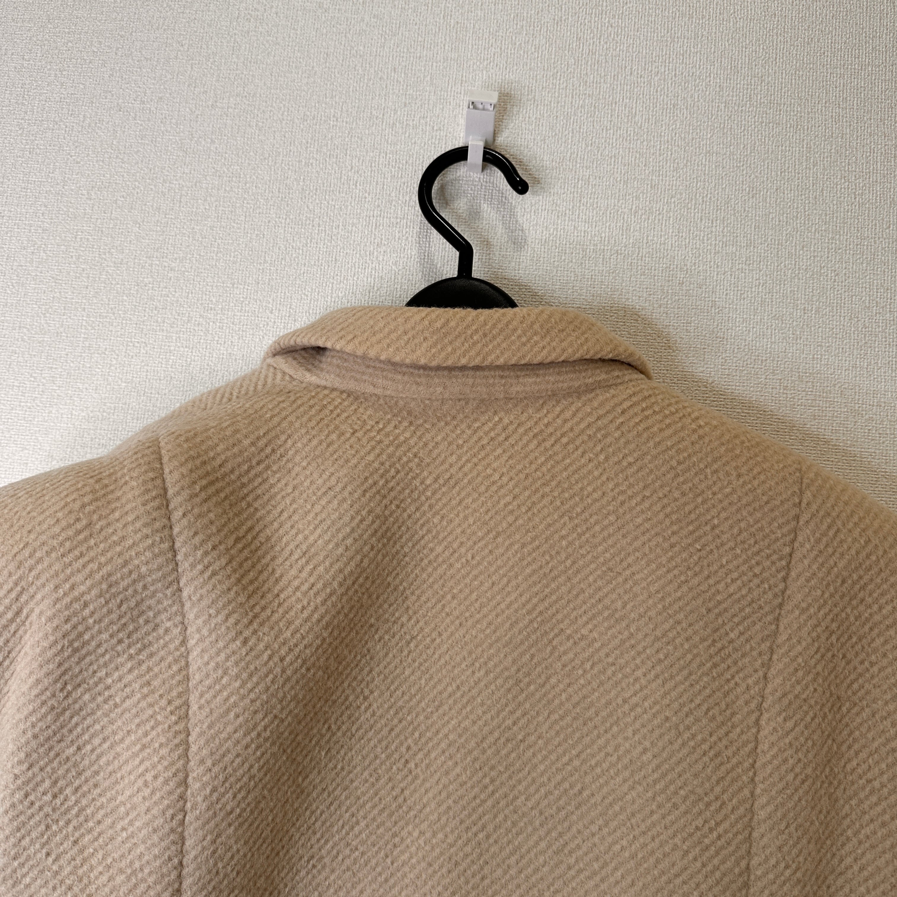 ベージュ系の温かみのあるカラーで、ウール90%の素材(アンゴラ混の可能性もあり、タグに「毛90%」と記載)が使用された厚手の生地感です。