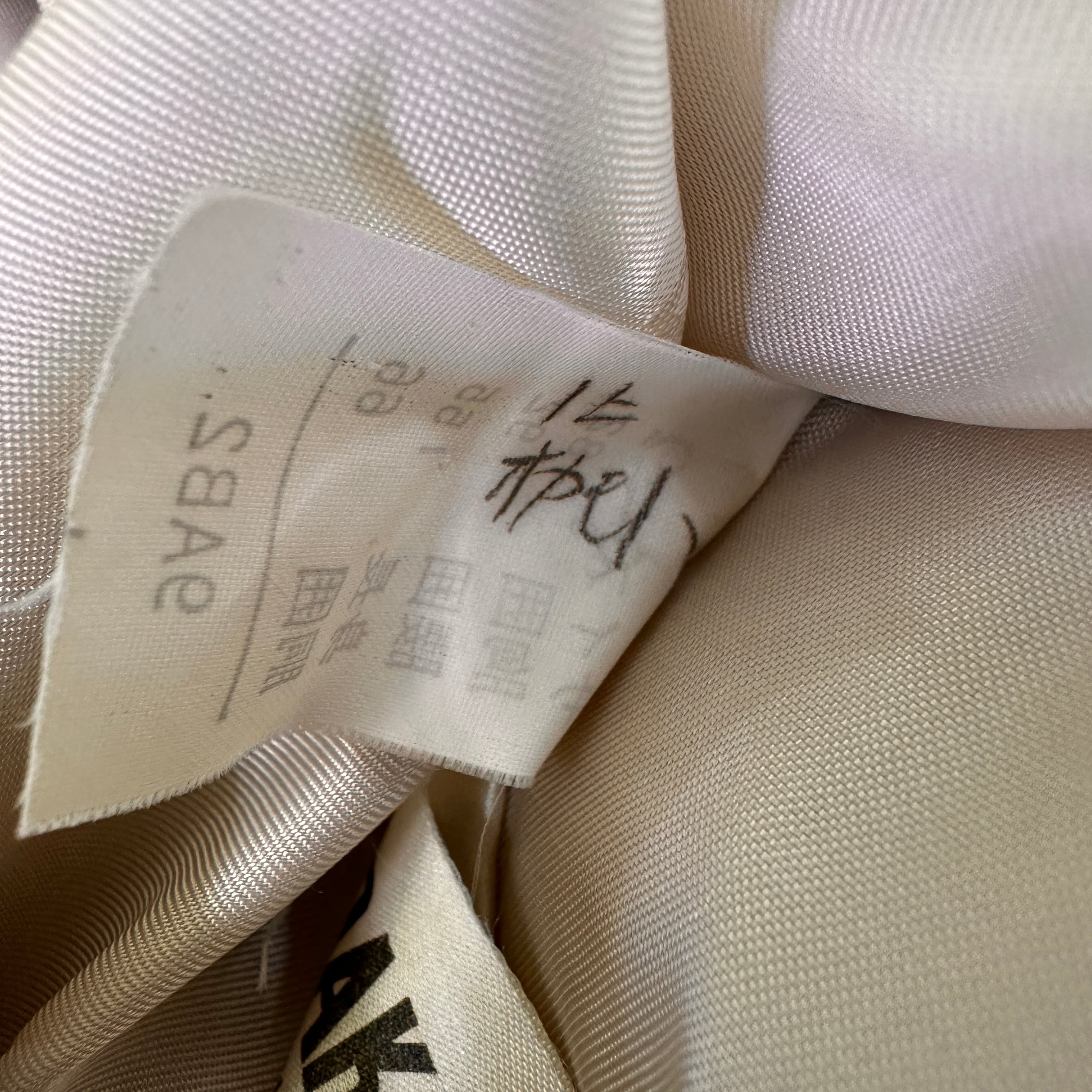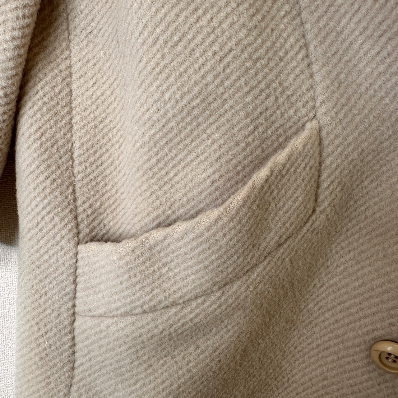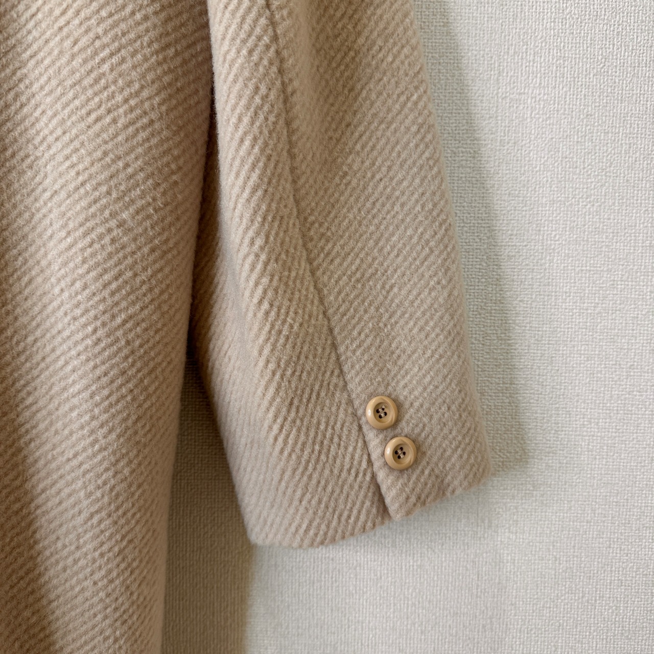 ベージュ系の温かみのあるカラーで、ウール90%の素材(アンゴラ混の可能性もあり、タグに「毛90%」と記載)が使用された厚手の生地感です。