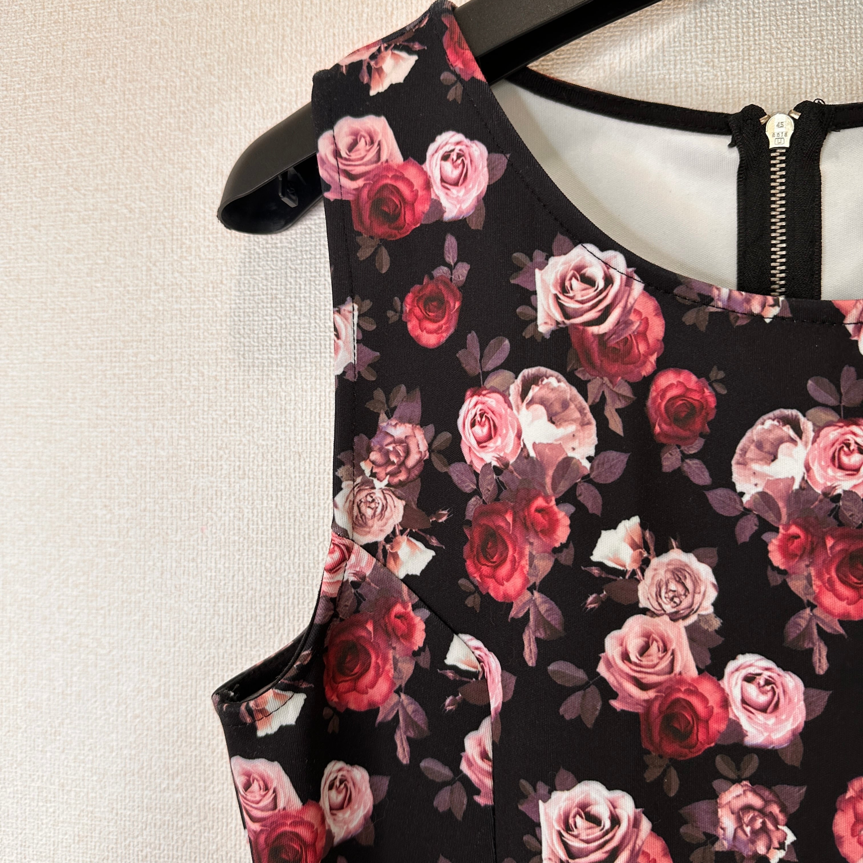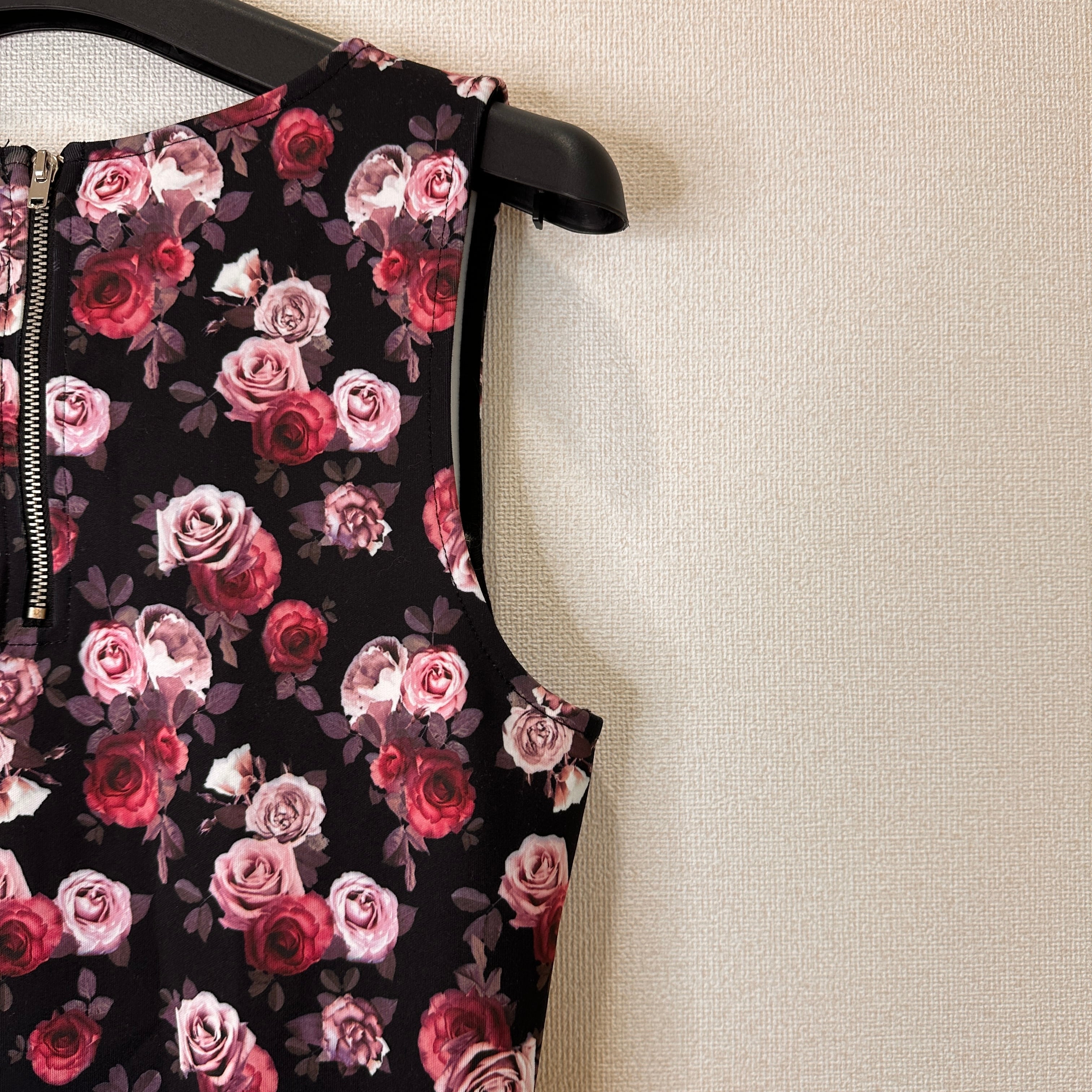 黒地に赤とピンクの花柄が施されたノースリーブワンピース。