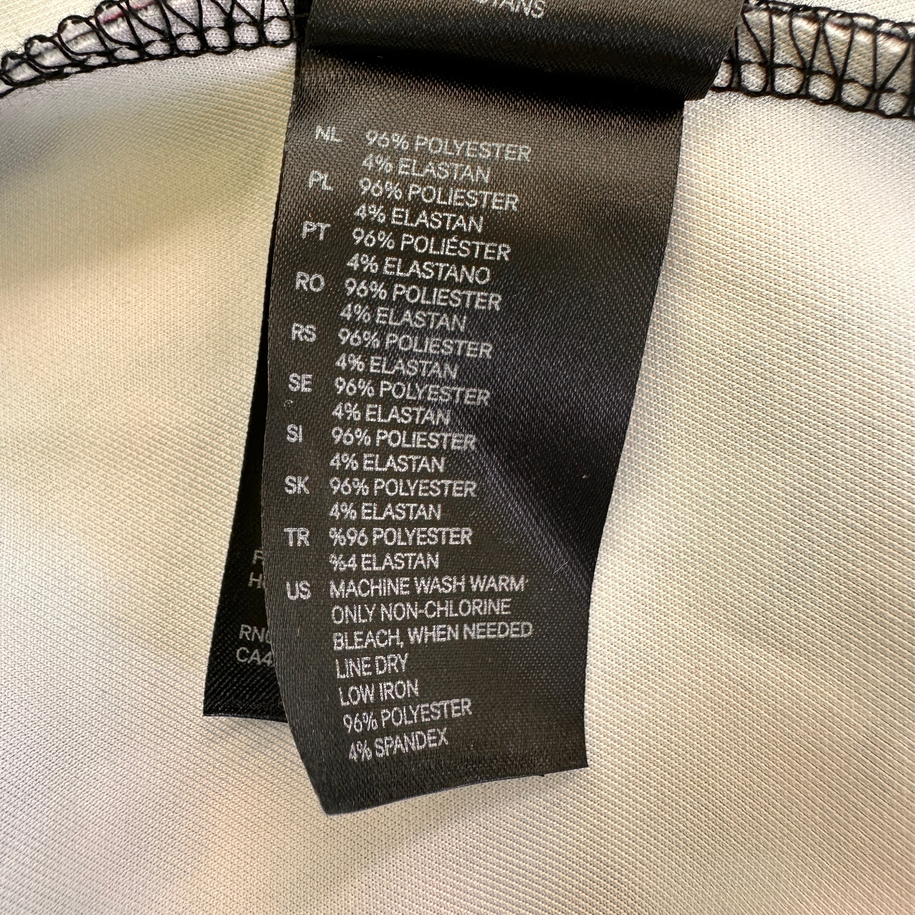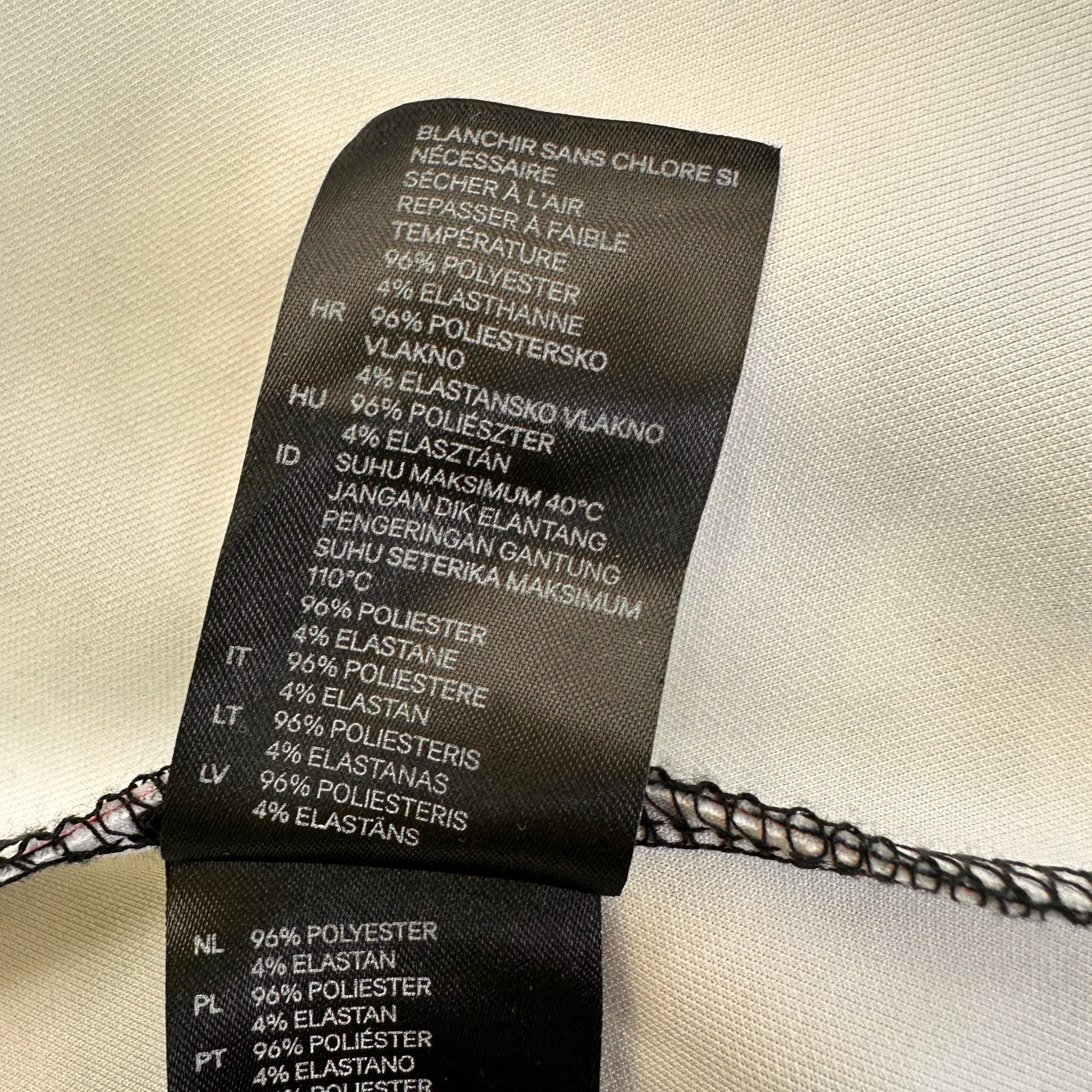 素材はポリエステルが主でストレッチ性のあるエラステーン(ポリウレタン)が配合されており、着心地が良いと推測されます。