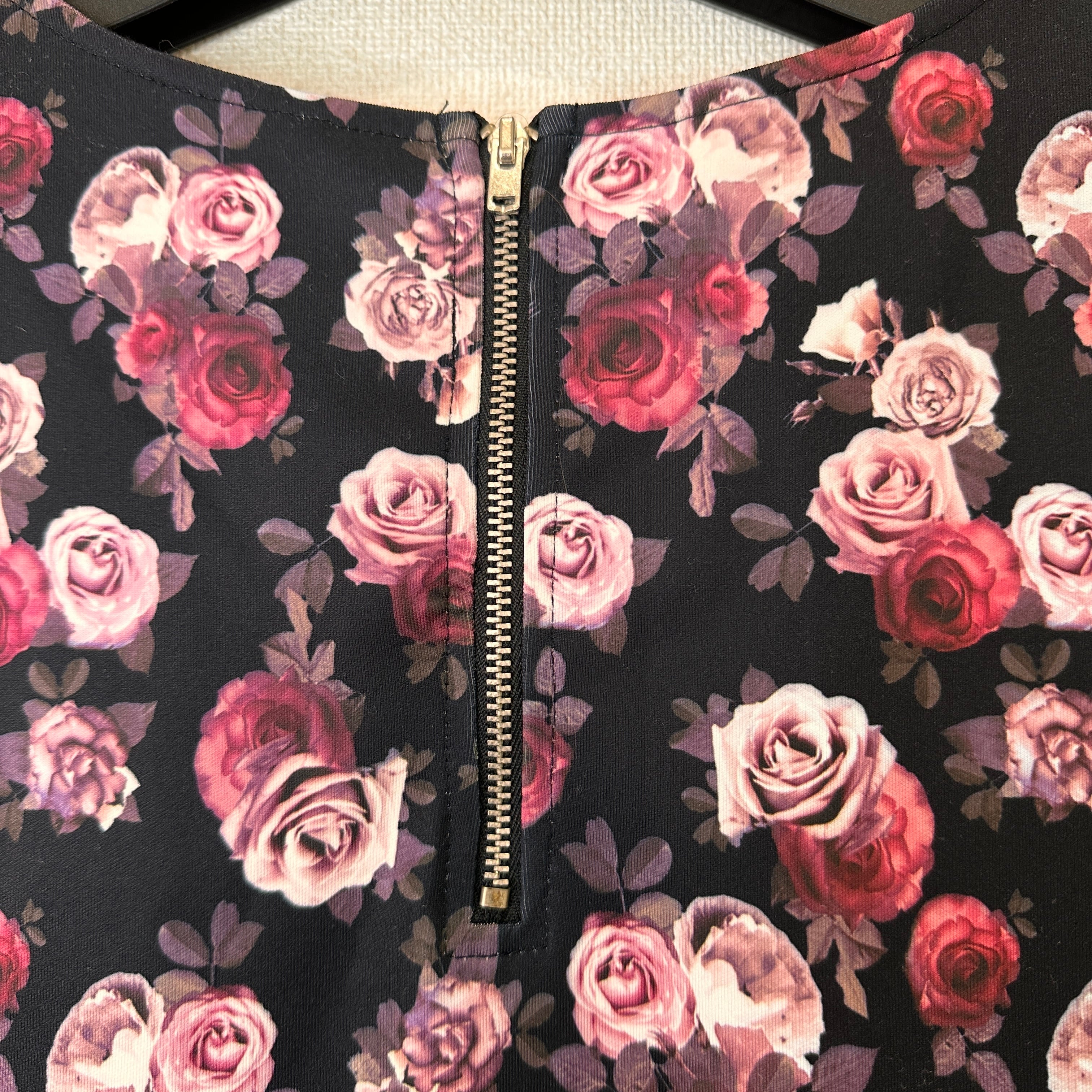 黒地に赤、ピンク、白の様々な色合いのバラ(ローズ)がプリントされた華やかなデザインです。