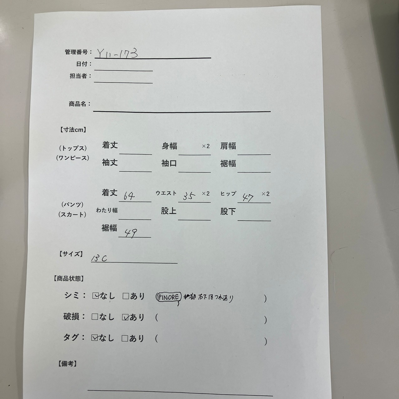破損: あり(PINOREタグの下にほつれあり)