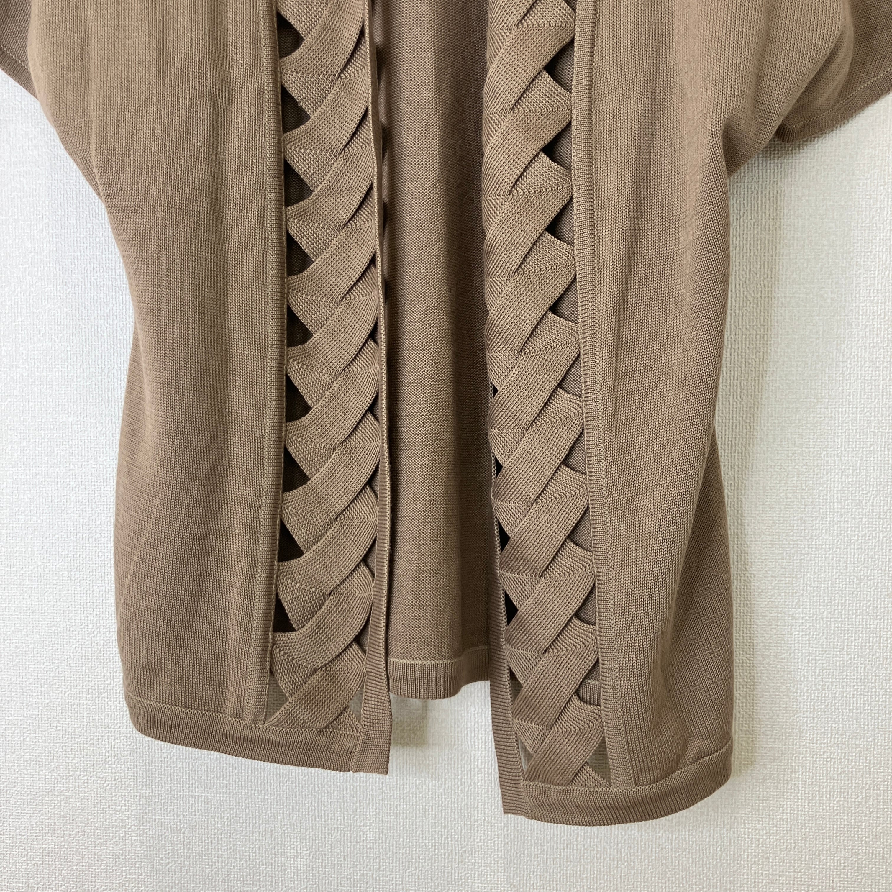 カーディガン: 半袖のボレロ/カーディガンで、前身頃に大胆な**編み込みデザイン(ブレードデザイン)**が施されています。