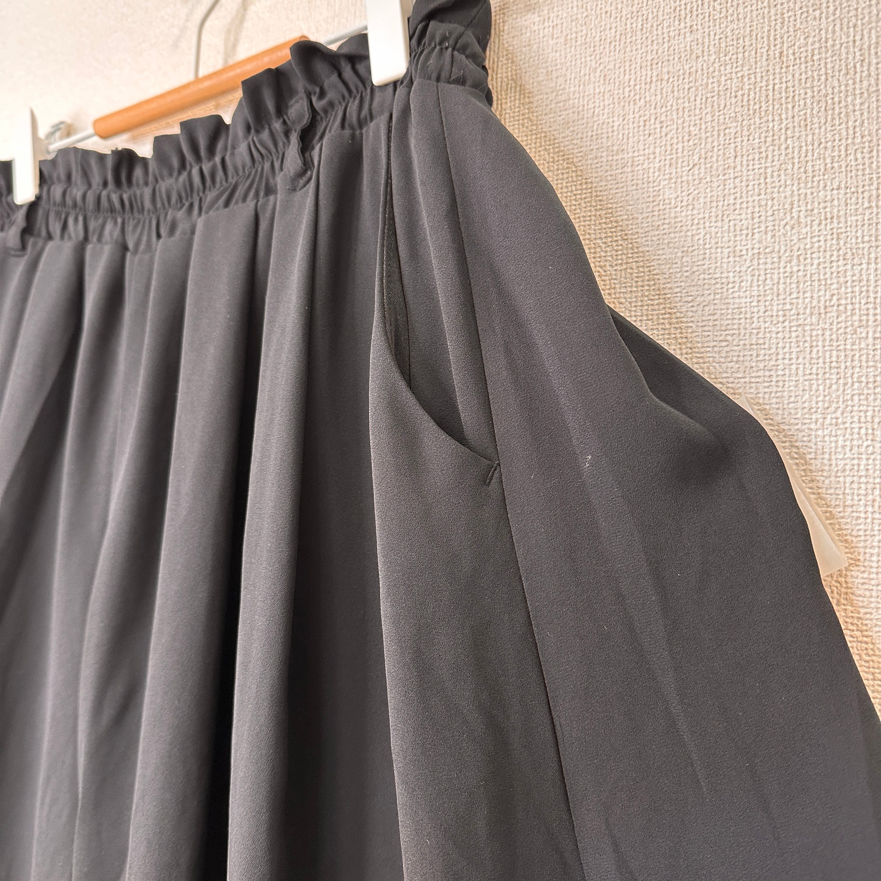 軽量素材の黒いワイドパンツ、ウエストゴムで快適な着用感。