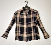 ブラック、カーキ、ベージュの落ち着いた色合いのチェック柄で、生地全体に細かなプリーツ加工が施されているのが特徴です。