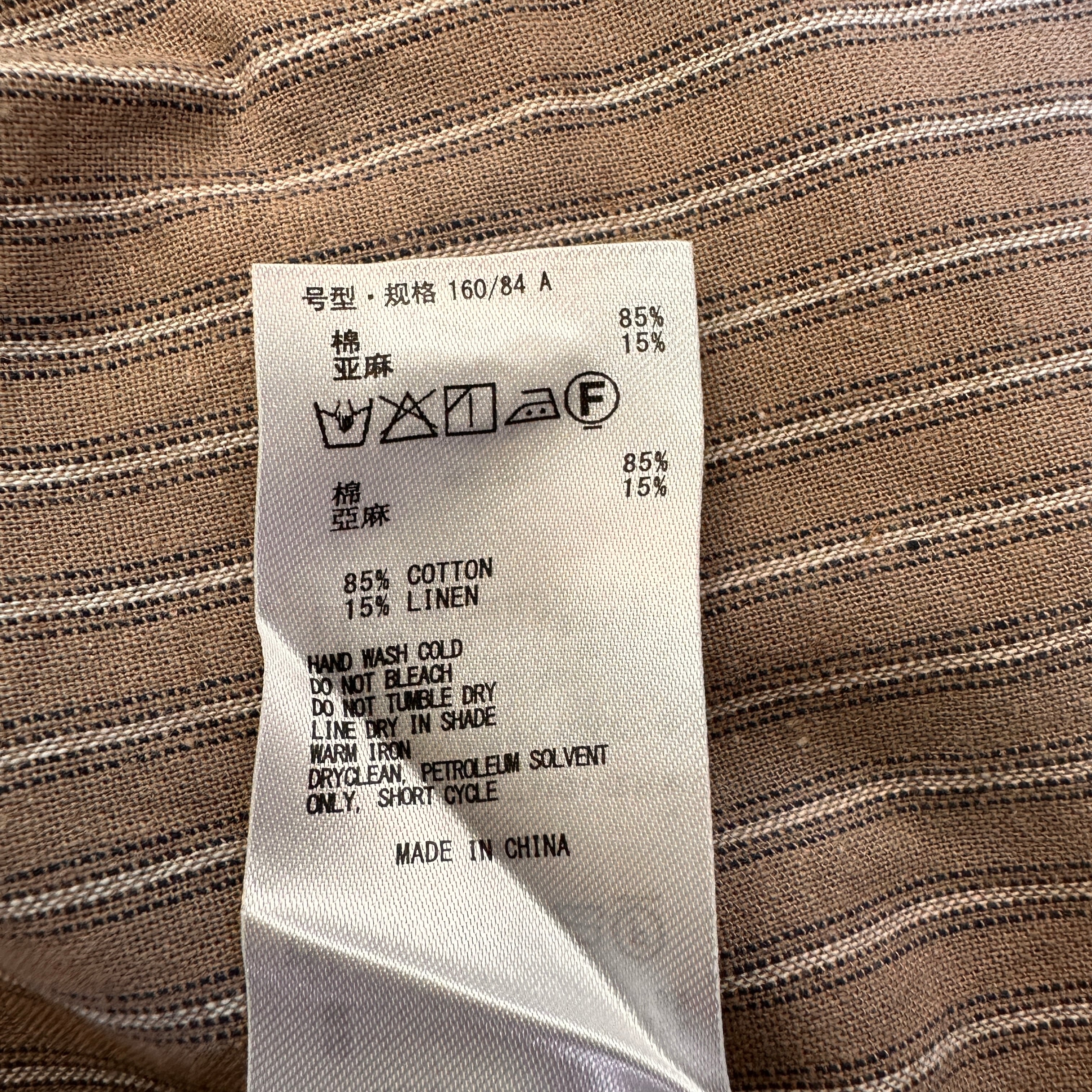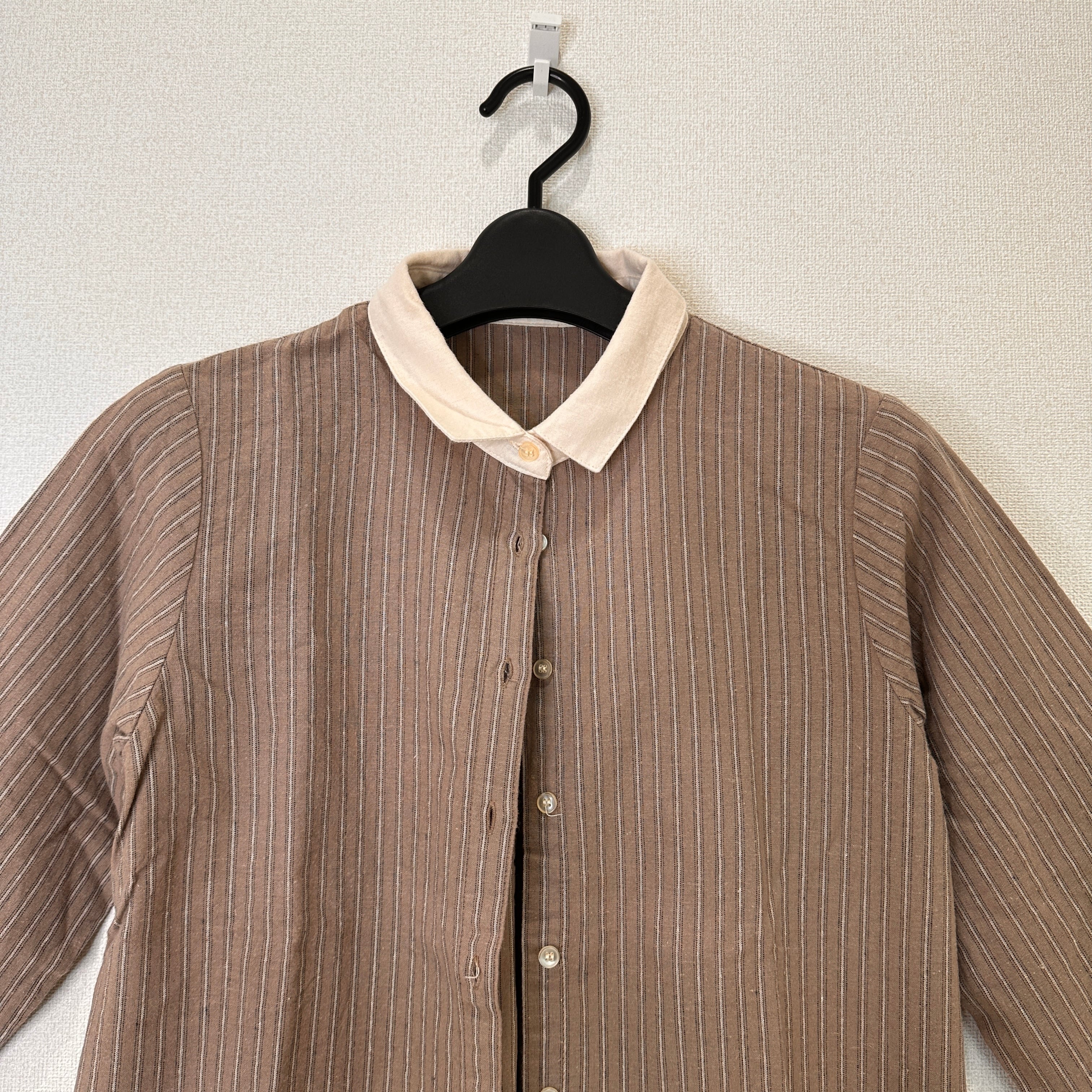 ブラウン系のストライプ柄に、襟と袖口がオフホワイト(またはアイボリー)の配色で切り替えられたデザインがポイントです。