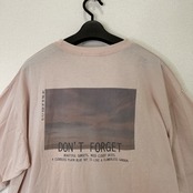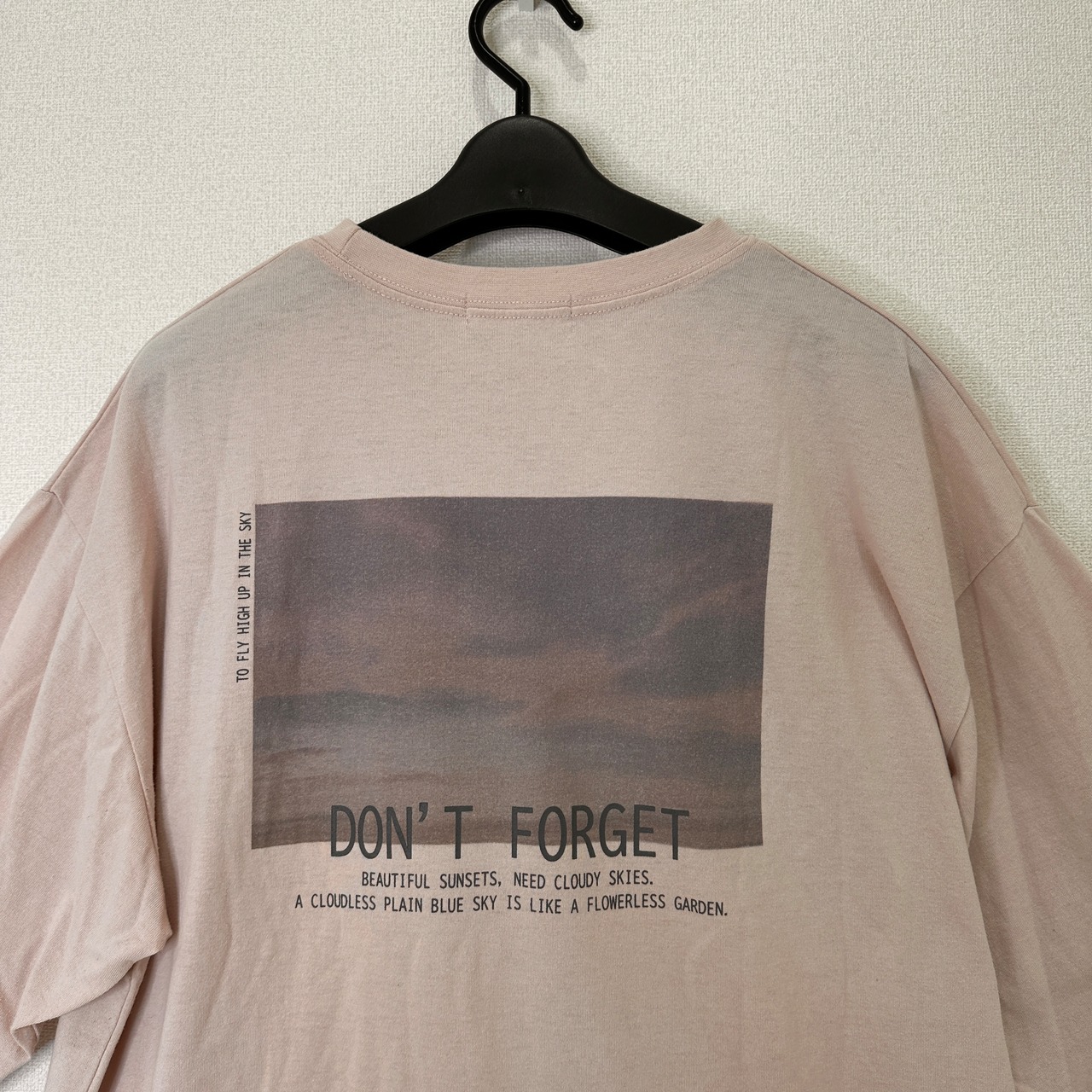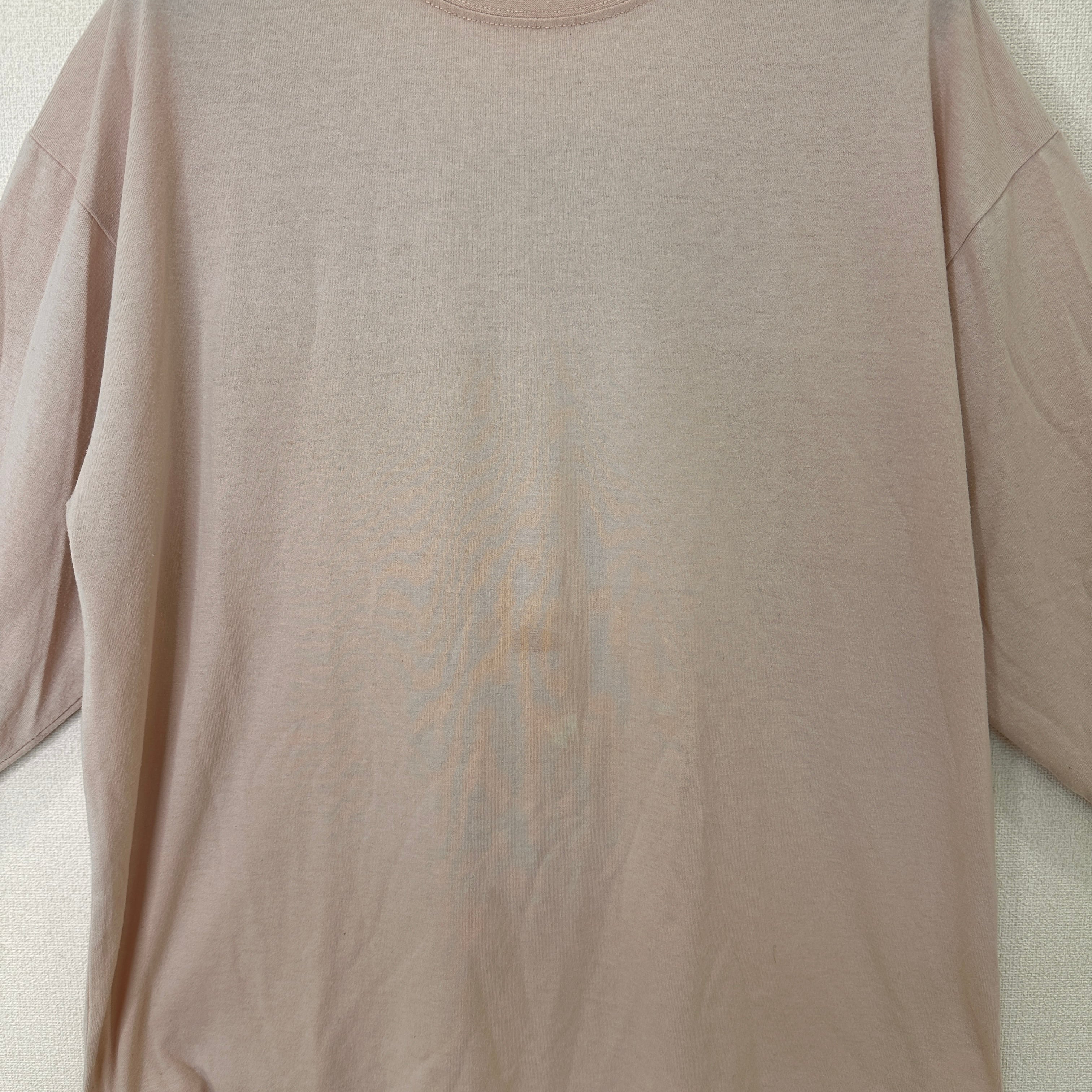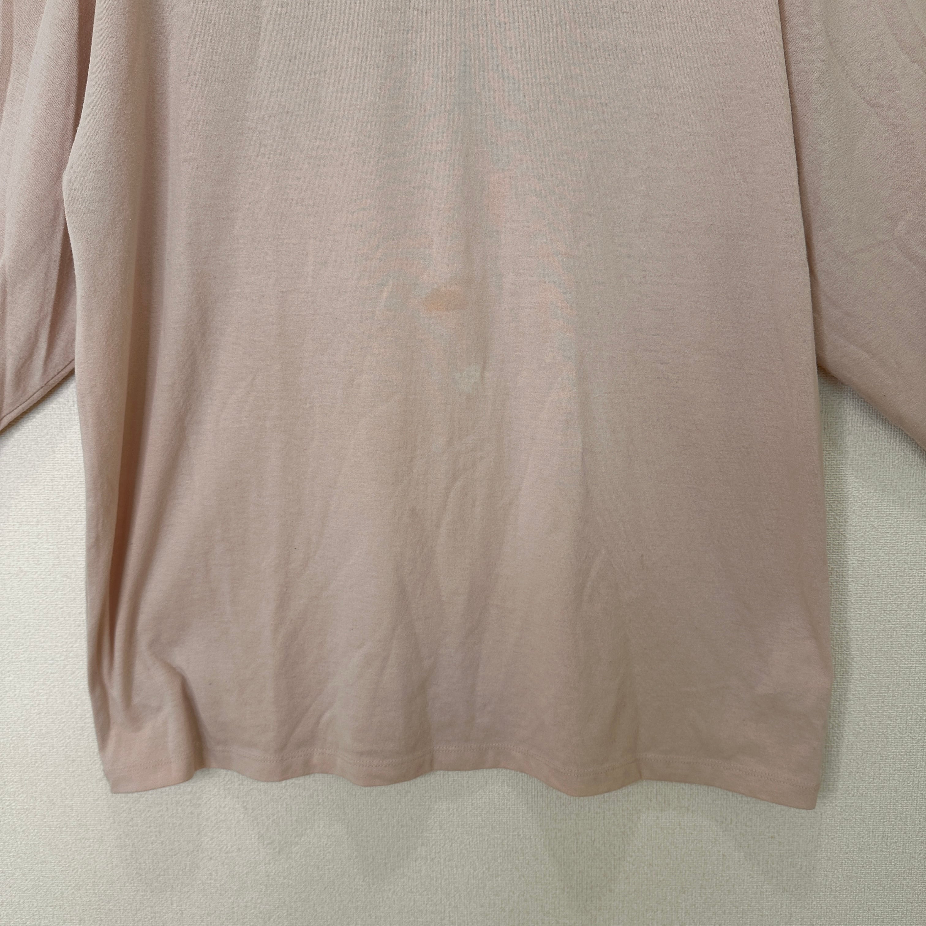 表面に微細なシミがある点、中古品にご理解いただける方のみご購入をお願いいたします。バックプリントが特徴的なピンクの長袖Tシャツ。