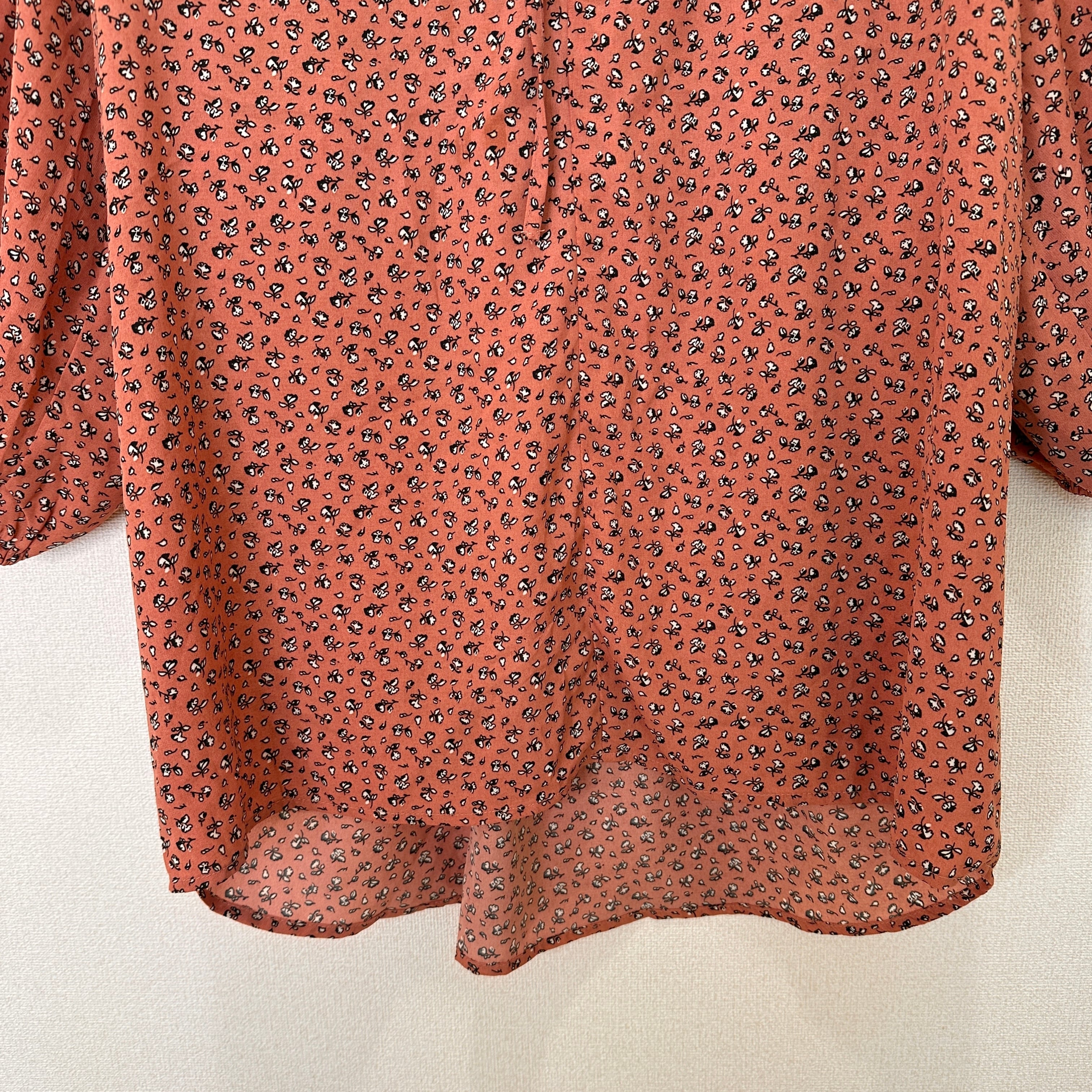 目立った傷や汚れはありませんが、中古品にご理解いただける方のみご購入をお願いいたします。オレンジの花柄デザインで、フリルネックの五分袖シャツ。