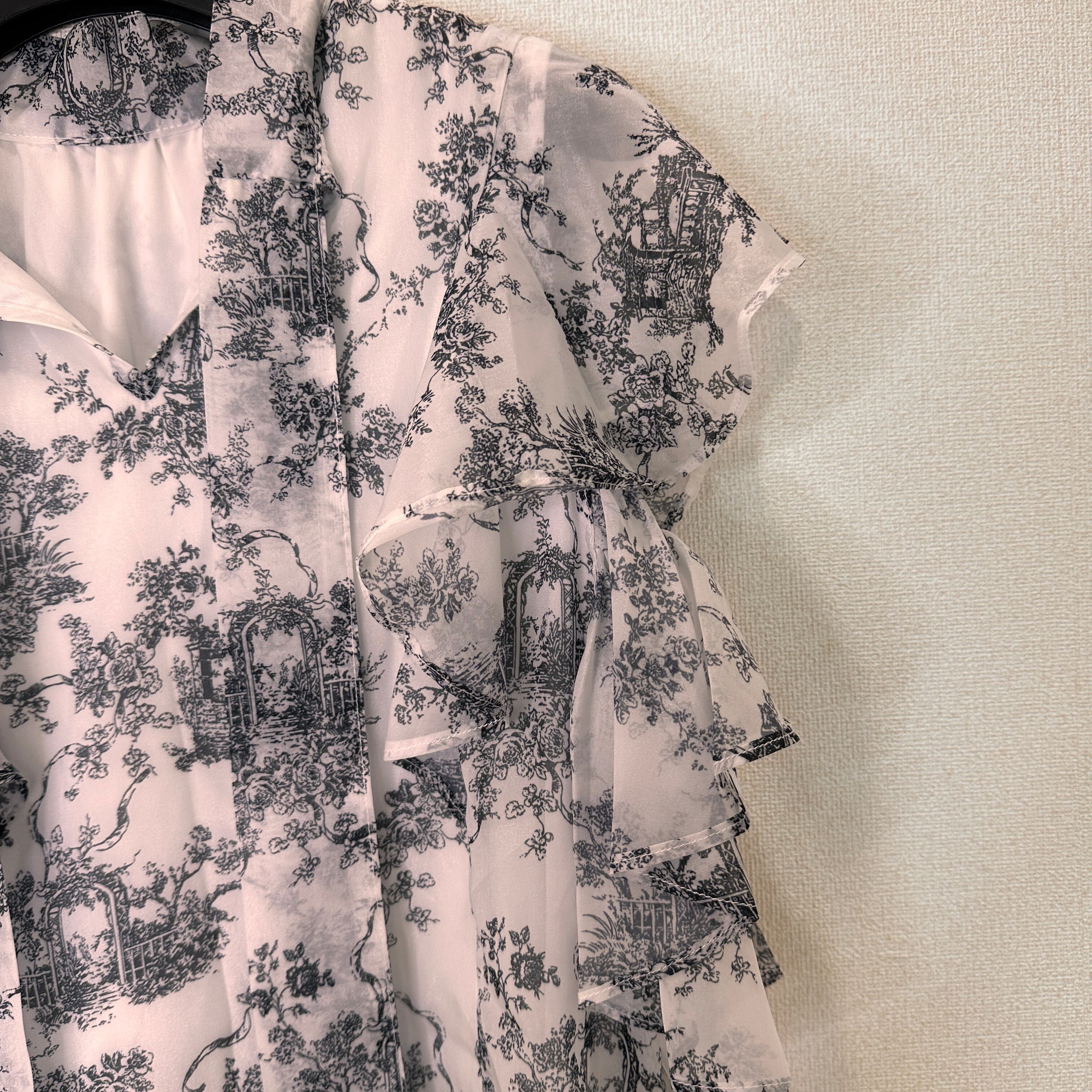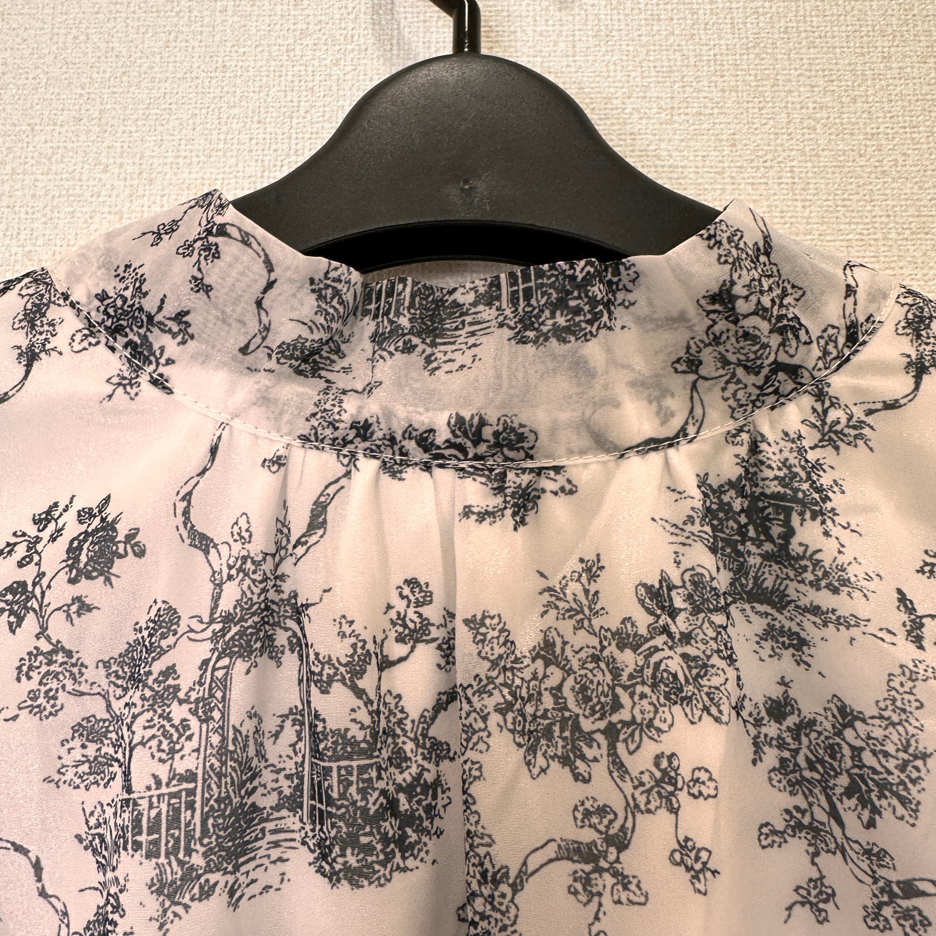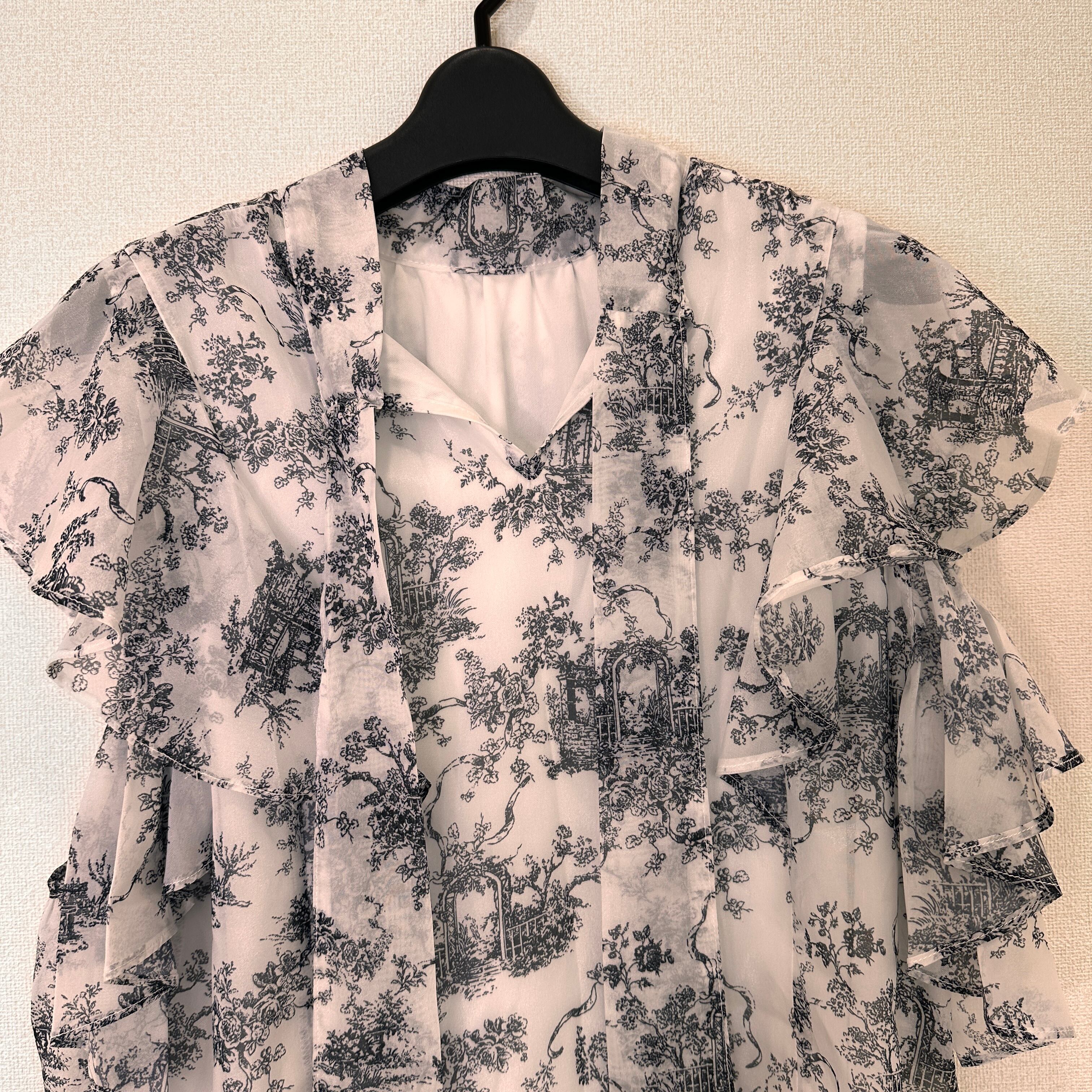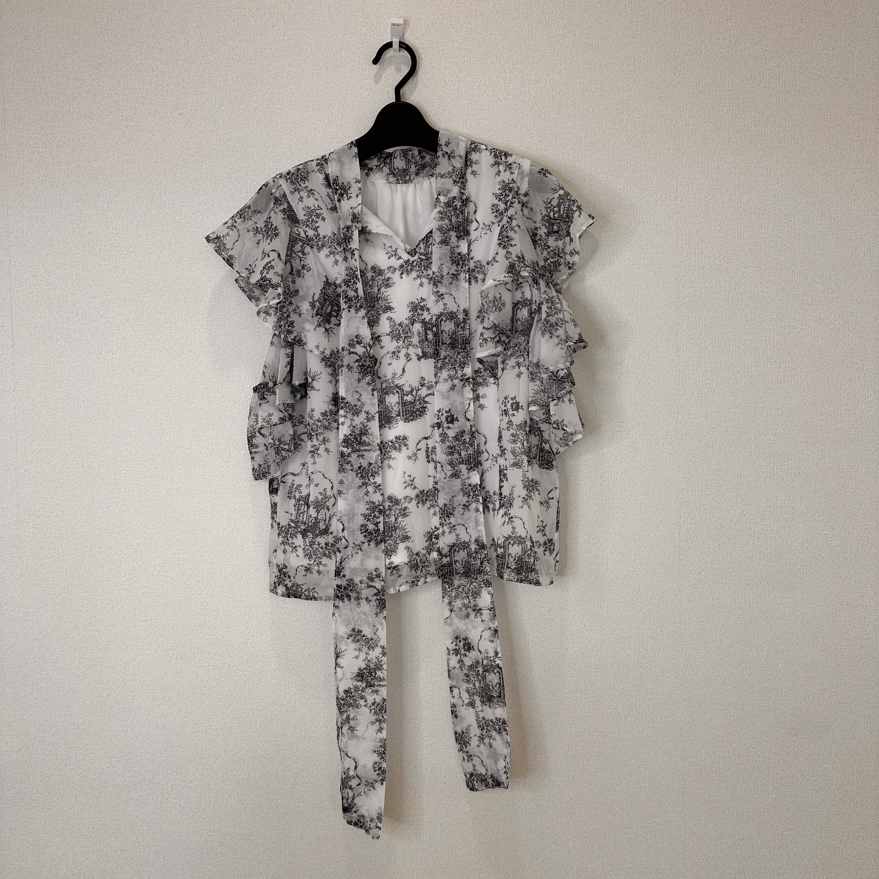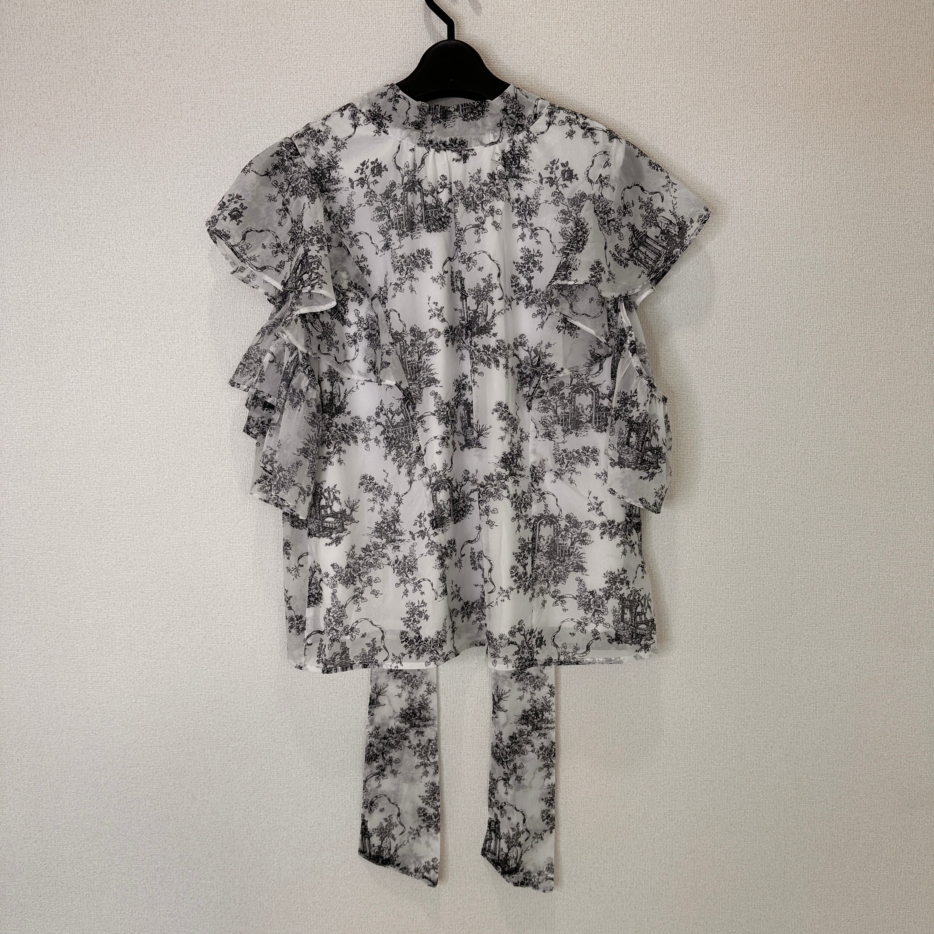 モノトーンの総柄(トワル・ド・ジュイのような柄)が上品な、フリル付きのブラウスです。