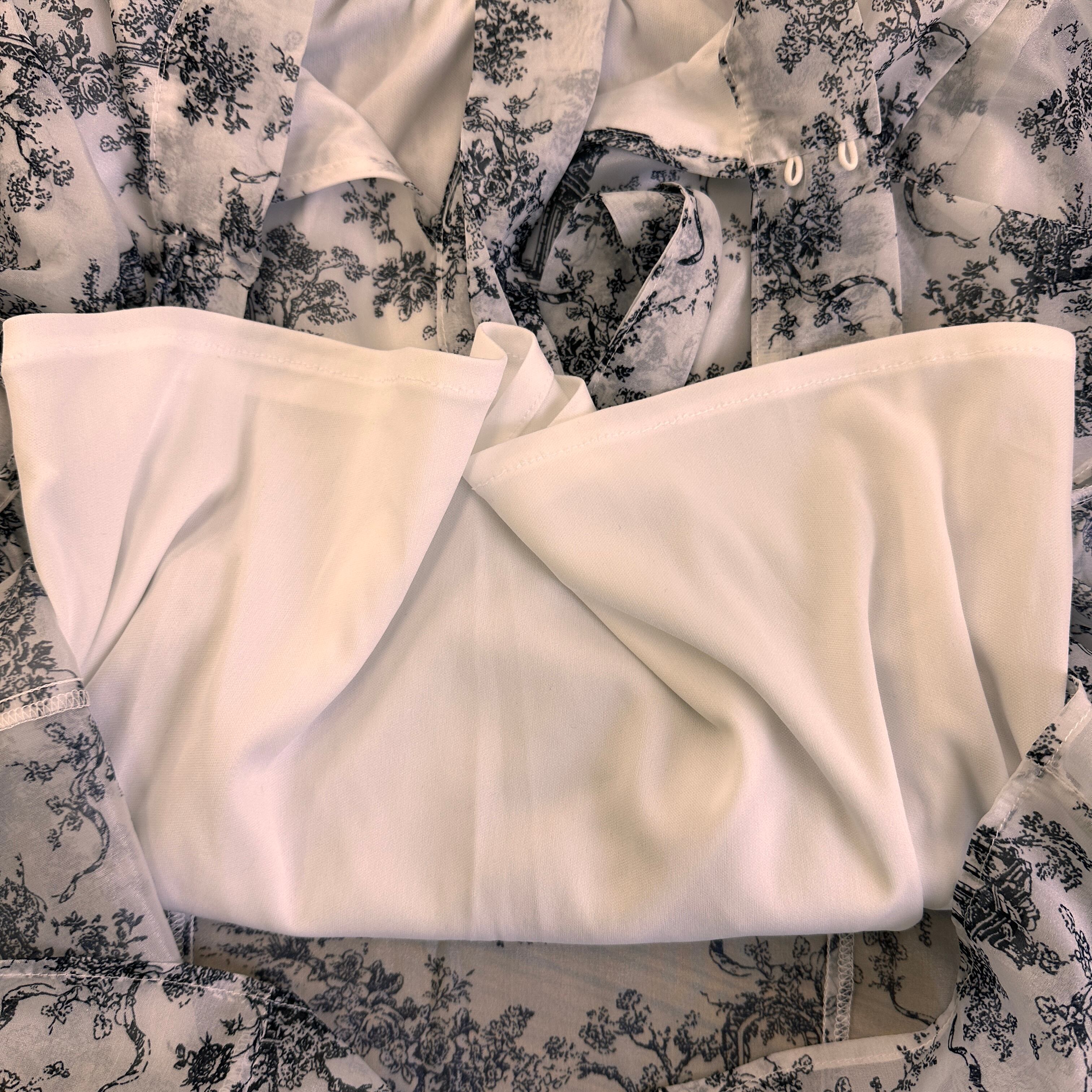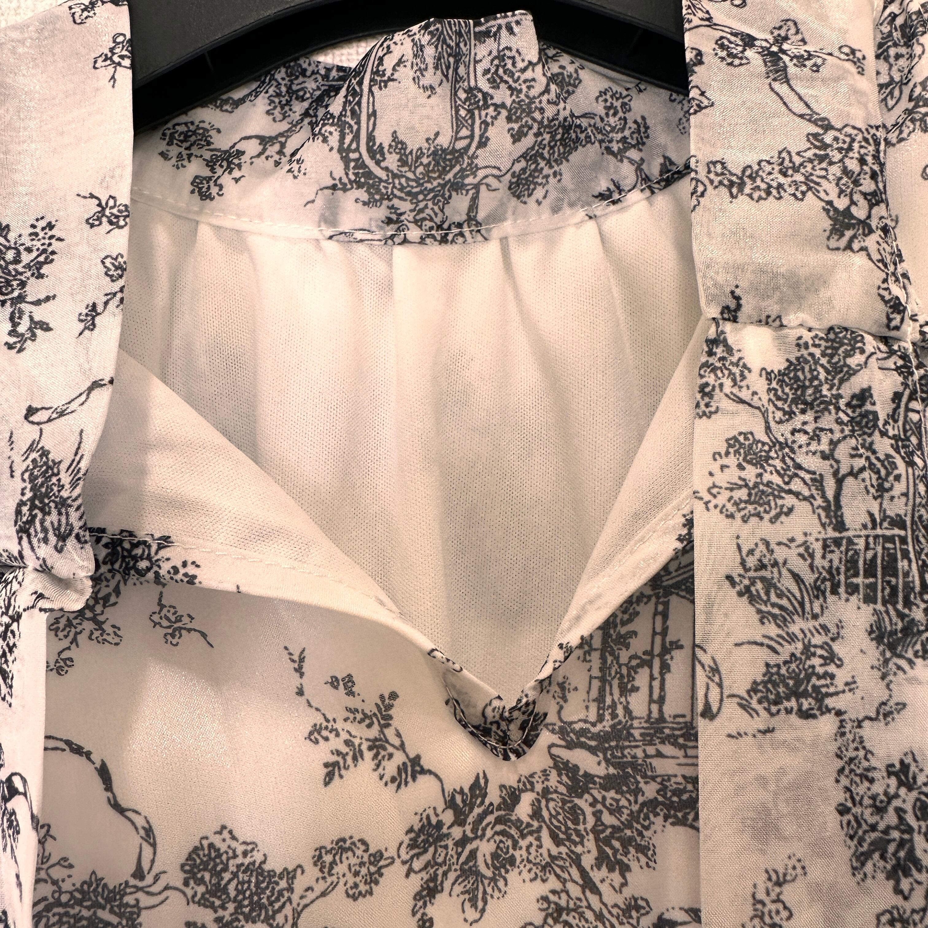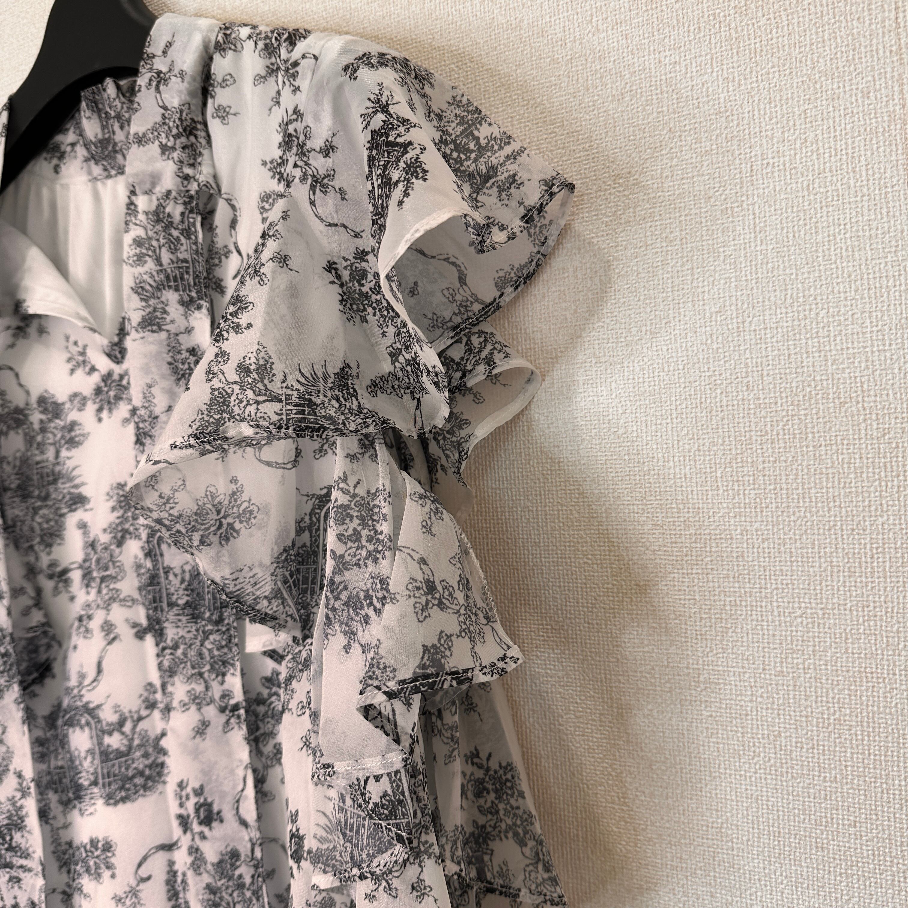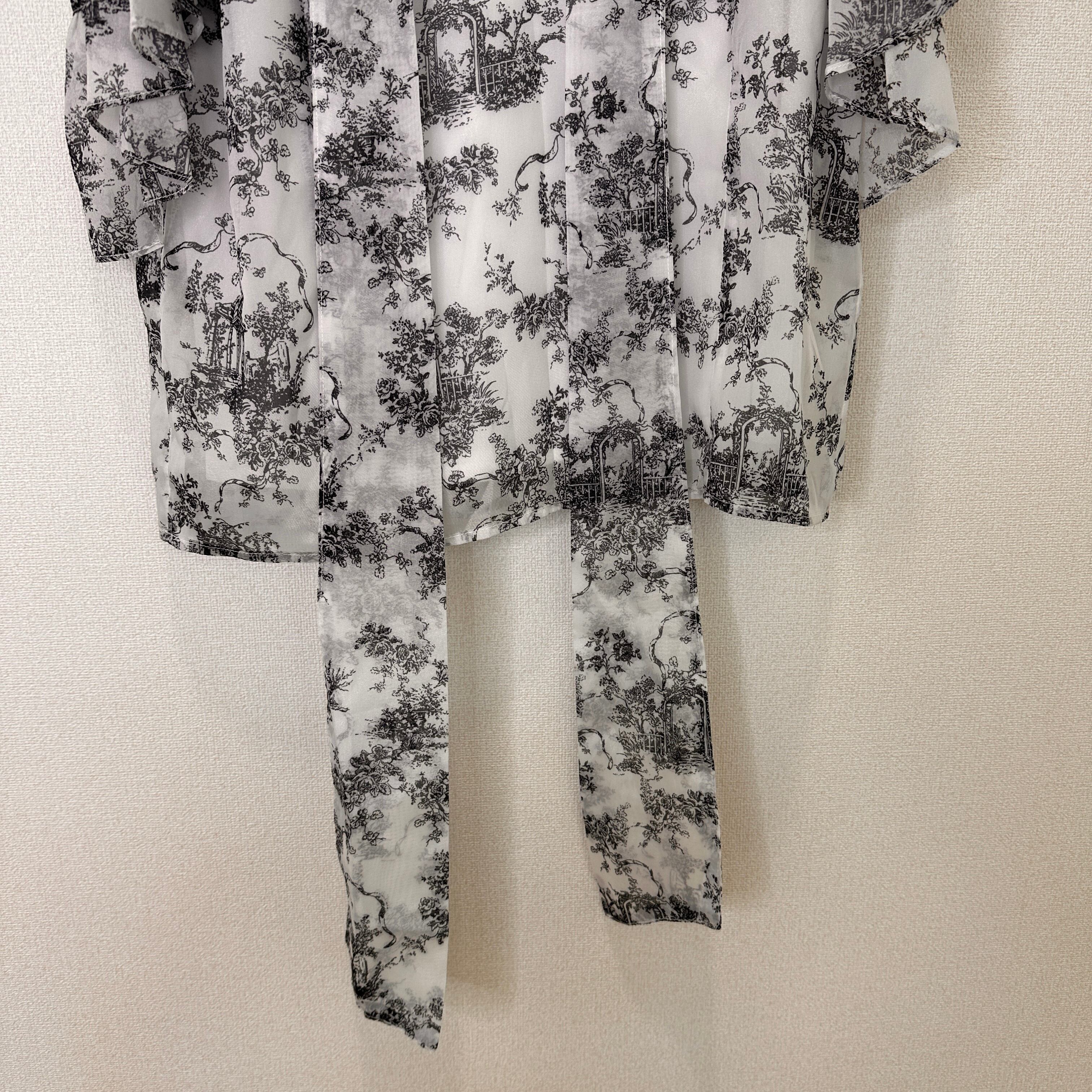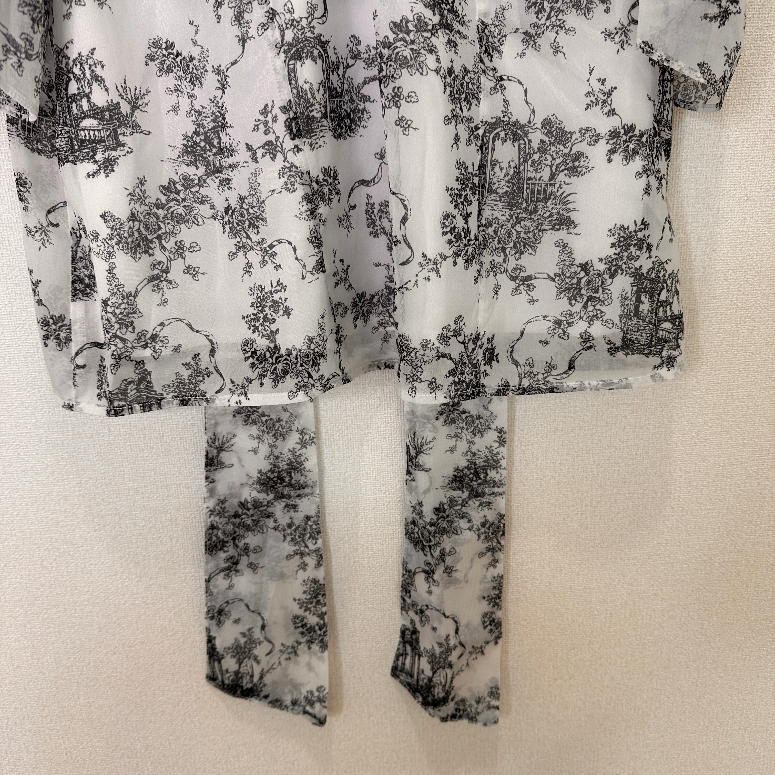 モノトーンの総柄(トワル・ド・ジュイのような柄)が上品な、フリル付きのブラウスです。