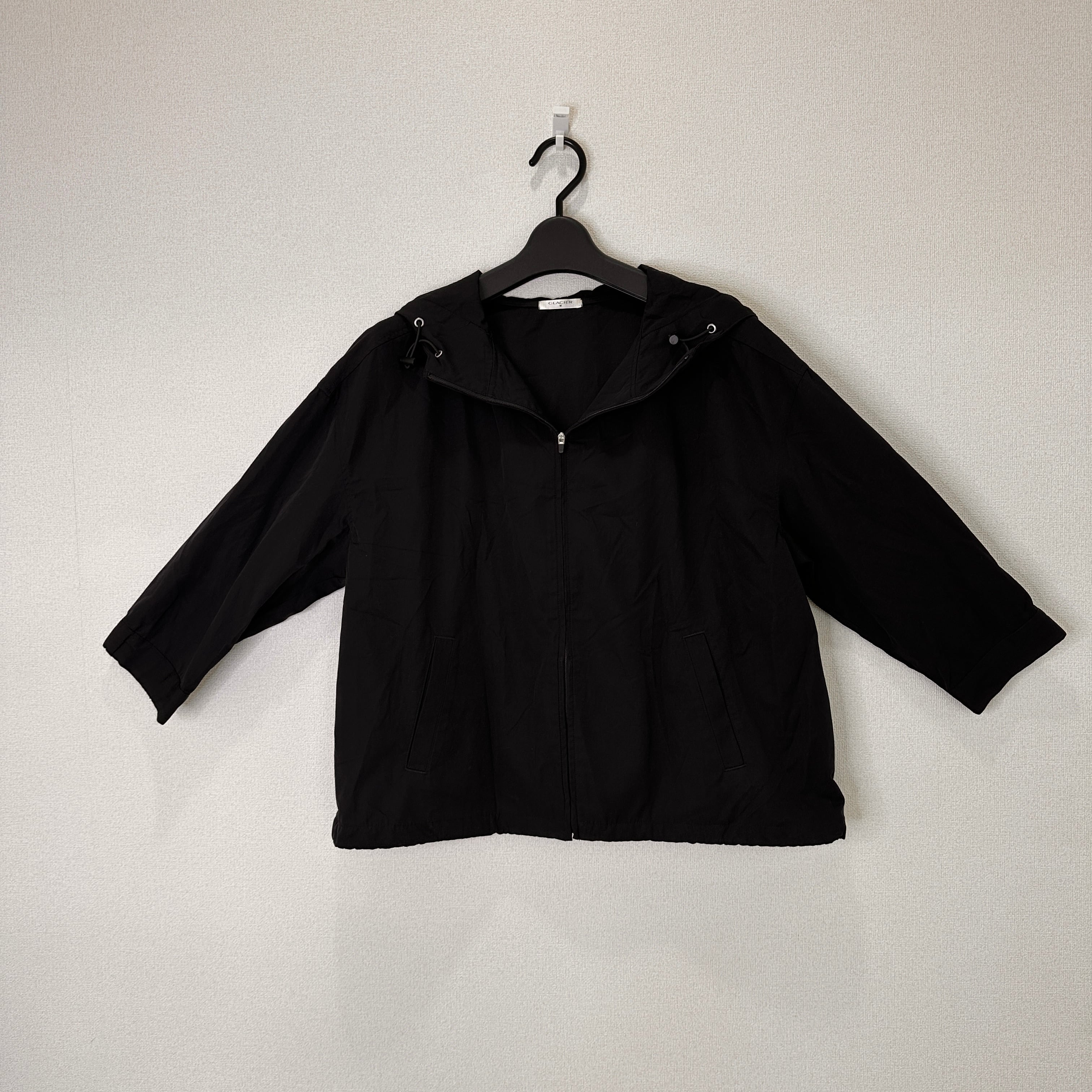 シンプルなデザインで着回ししやすい、ブラックのフーデッドブルゾン(ジップアップジャケット)です。