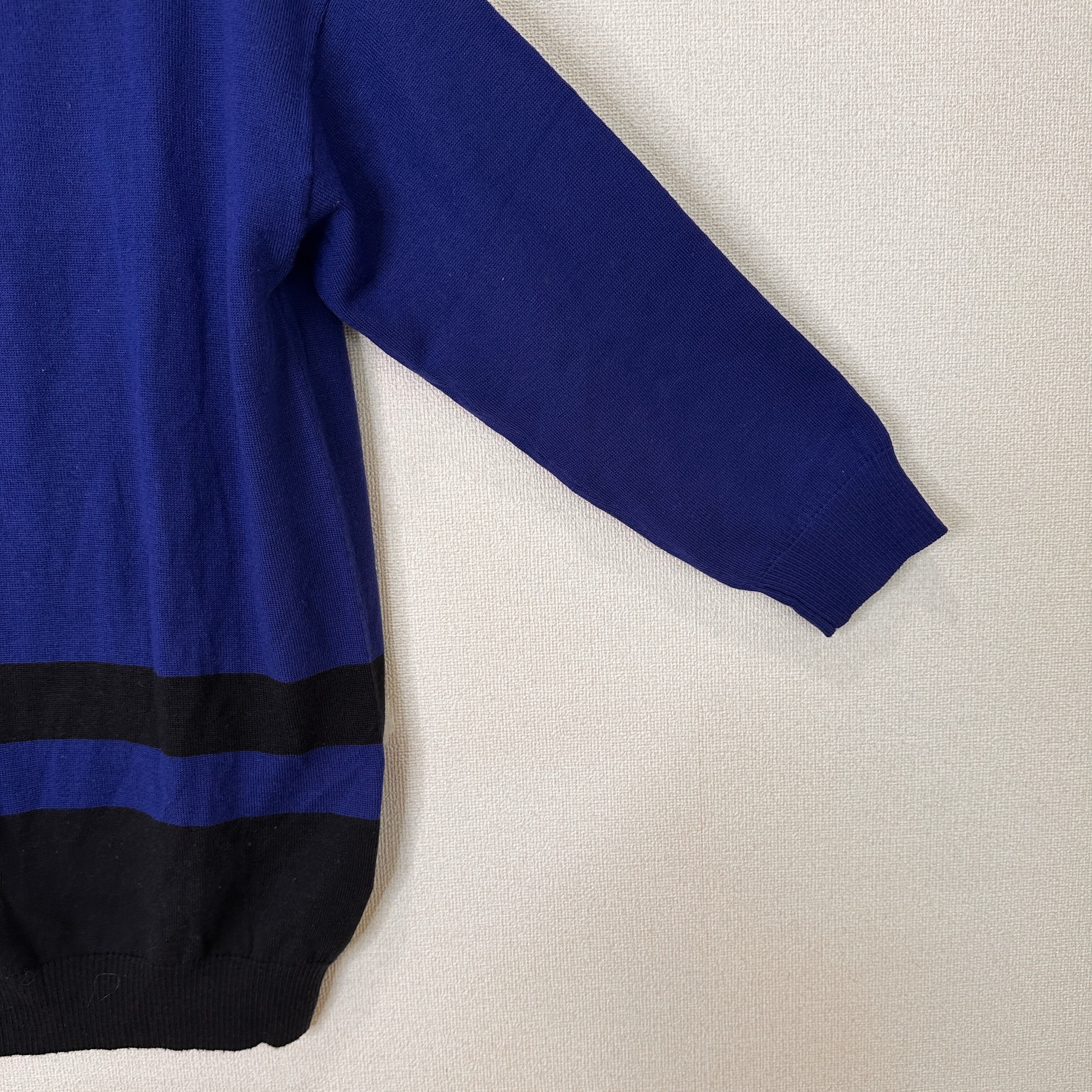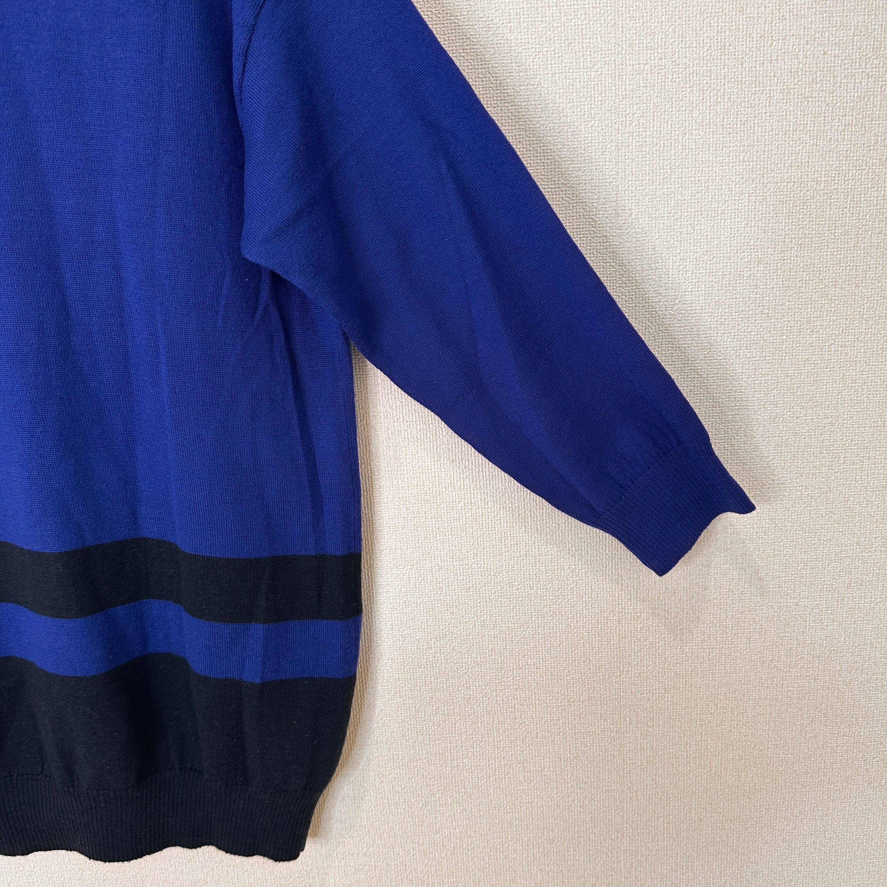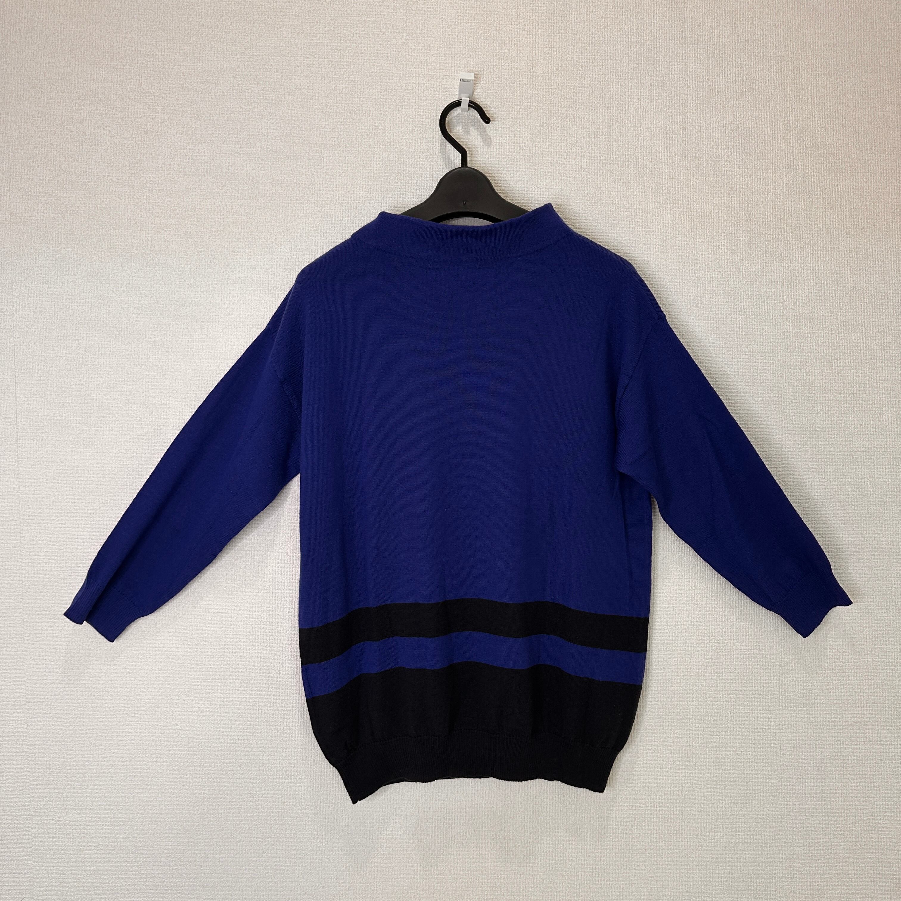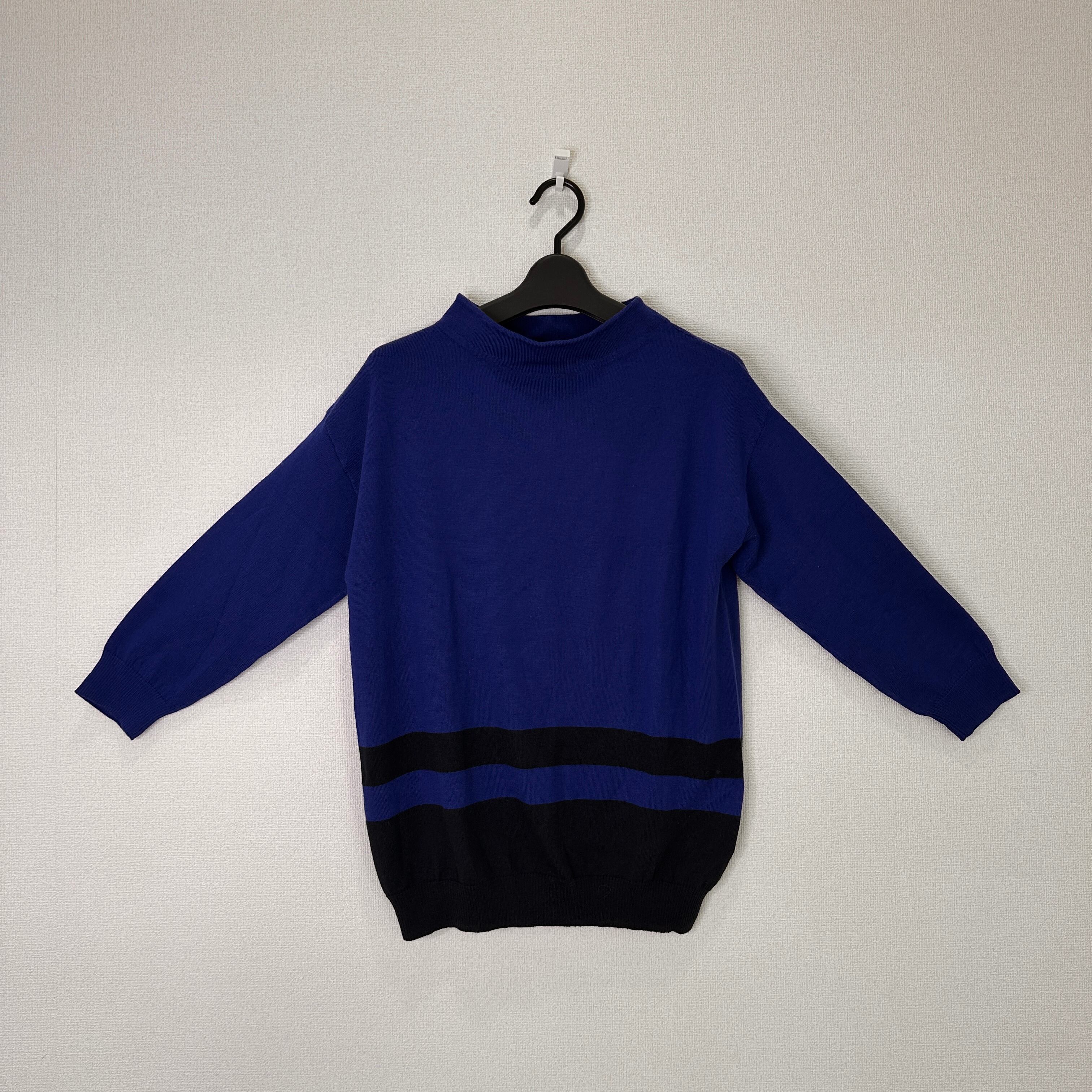 鮮やかなブルーとブラックの配色ボーダーがおしゃれな、モックネック(ハイネック)ニットプルオーバーです。