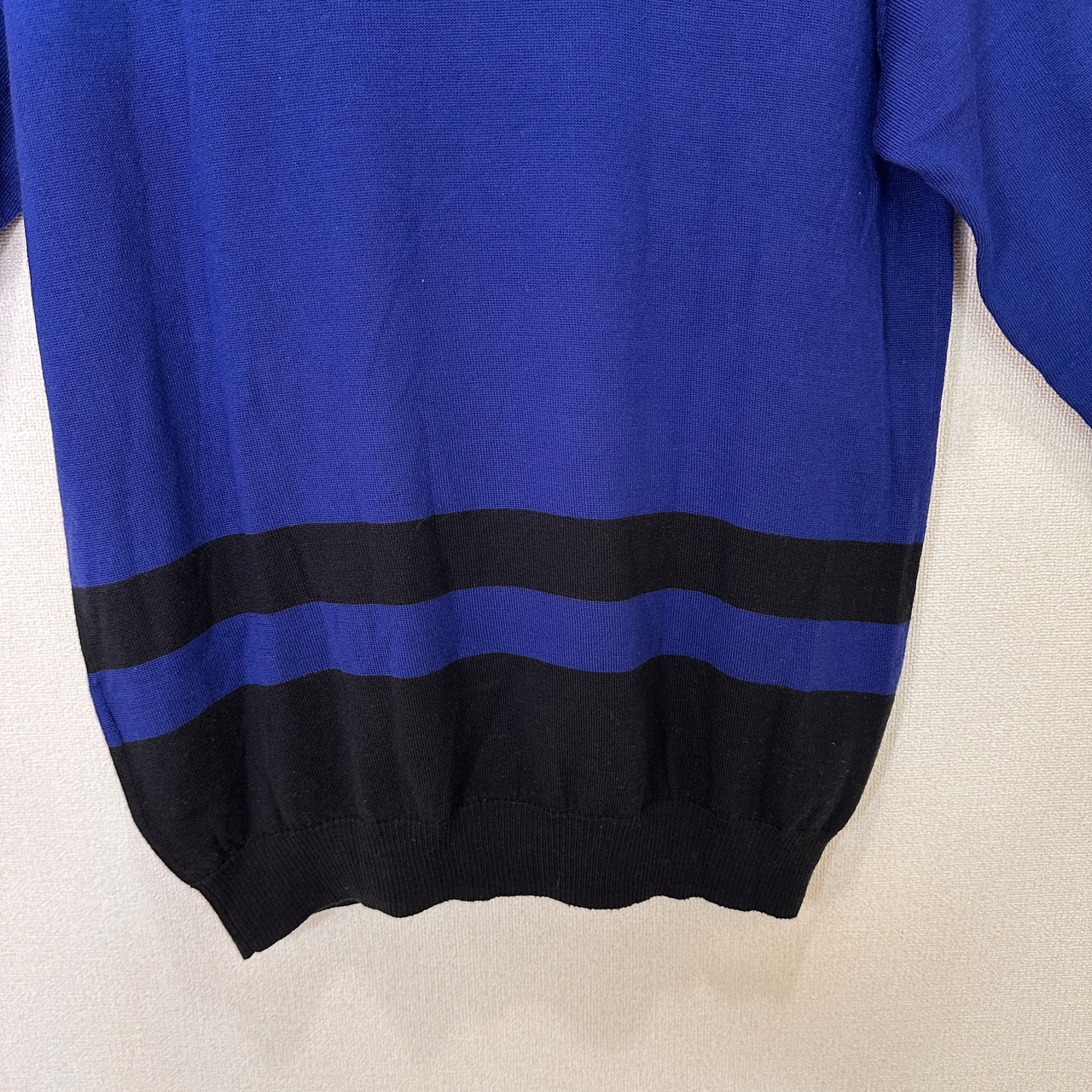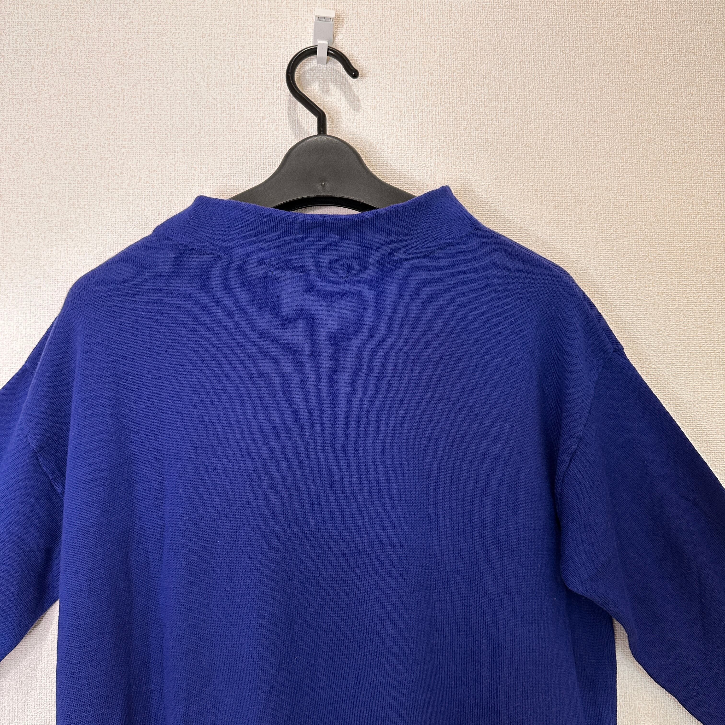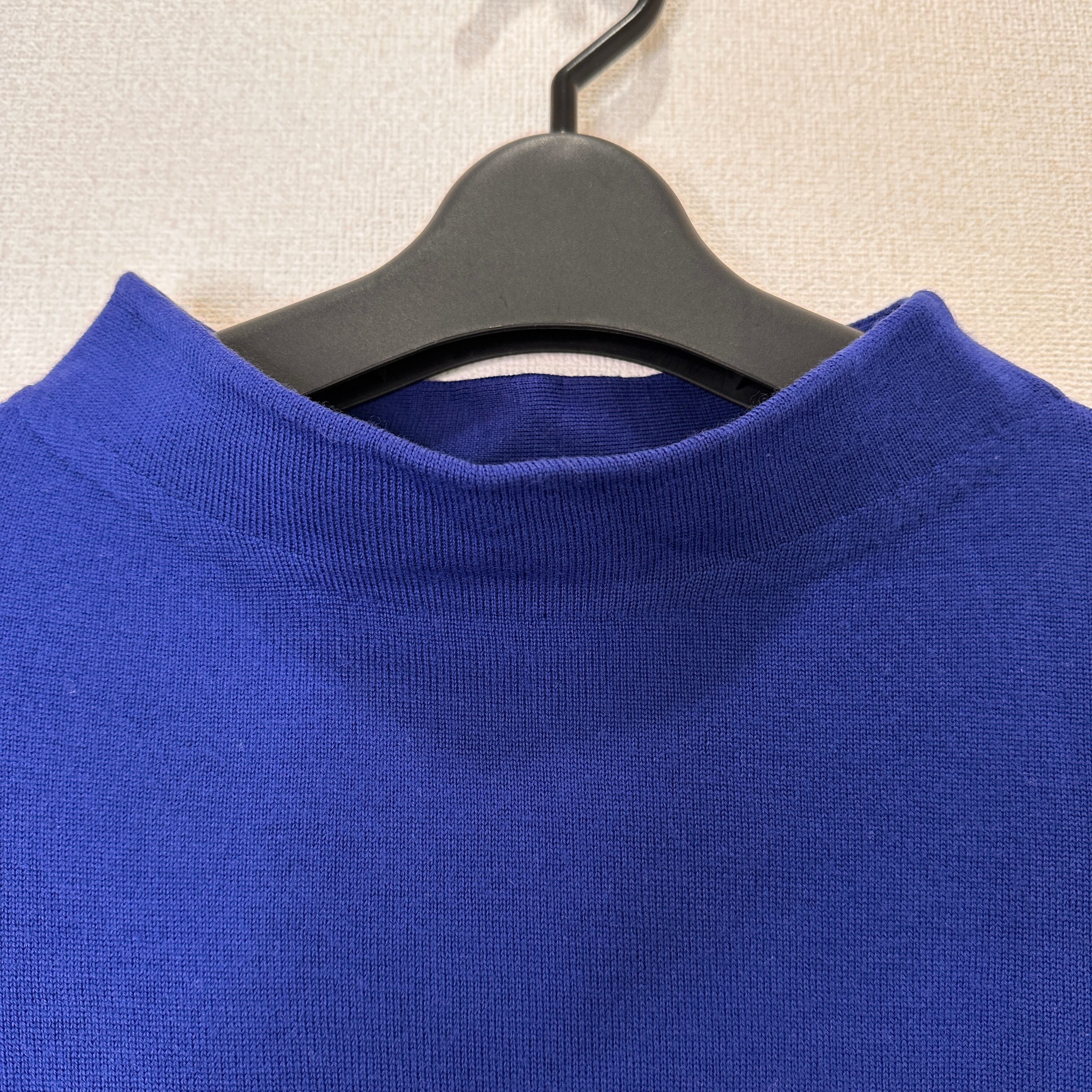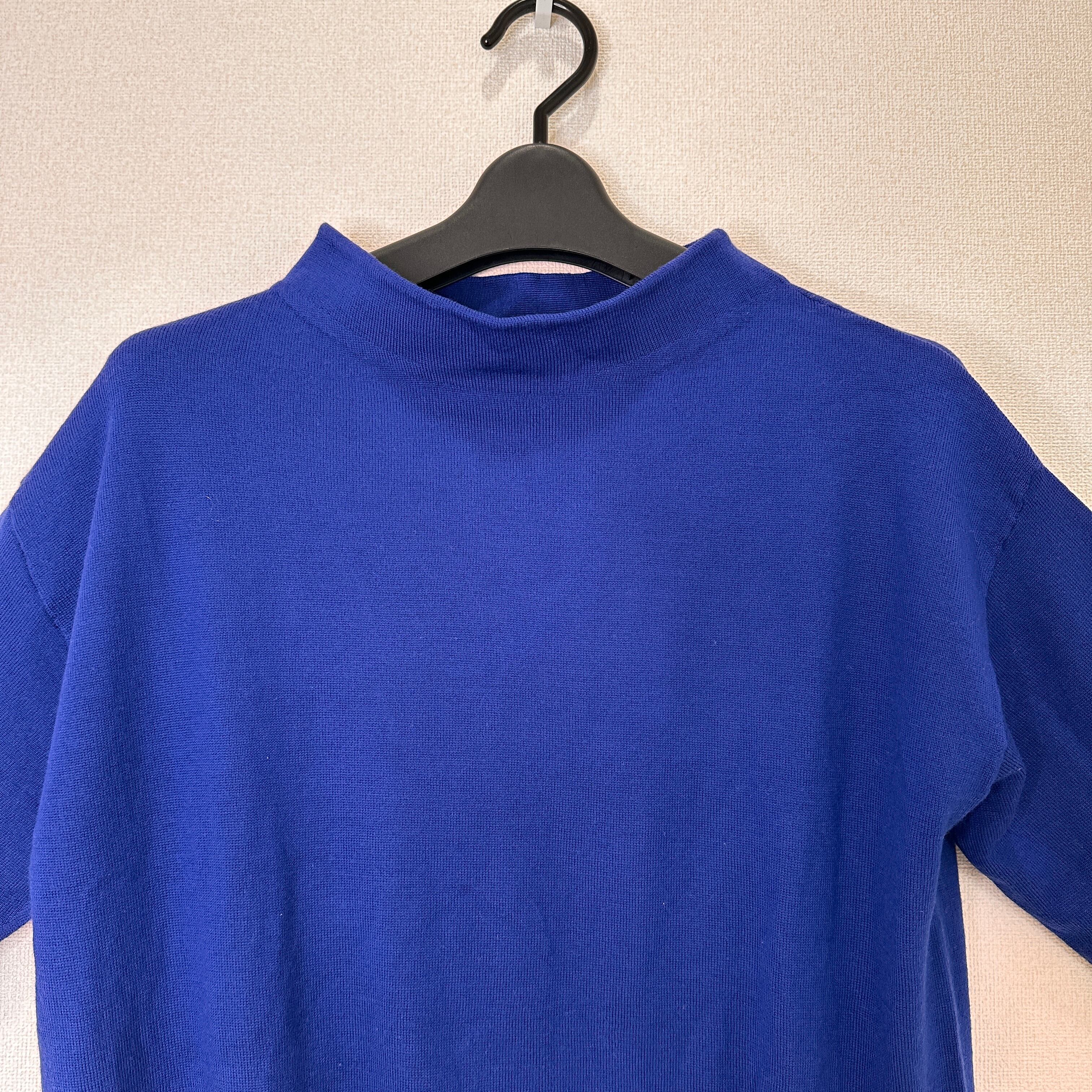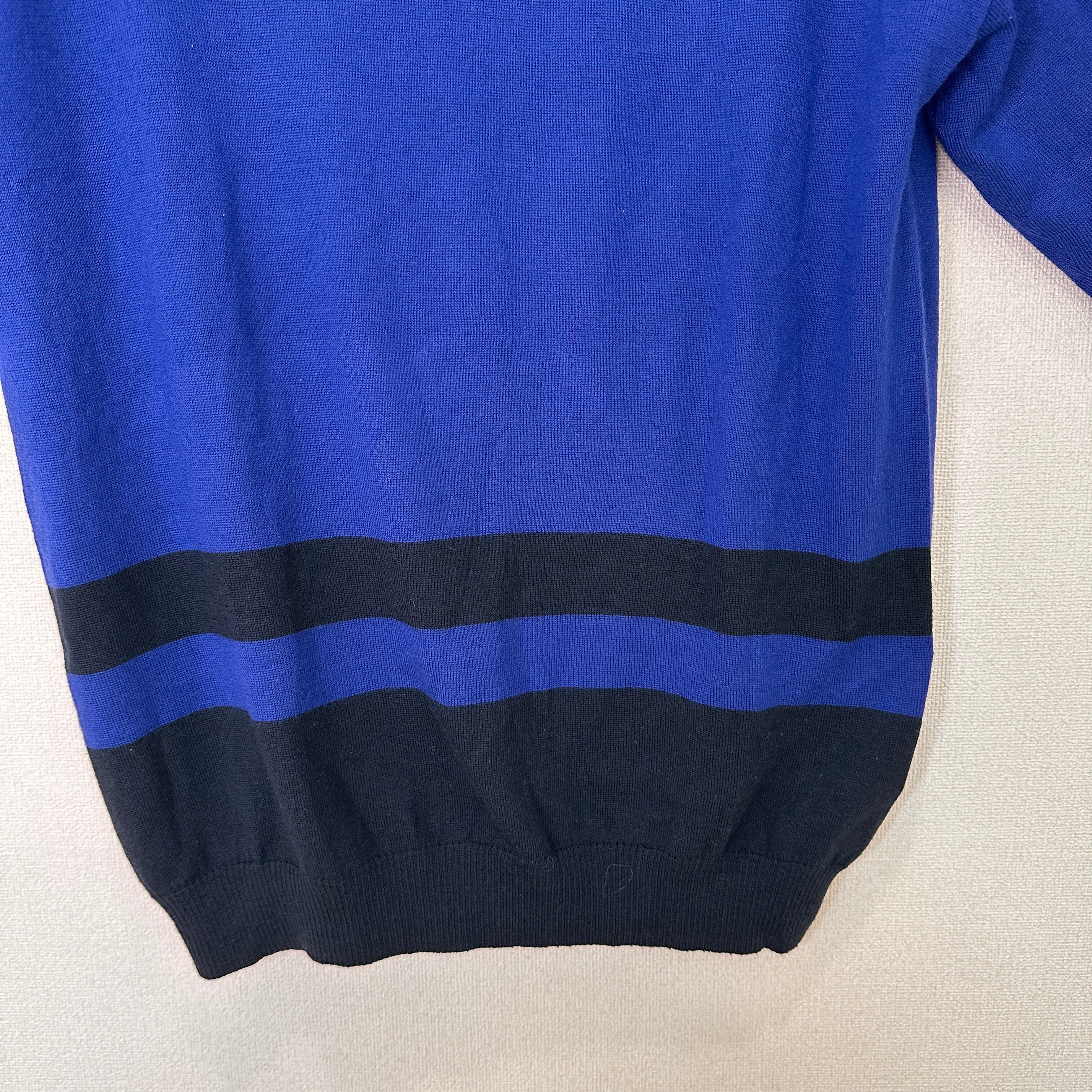 鮮やかなブルーとブラックの配色ボーダーがおしゃれな、モックネック(ハイネック)ニットプルオーバーです。