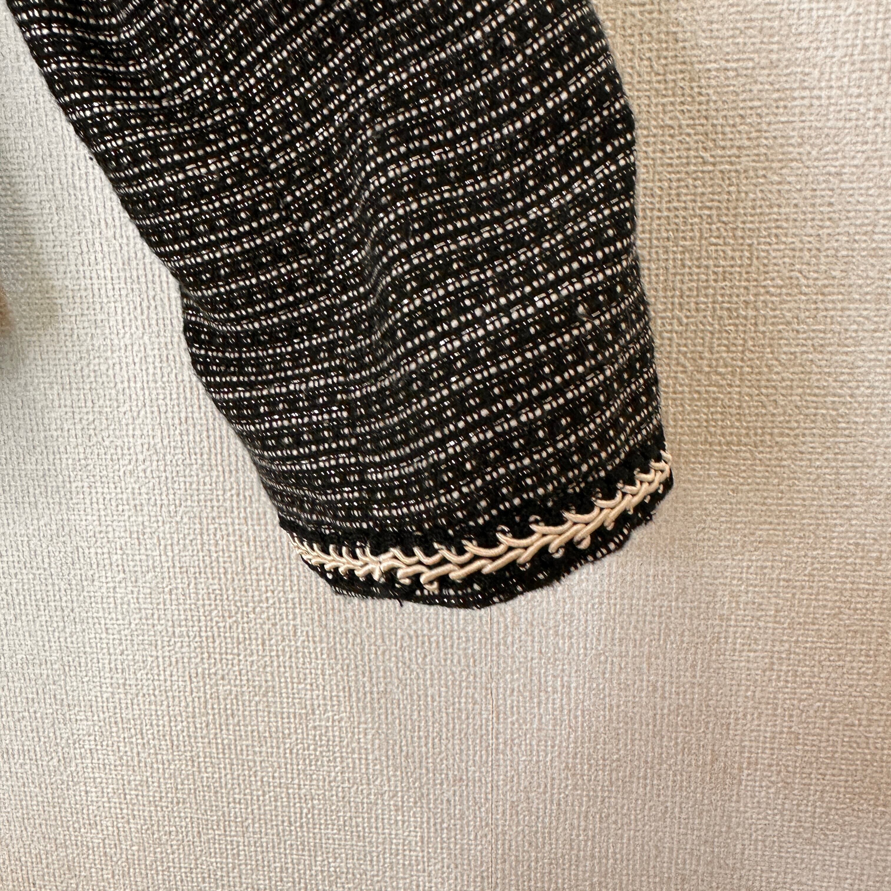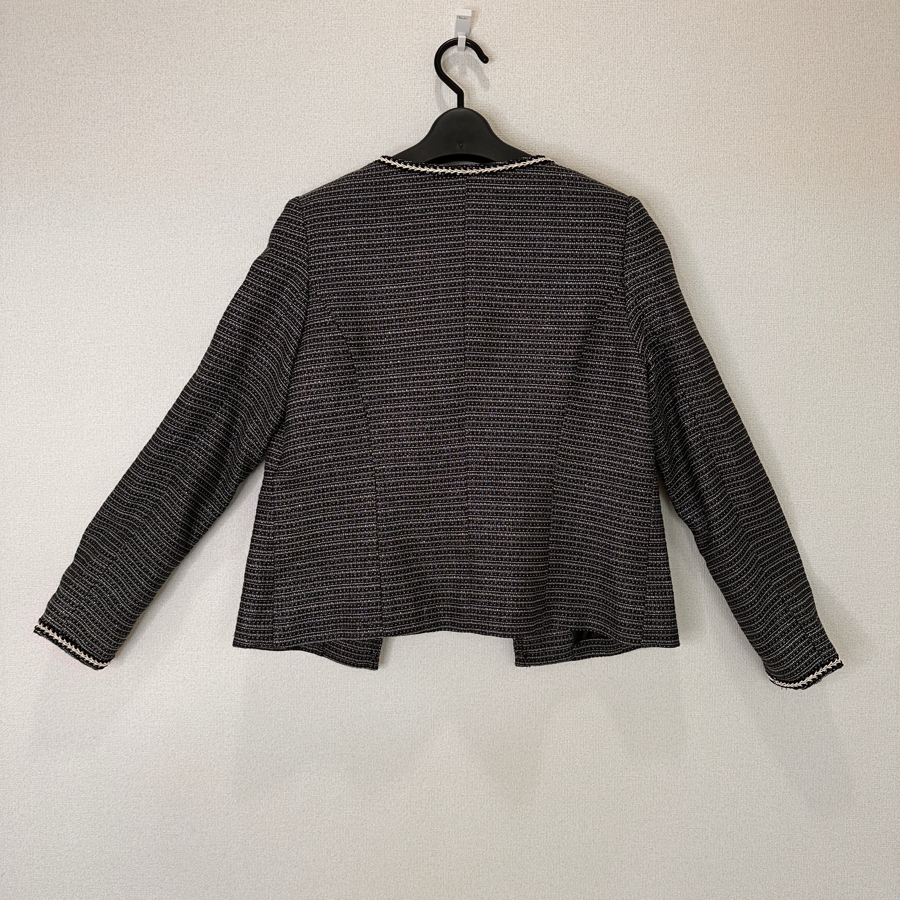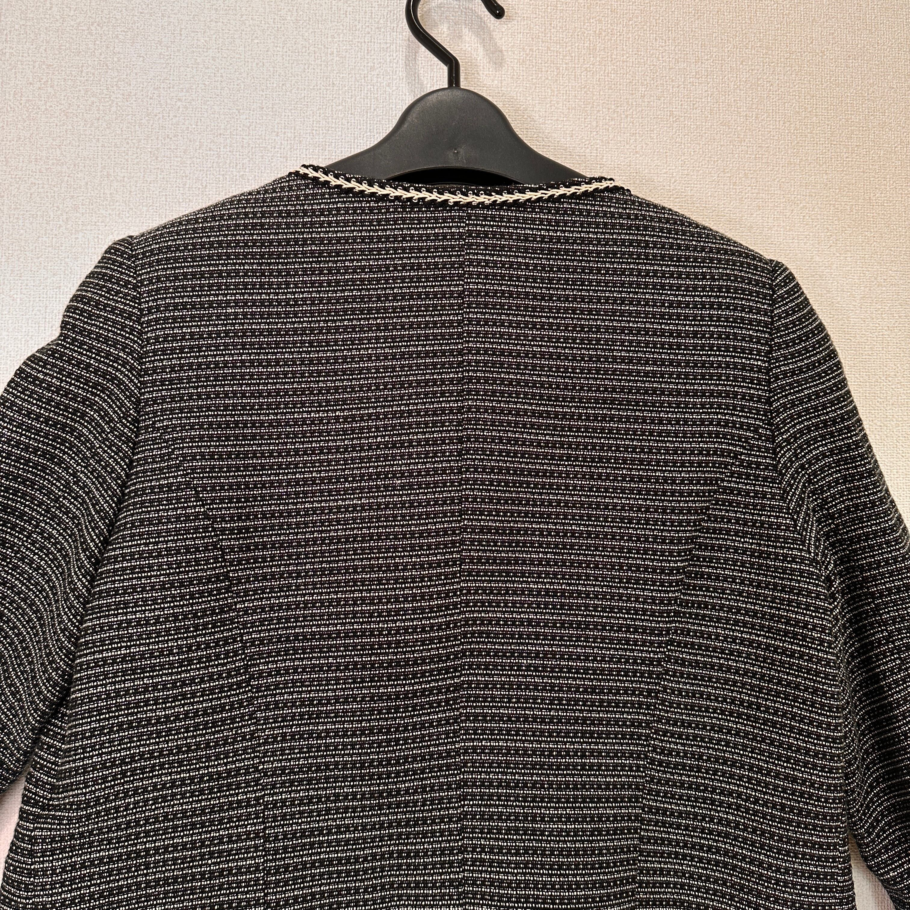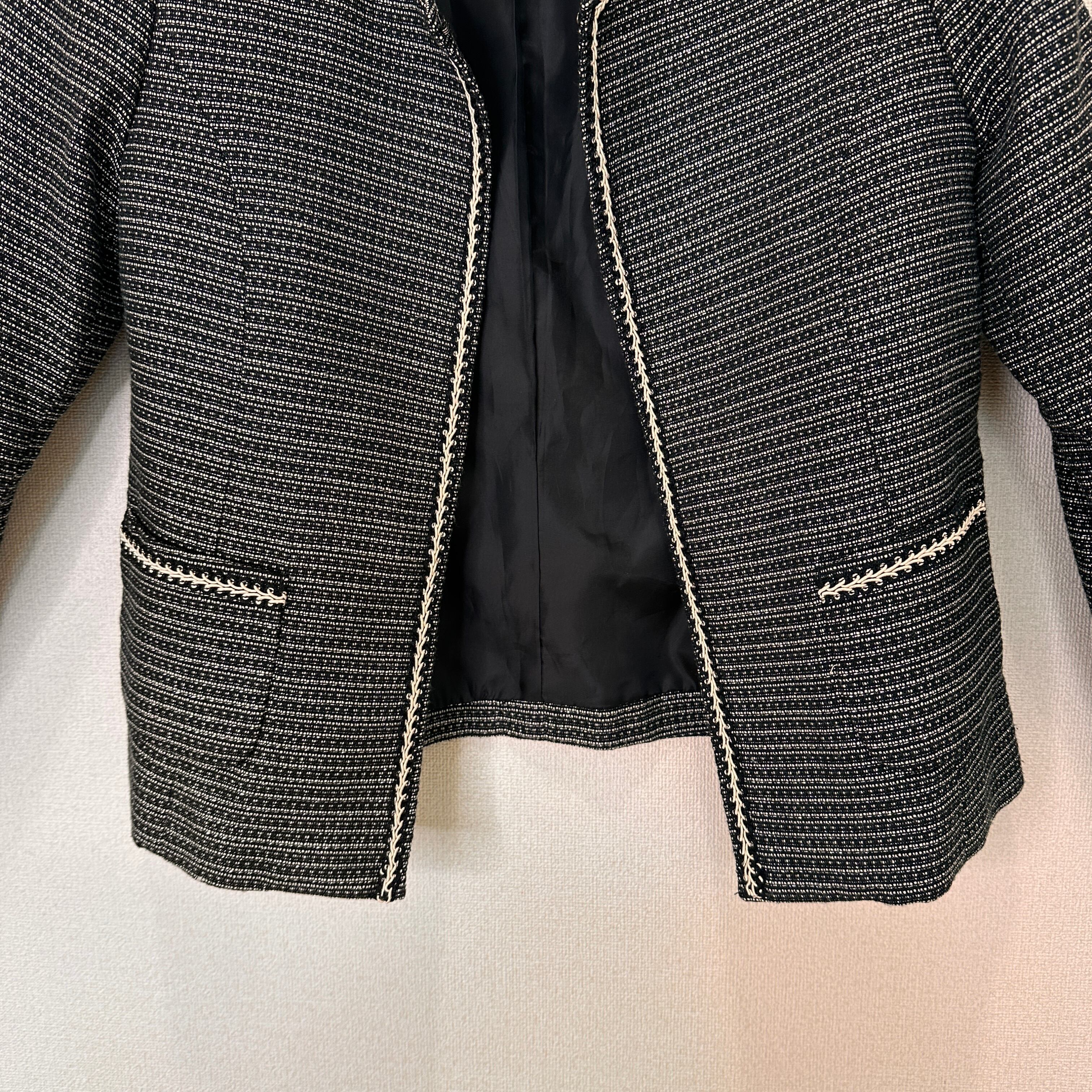 目立った傷や汚れはありませんが、中古品にご理解いただける方のみご購入をお願いいたします。ツイード風のブラック・ホワイトのノーカラージャケット、装飾的な縁取りが特徴。