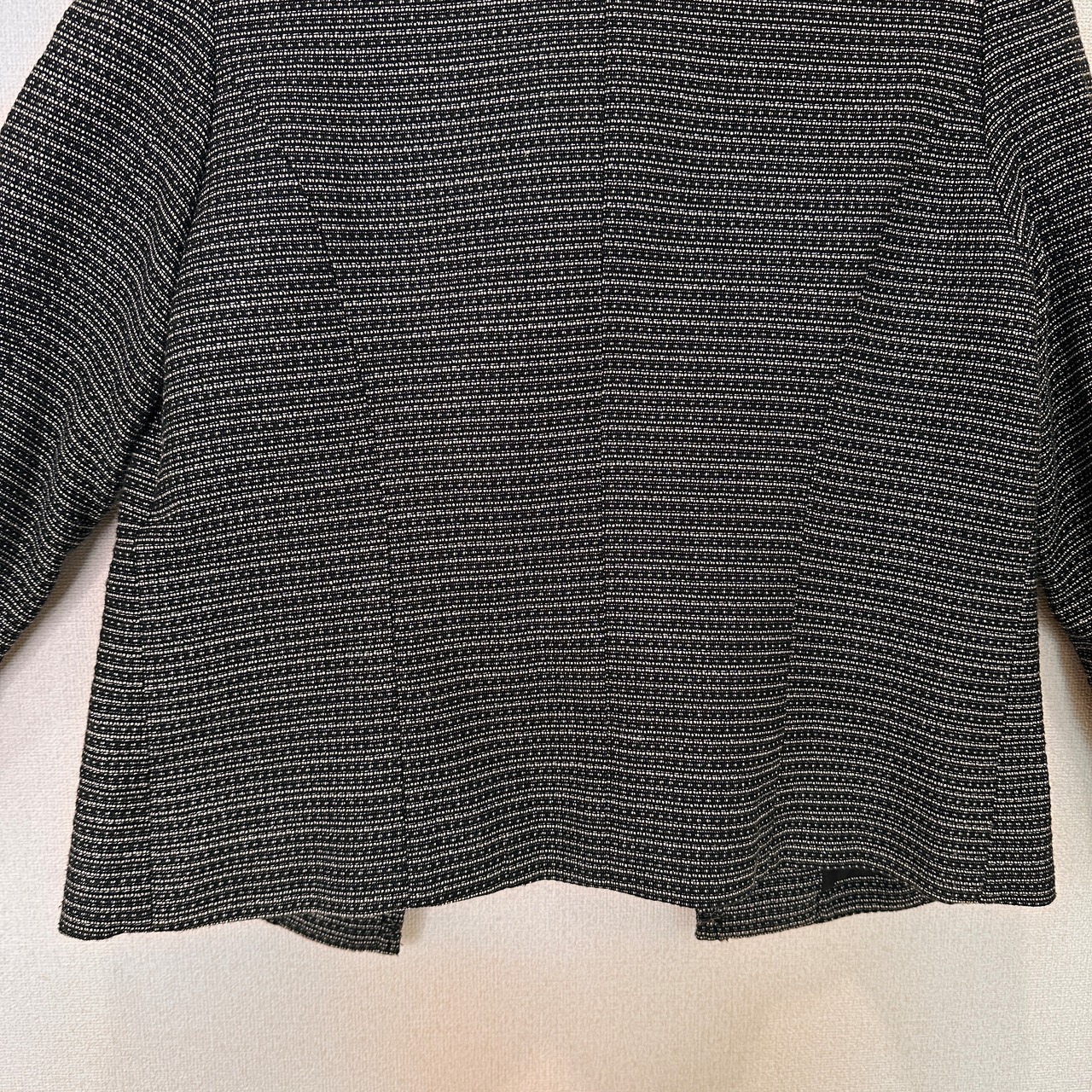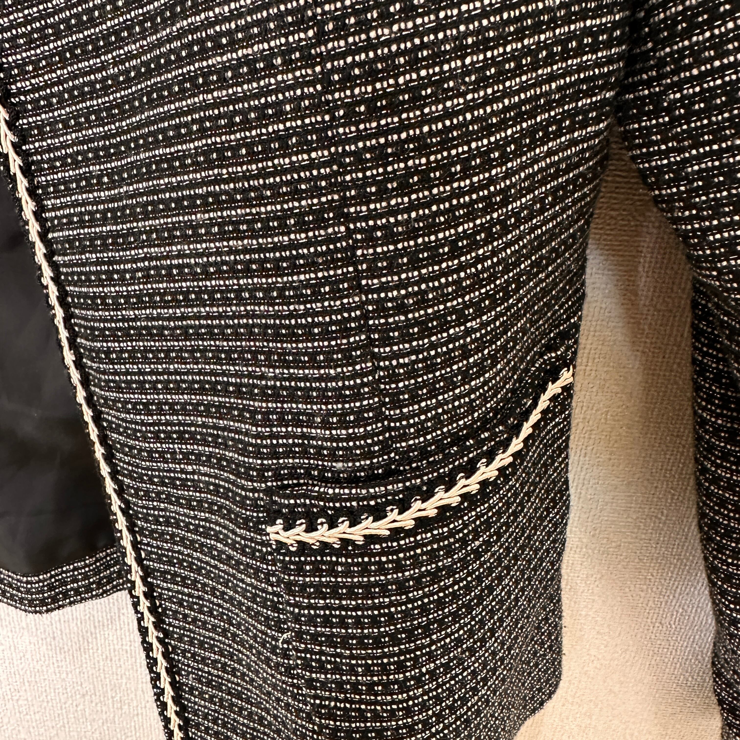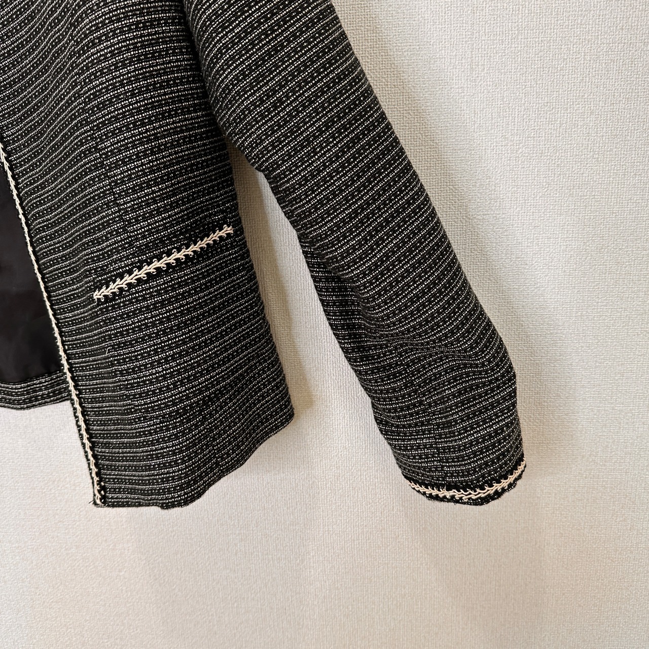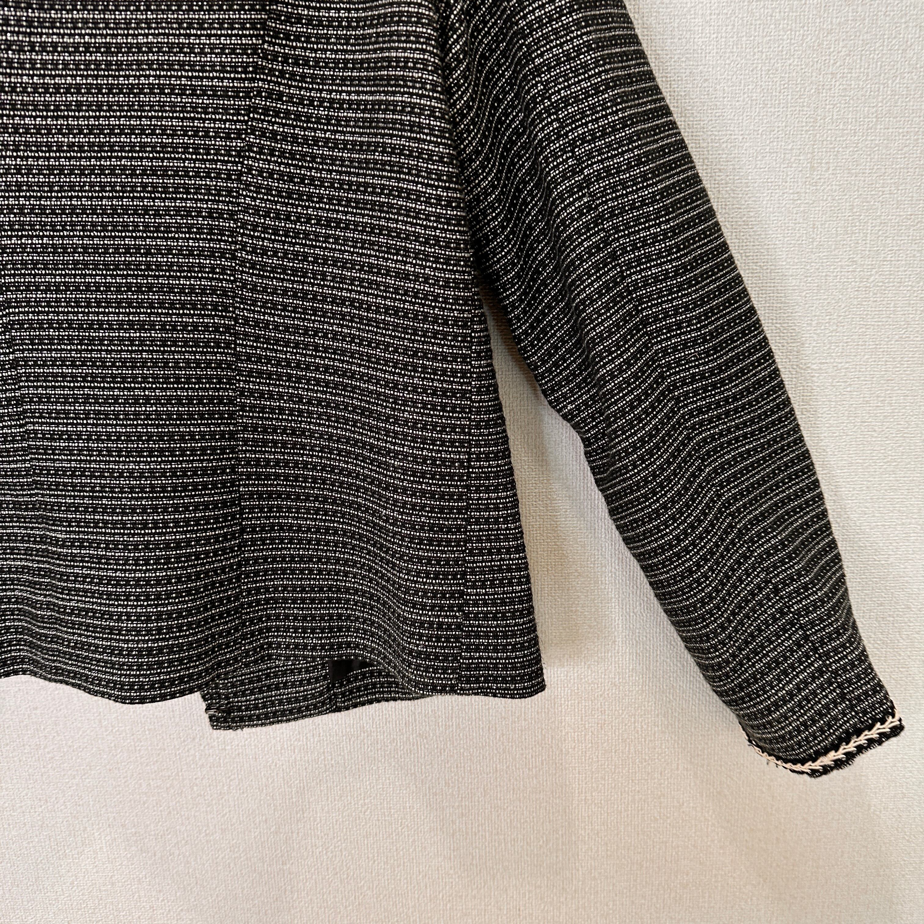 目立った傷や汚れはありませんが、中古品にご理解いただける方のみご購入をお願いいたします。ツイード風のブラック・ホワイトのノーカラージャケット、装飾的な縁取りが特徴。