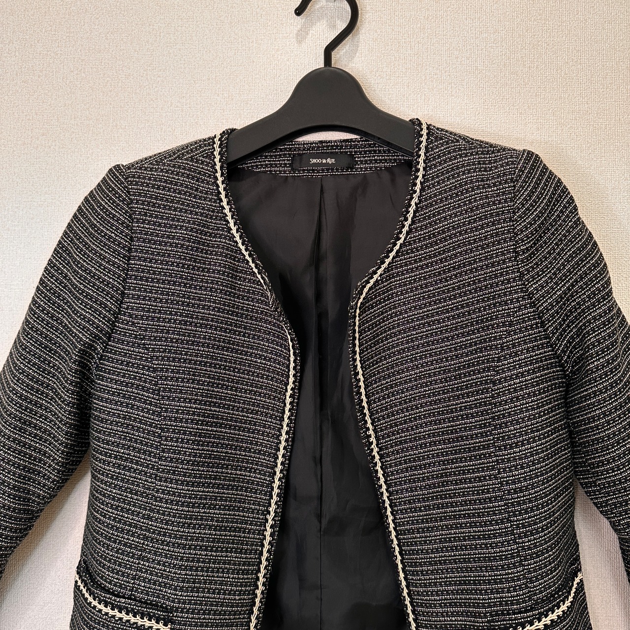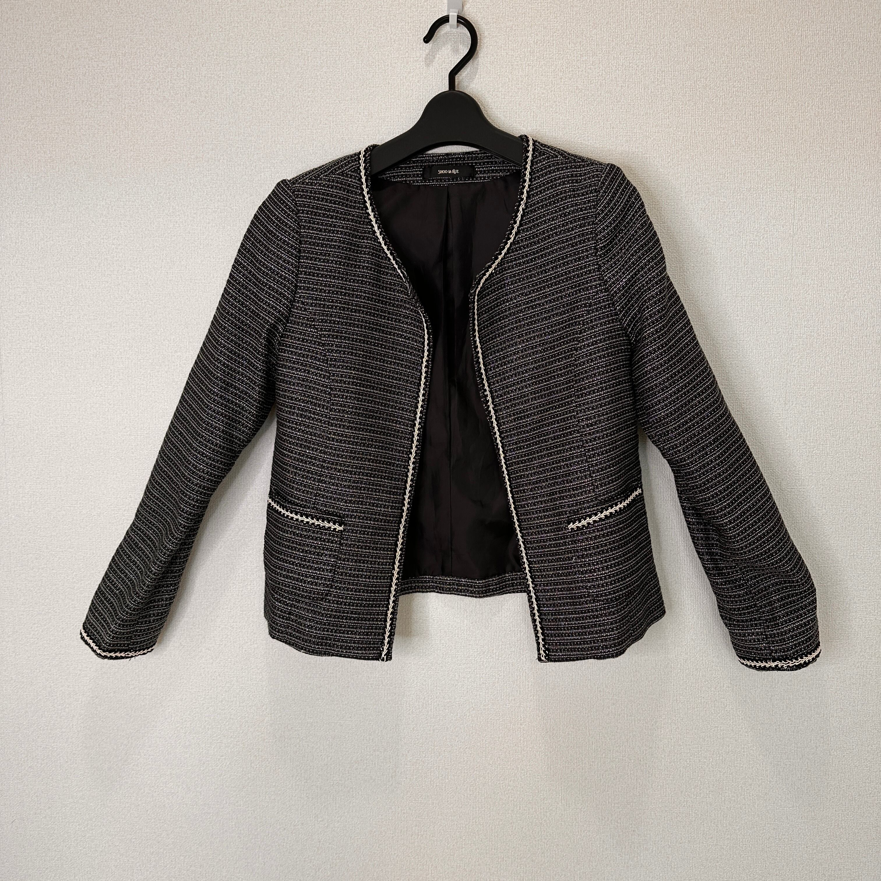 SHOO・LA・RUE (シューラルー) ツイード ノーカラージャケット Sサイズ 黒/白