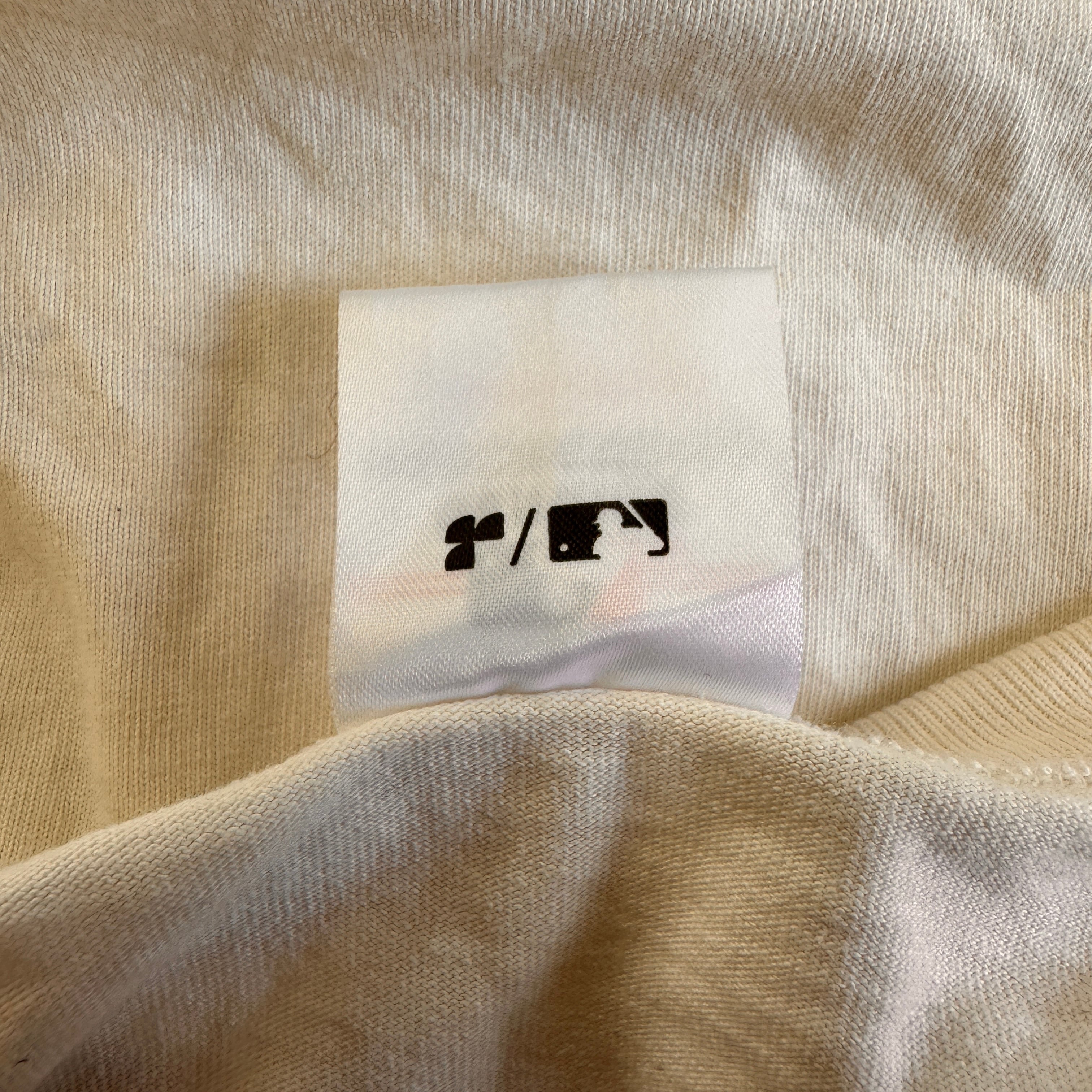 クリーム色に近い柔らかな色味で、胸元のA'sロゴと袖のMLBロゴ刺繍がポイントです。