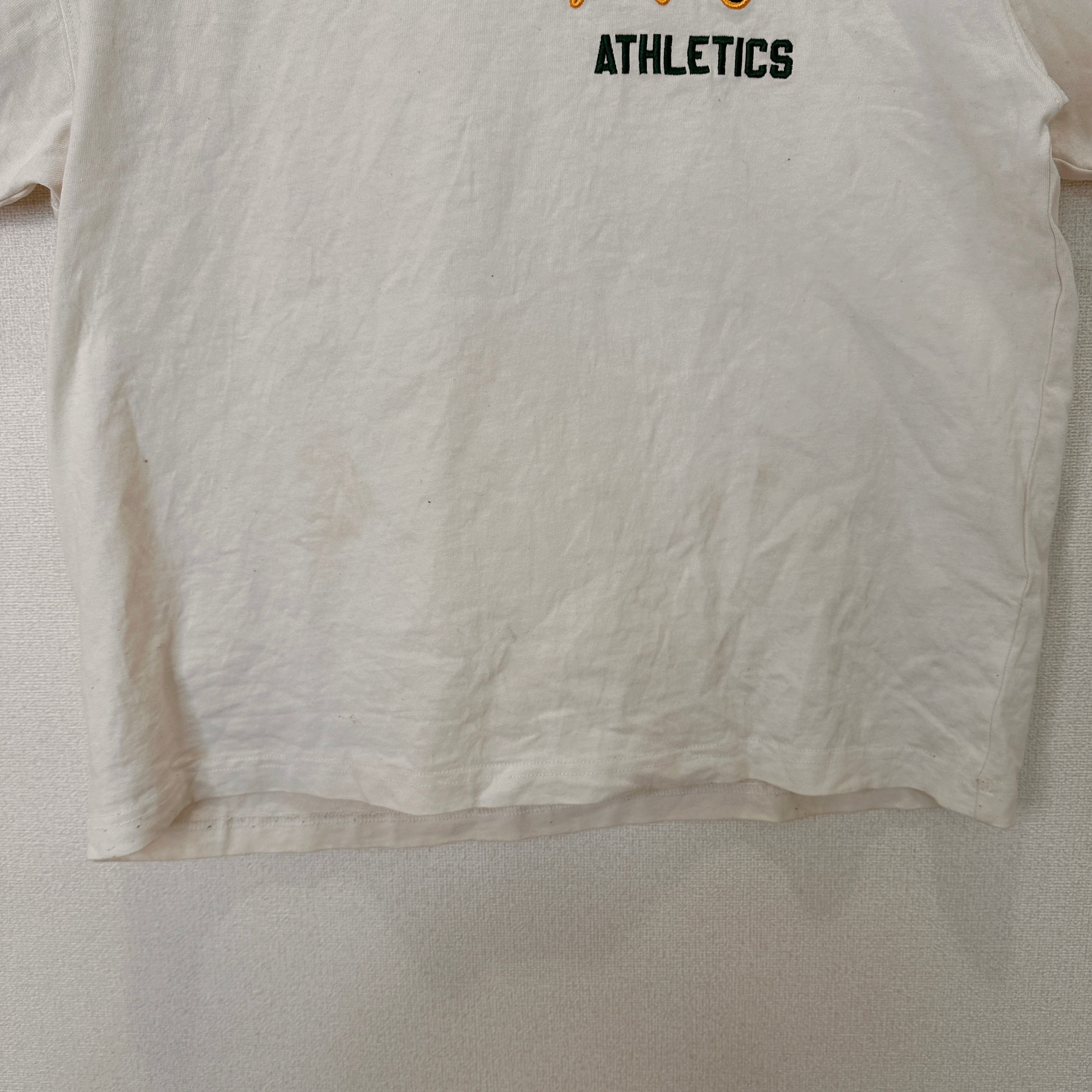 一部汚れがある点をご了承の上、ご購入をお願いいたします。A's ATHLETICSの刺繍が施されたホワイトTシャツ。