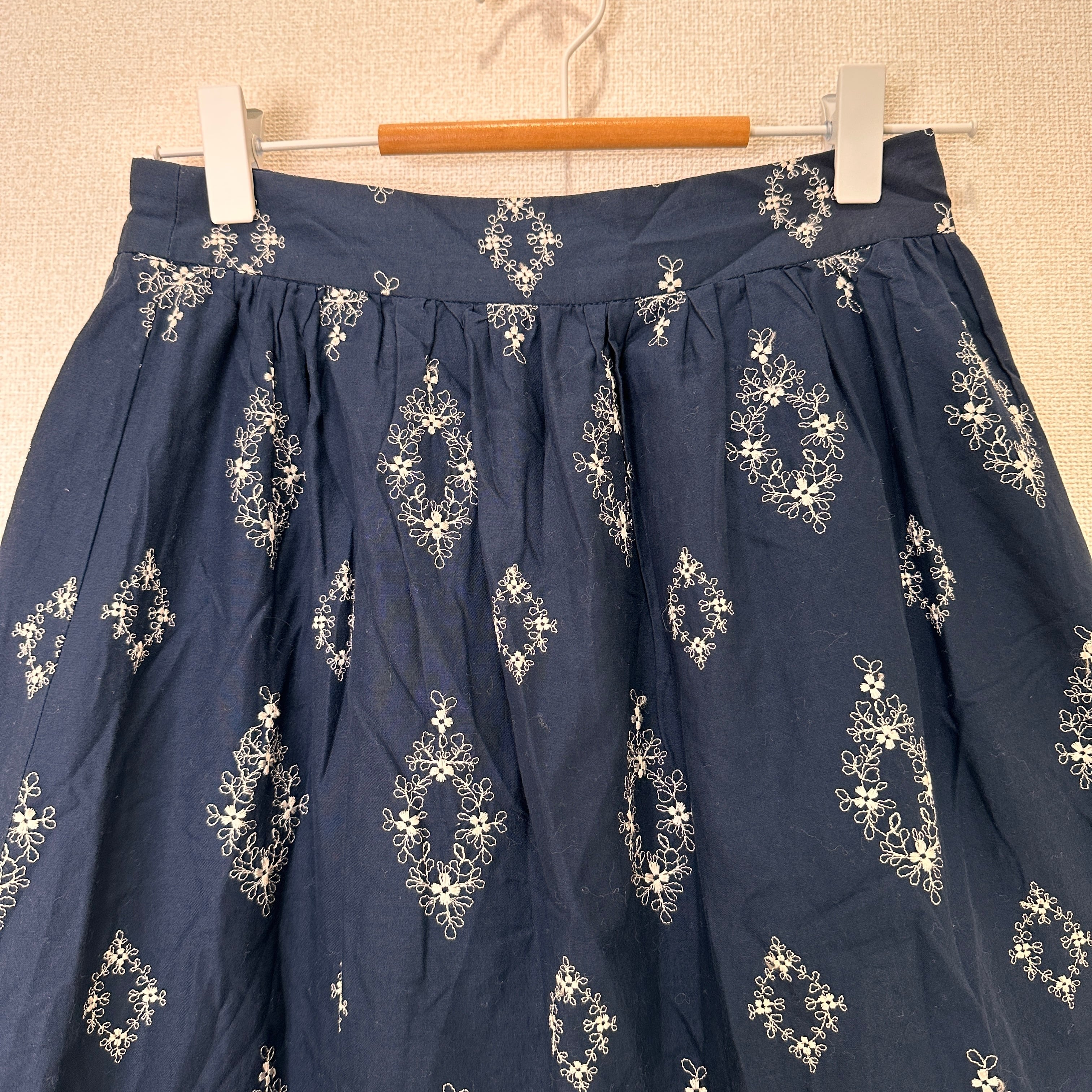 裏側の下部にほつれがある点をご了承ください。ネイビーの刺繍入りフレアスカート、サイズ38。
