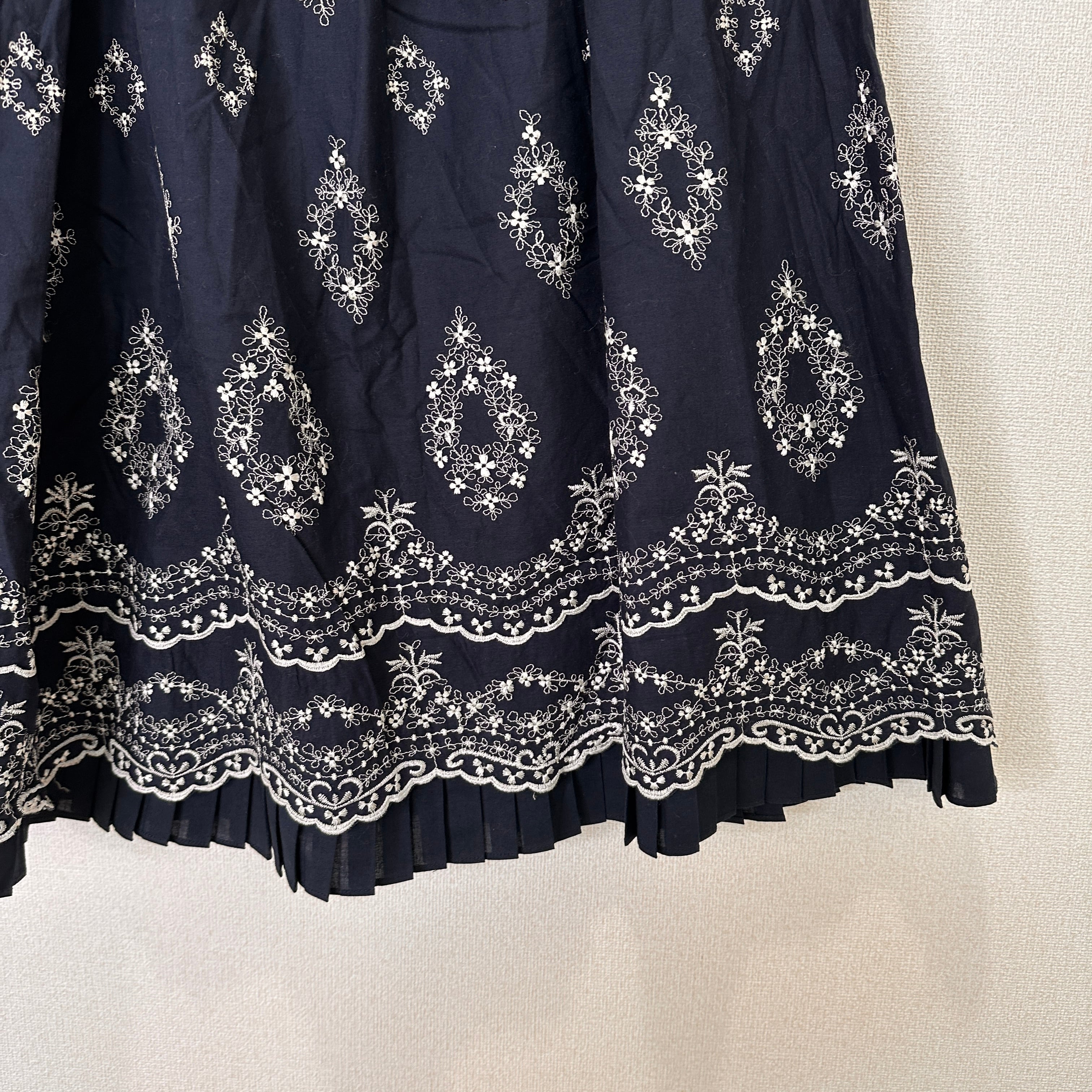 全面に施された花柄の刺繍と、裾近くのプリーツ切替がデザインのアクセントになっています。