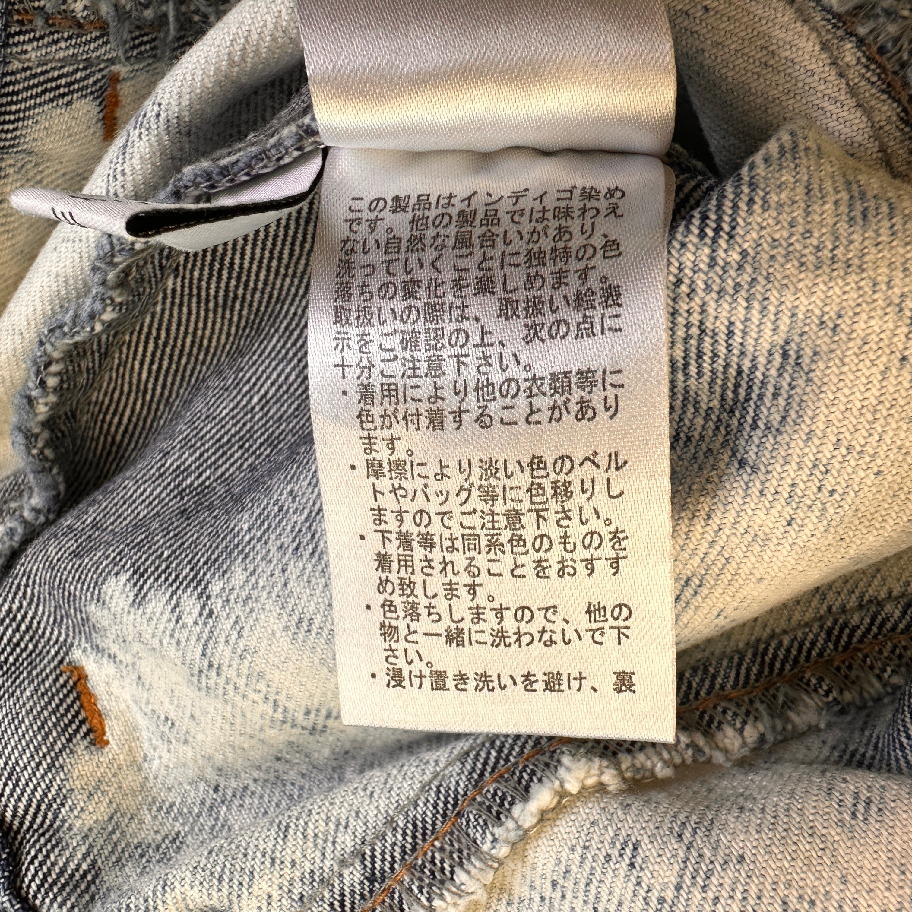 インディゴブルーとホワイト系のムラのある加工がコントラストを生み出し、個性的な着こなしを演出します。