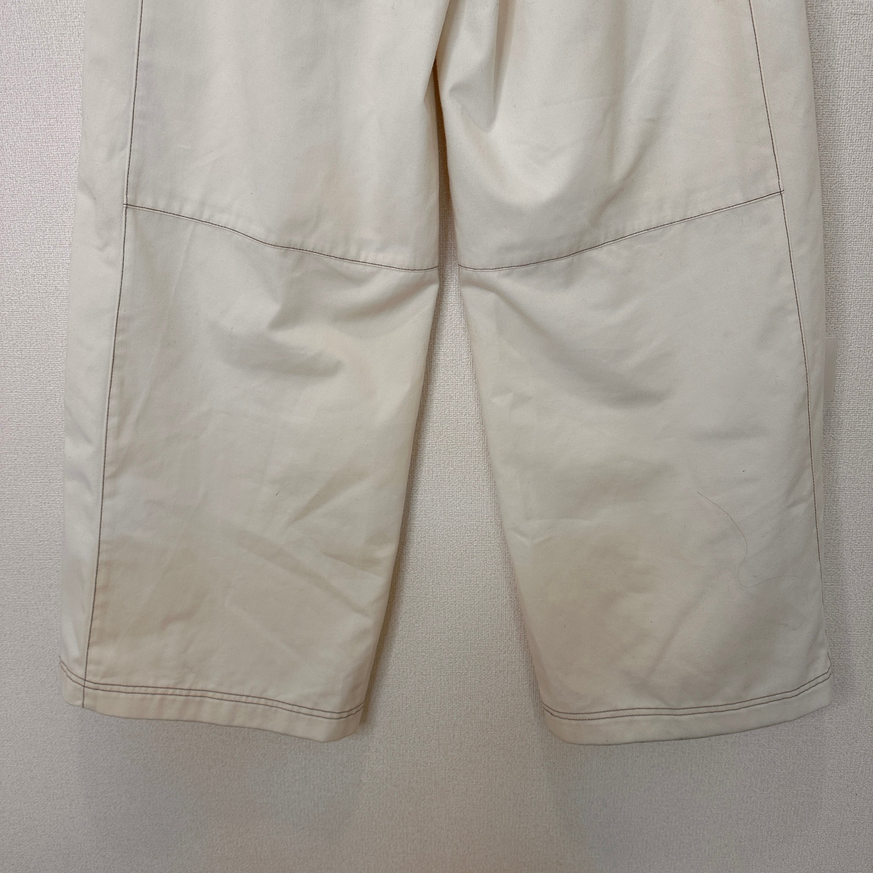 また、濃色との摩擦や汗・雨で濡れた状態での摩擦により、色移り・色落ちの恐れがある旨がタグに記載されていますホワイトのコットン混紡ワークパンツ、フロントポケット付きで実用的。