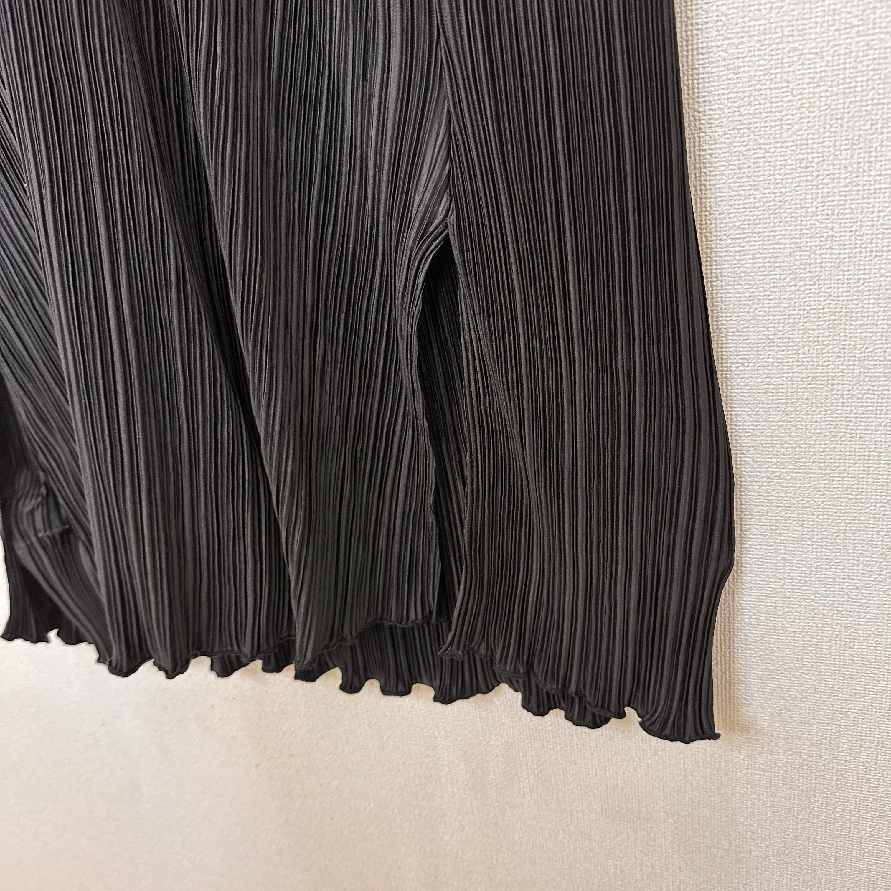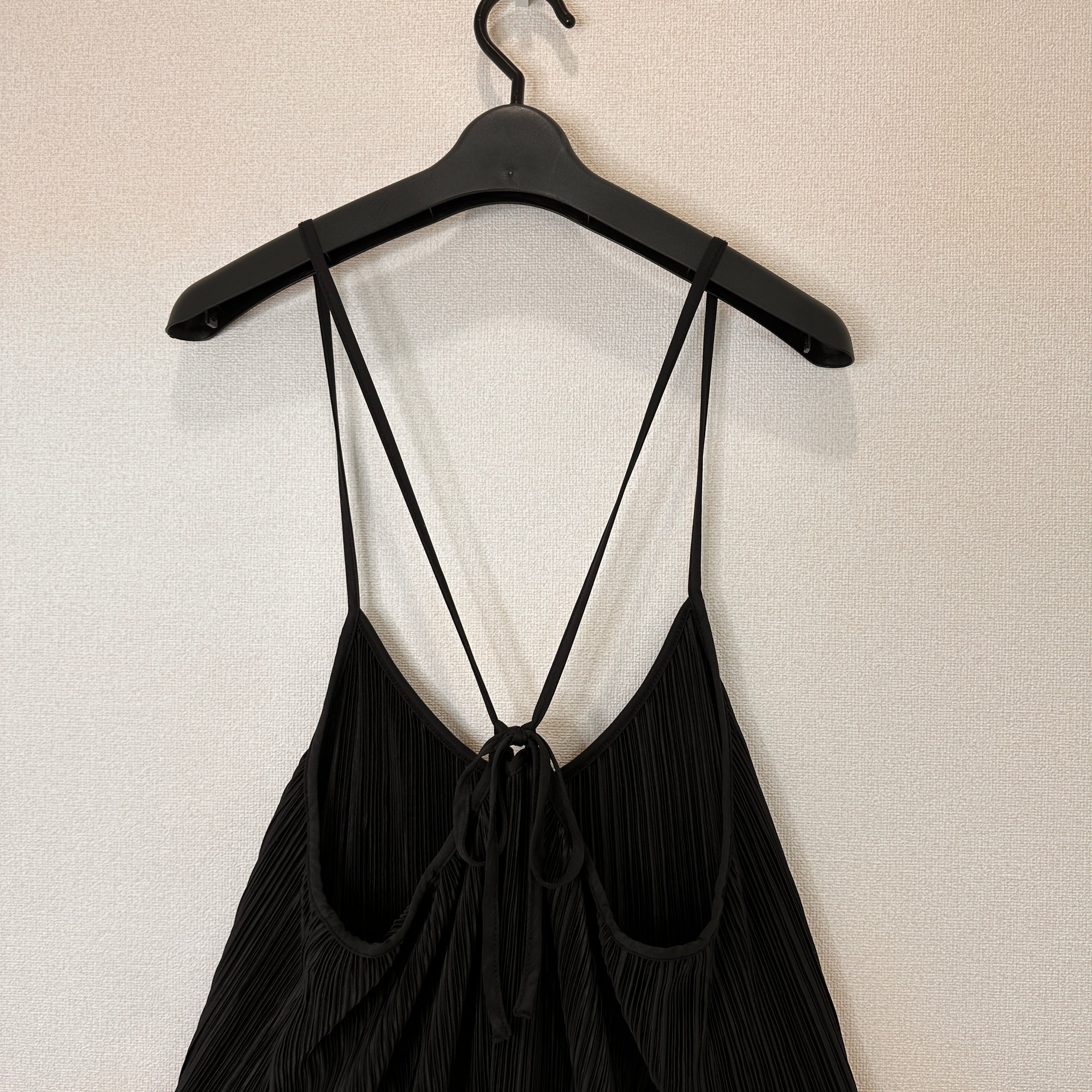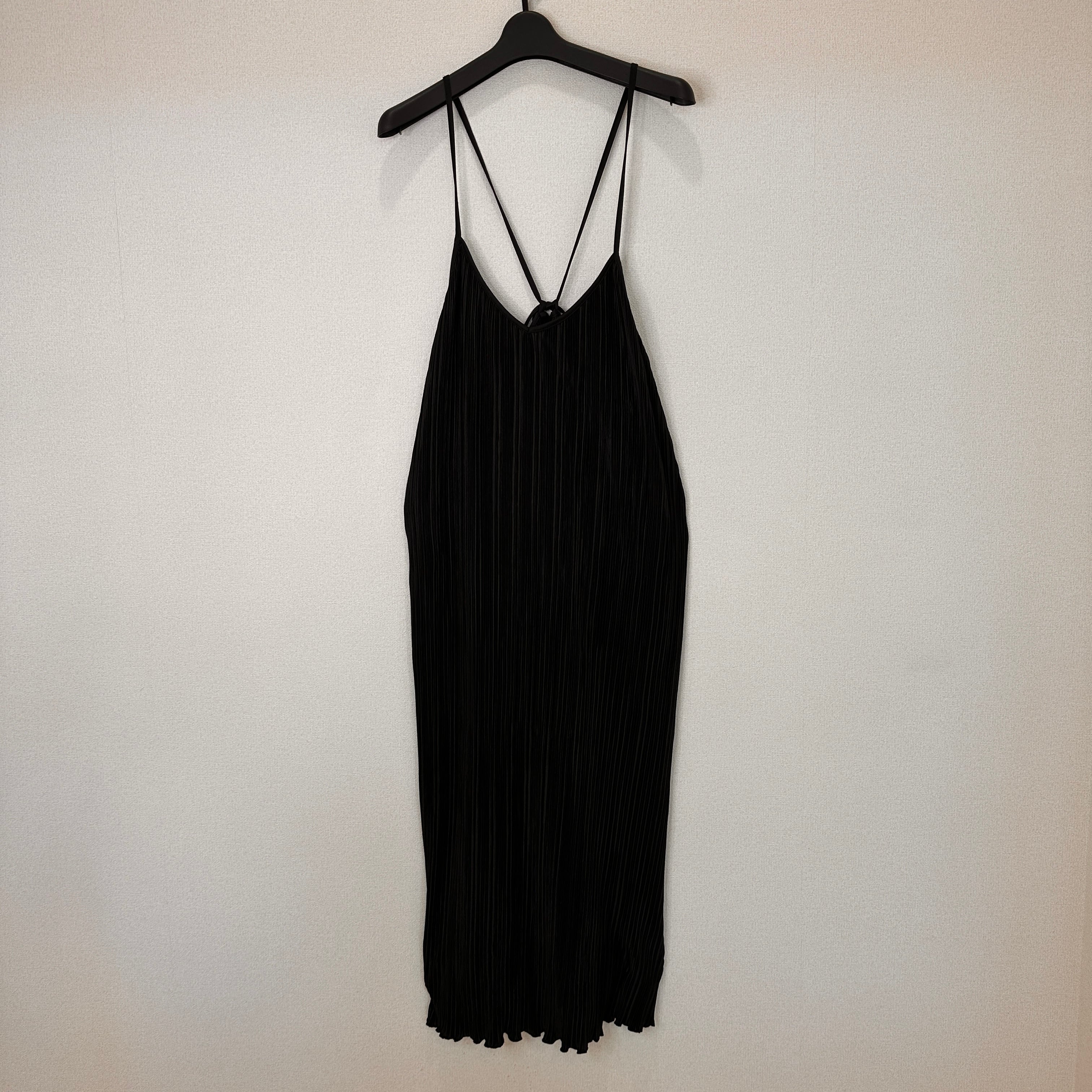 細かく縦に入ったプリーツと、華奢な肩紐(ストラップ)が特徴で、大人っぽいIラインシルエットを演出します。