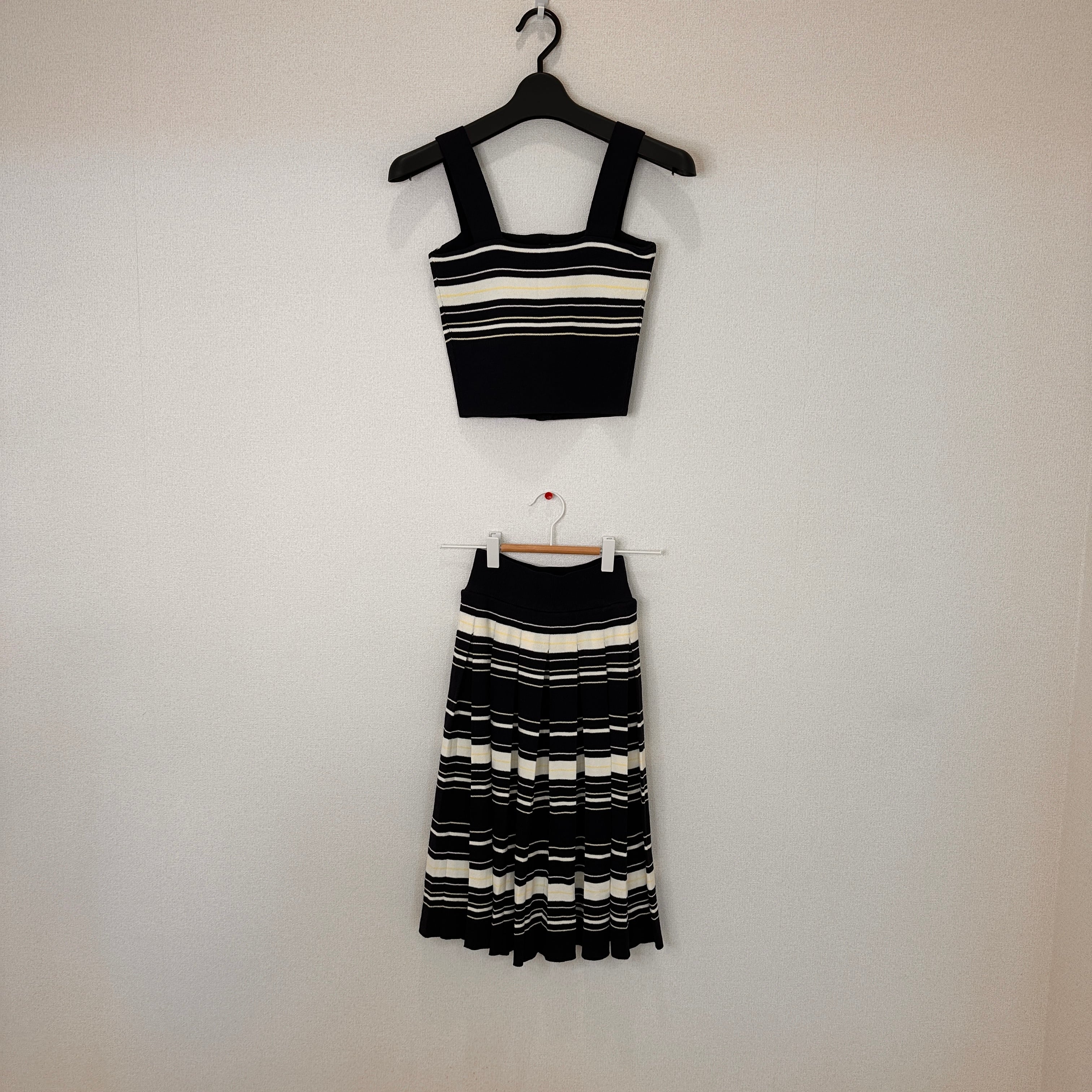 目立った傷や汚れはありませんが、中古品にご理解いただける方のみご購入をお願いいたします。黒と白のストライプが特徴のセットアップ、ストラップ付きクロップトップとプリーツスカートの組み合わせ。