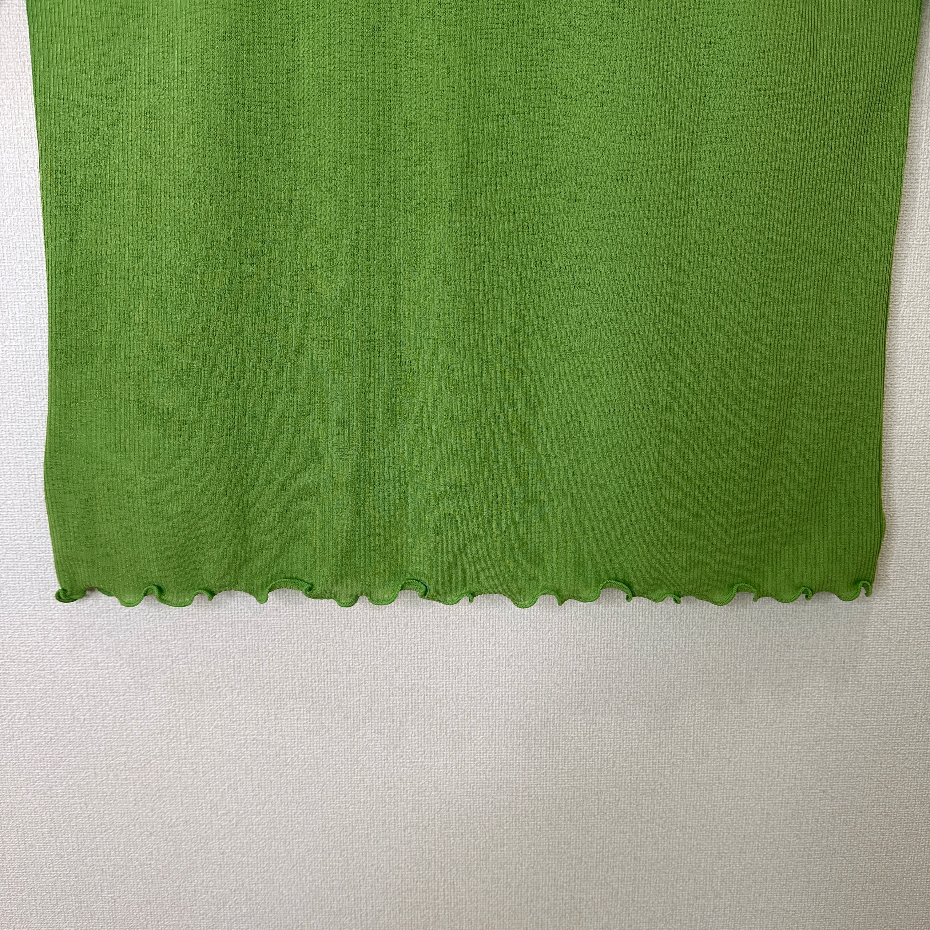 目立った傷や汚れはありませんが、中古品にご理解いただける方のみご購入をお願いいたします。リブ編みのグリーン半袖トップス、フリルヘムが特徴。
