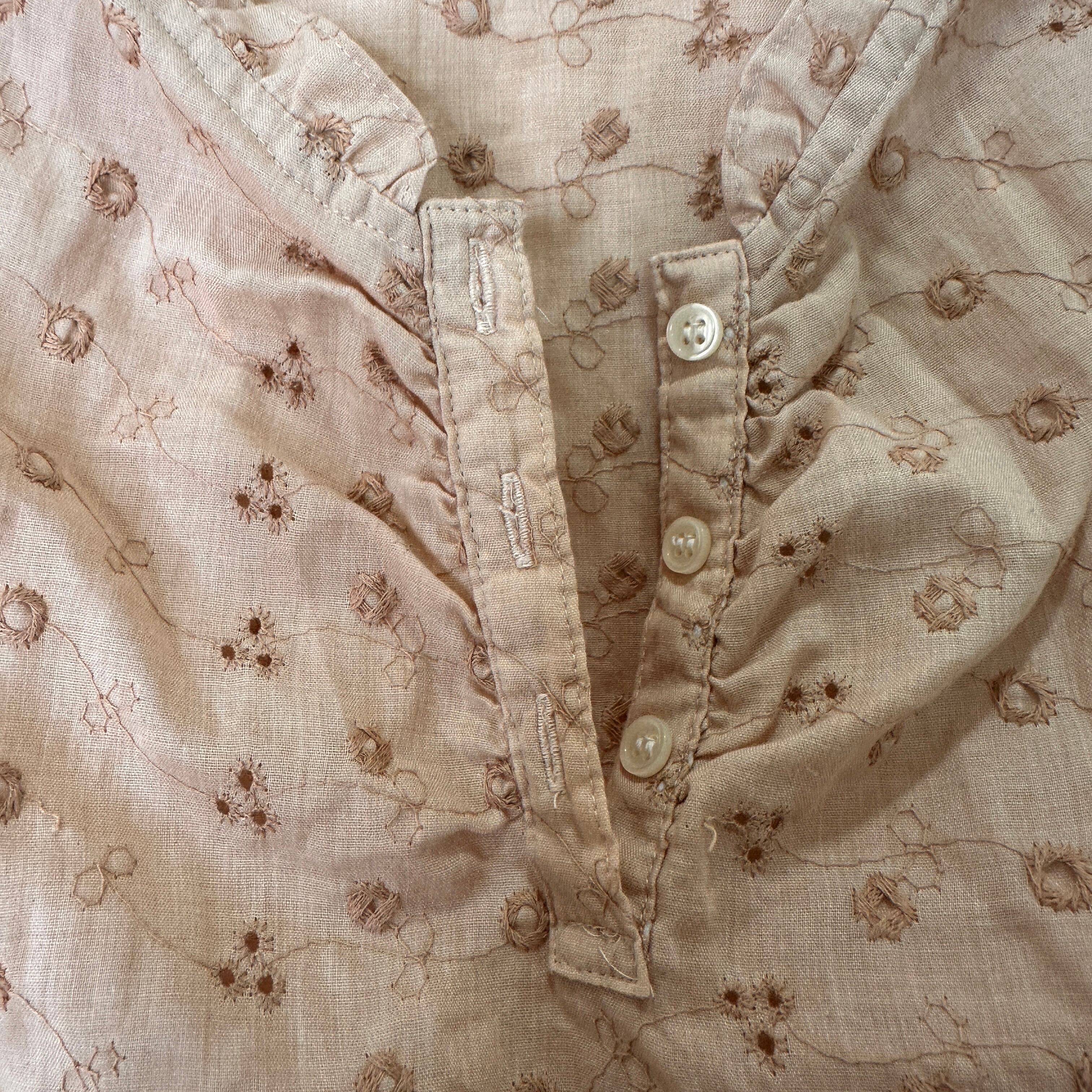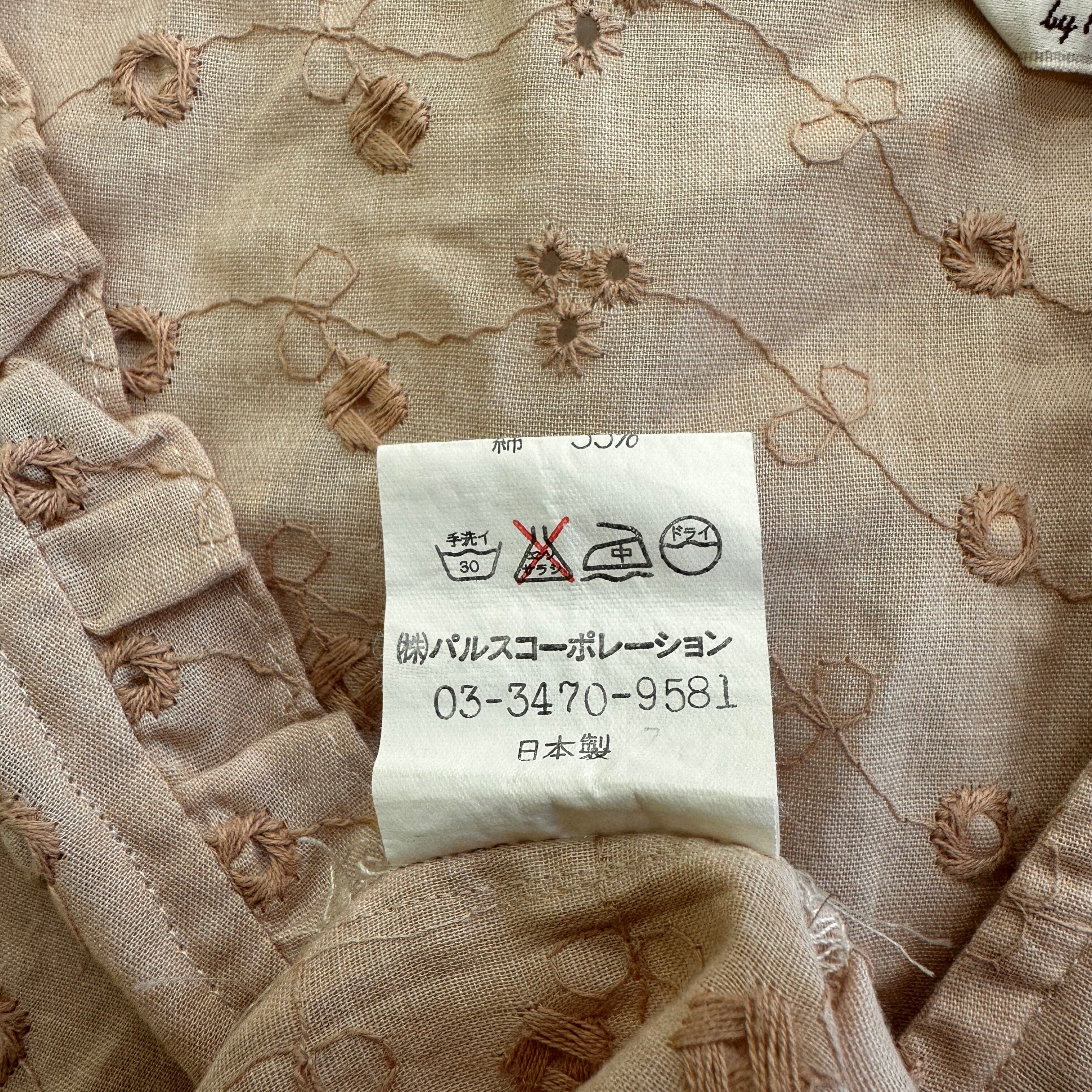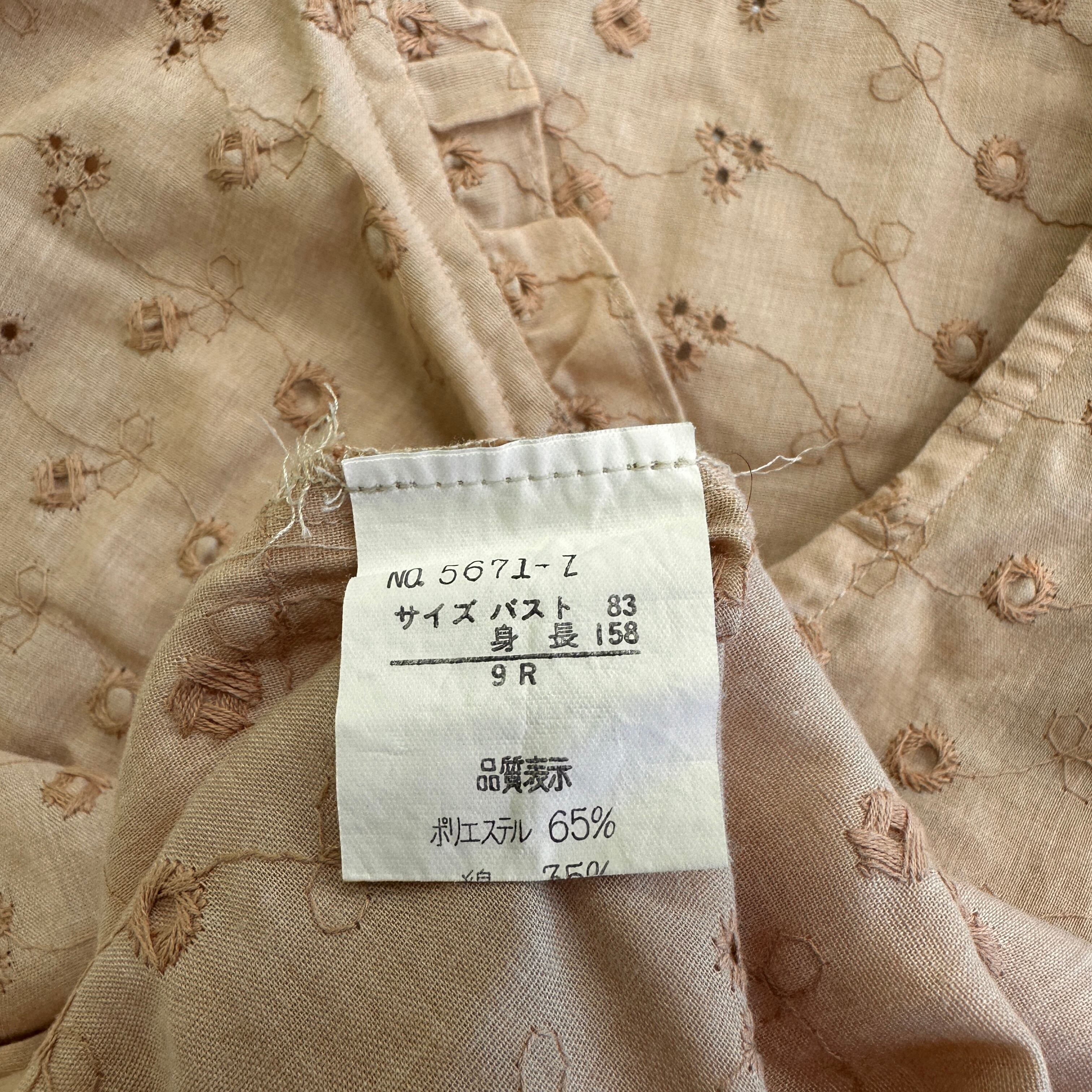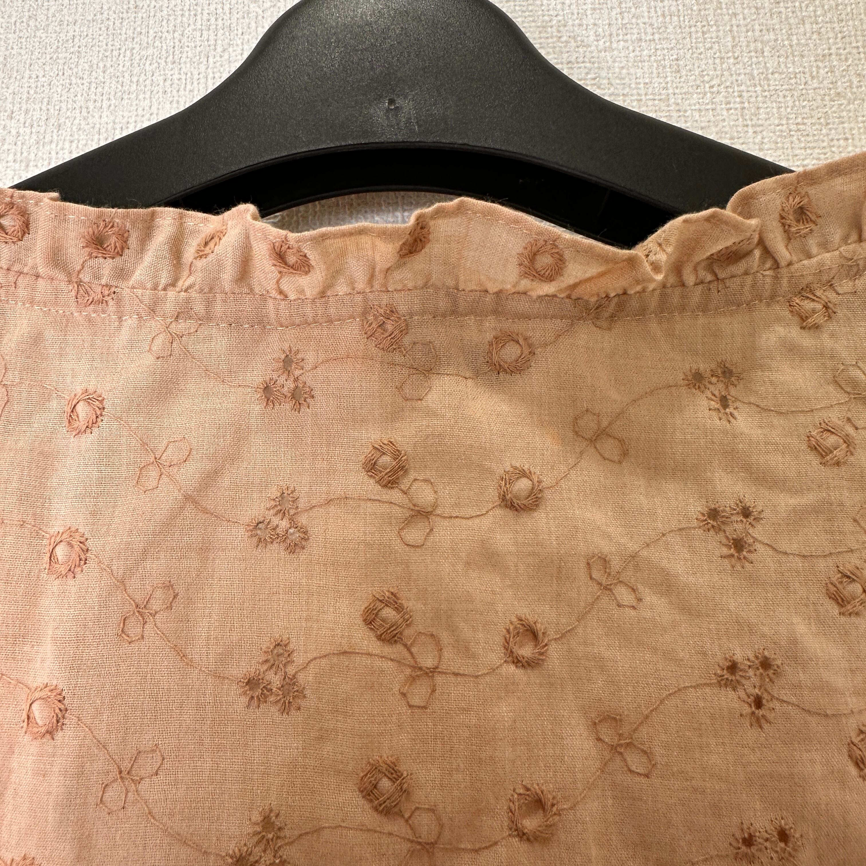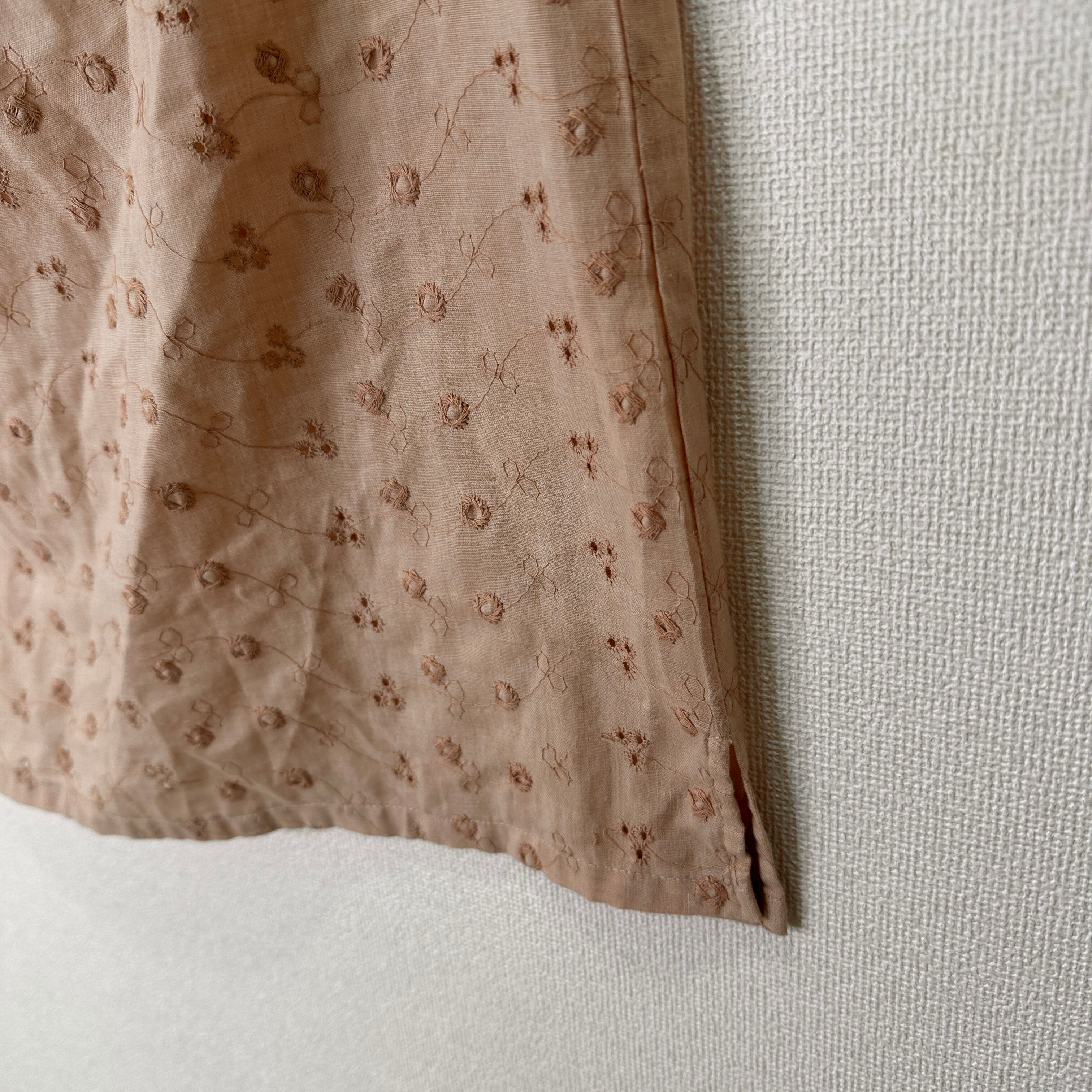 ベージュがかったブラウン系で、全体に繊細な花柄の刺繍(ブローダーレース風)が施されています。