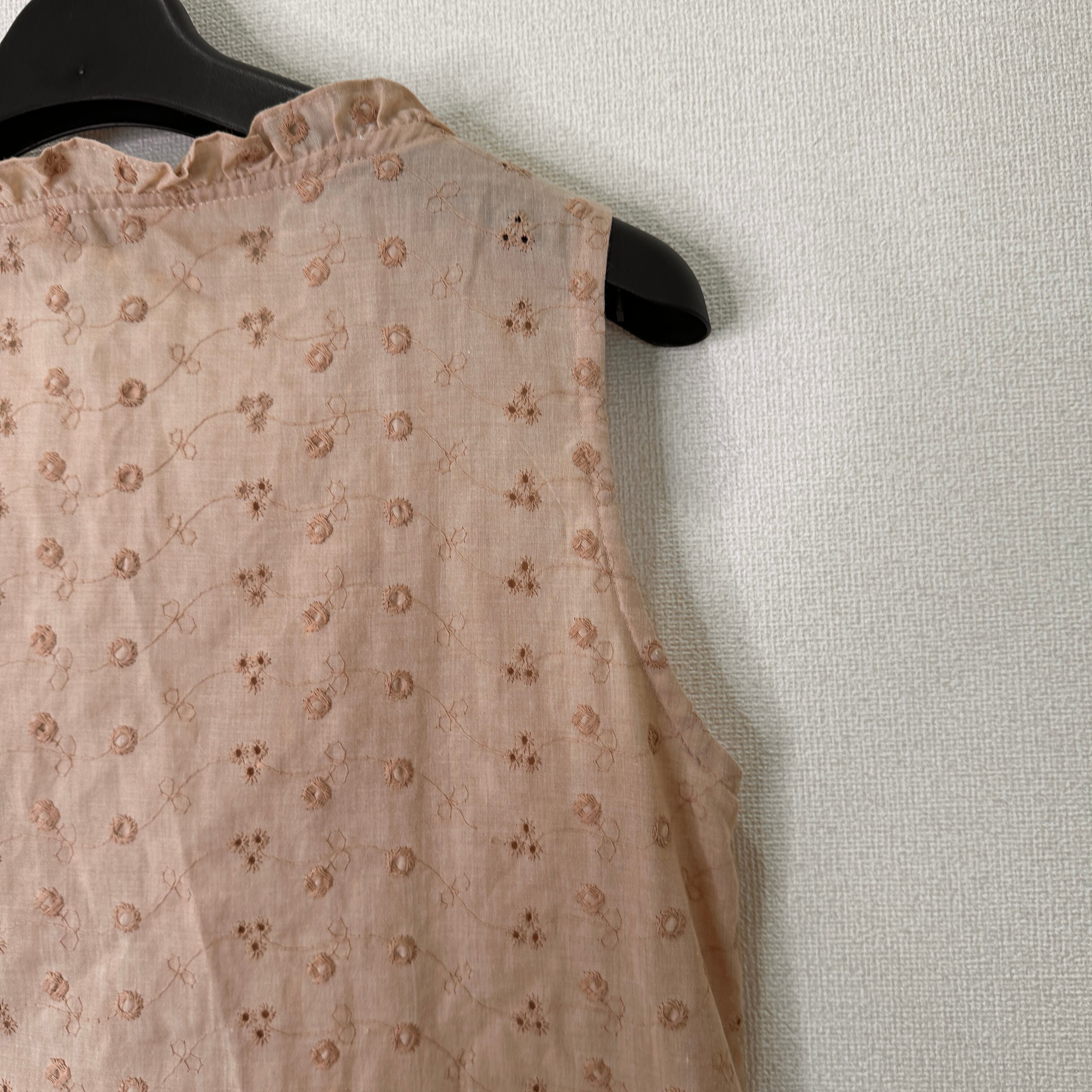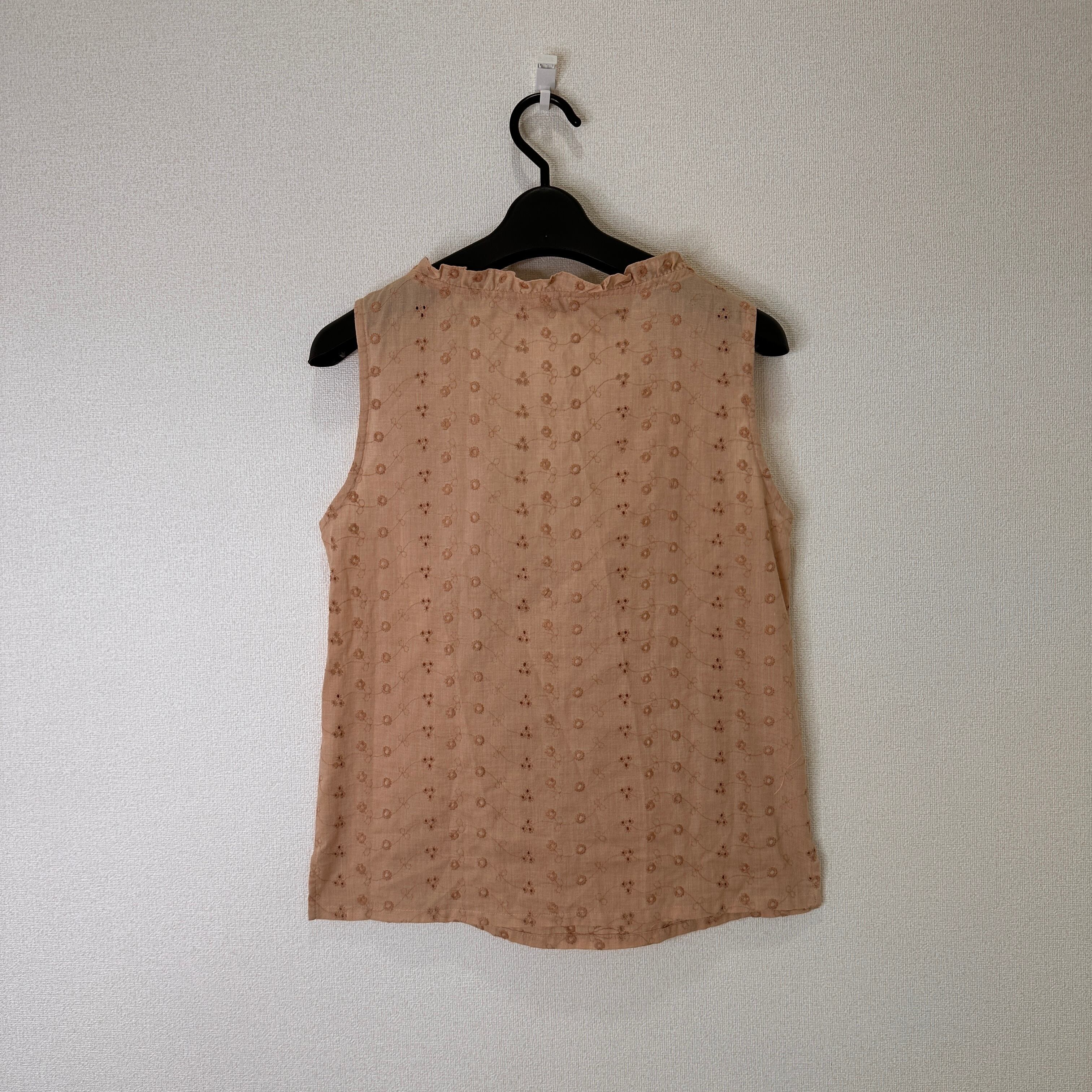 目立った傷や汚れはありませんが、中古品にご理解いただける方のみご購入をお願いいたします。軽量で通気性の良いベージュのノースリーブシャツ、フリル付きのVネックデザイン。