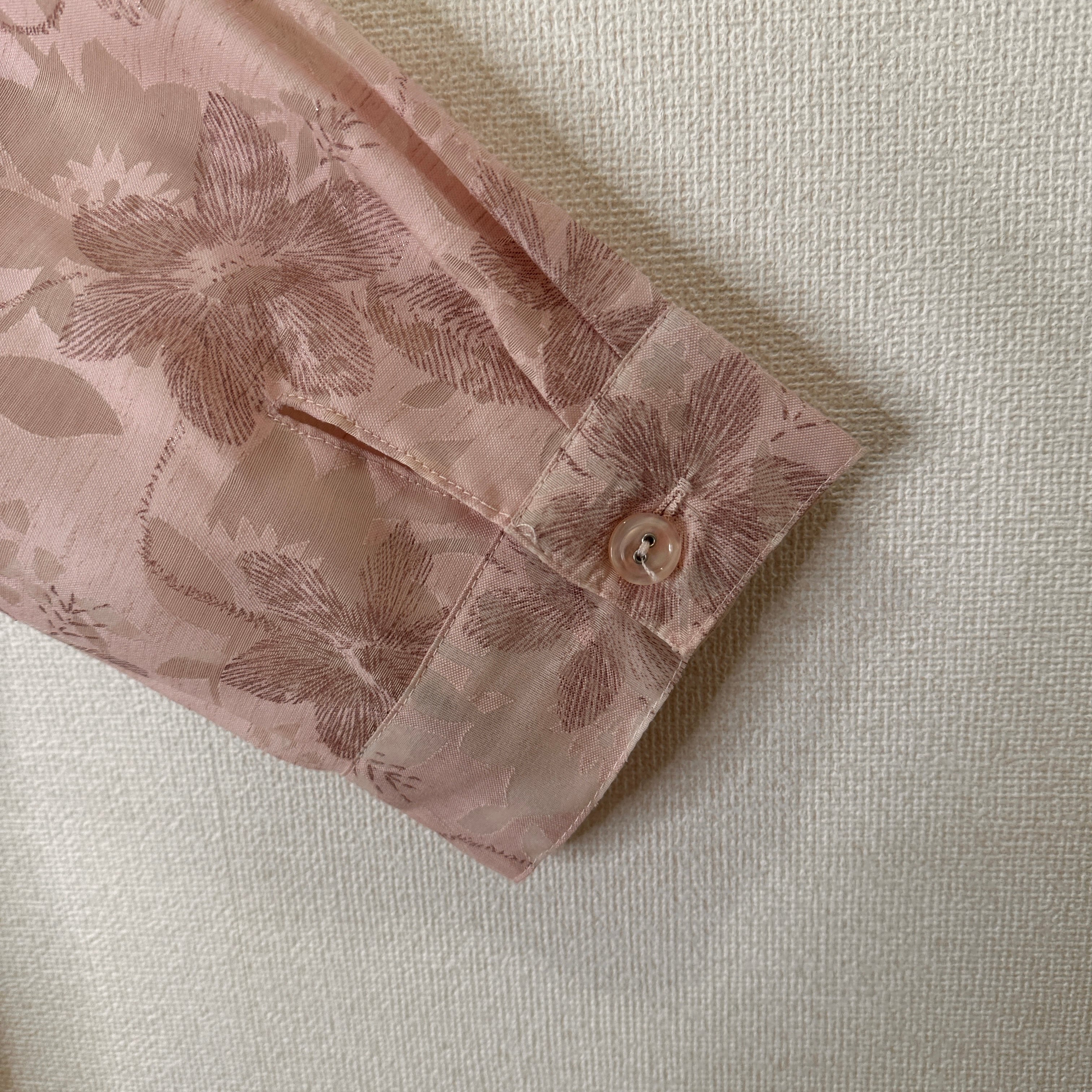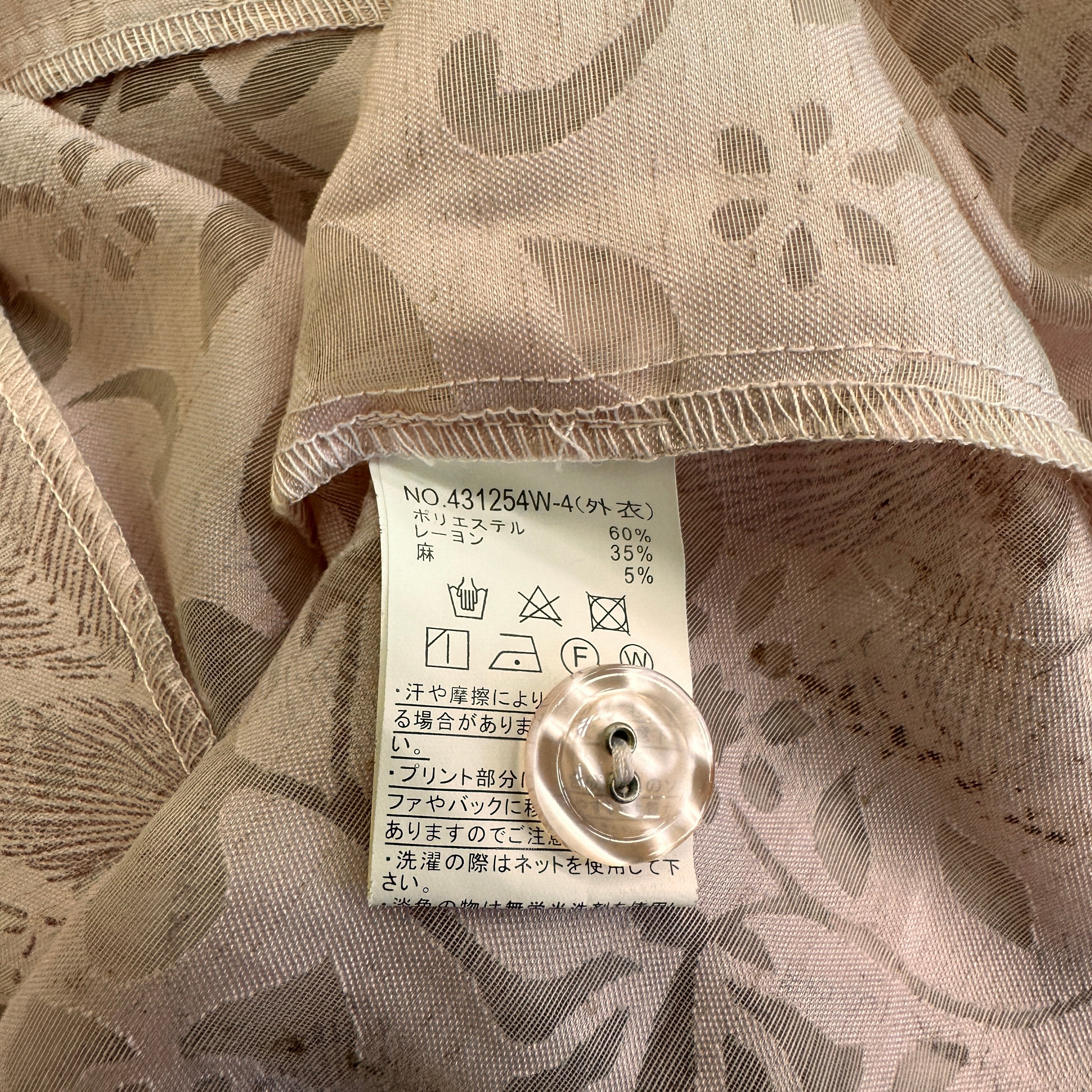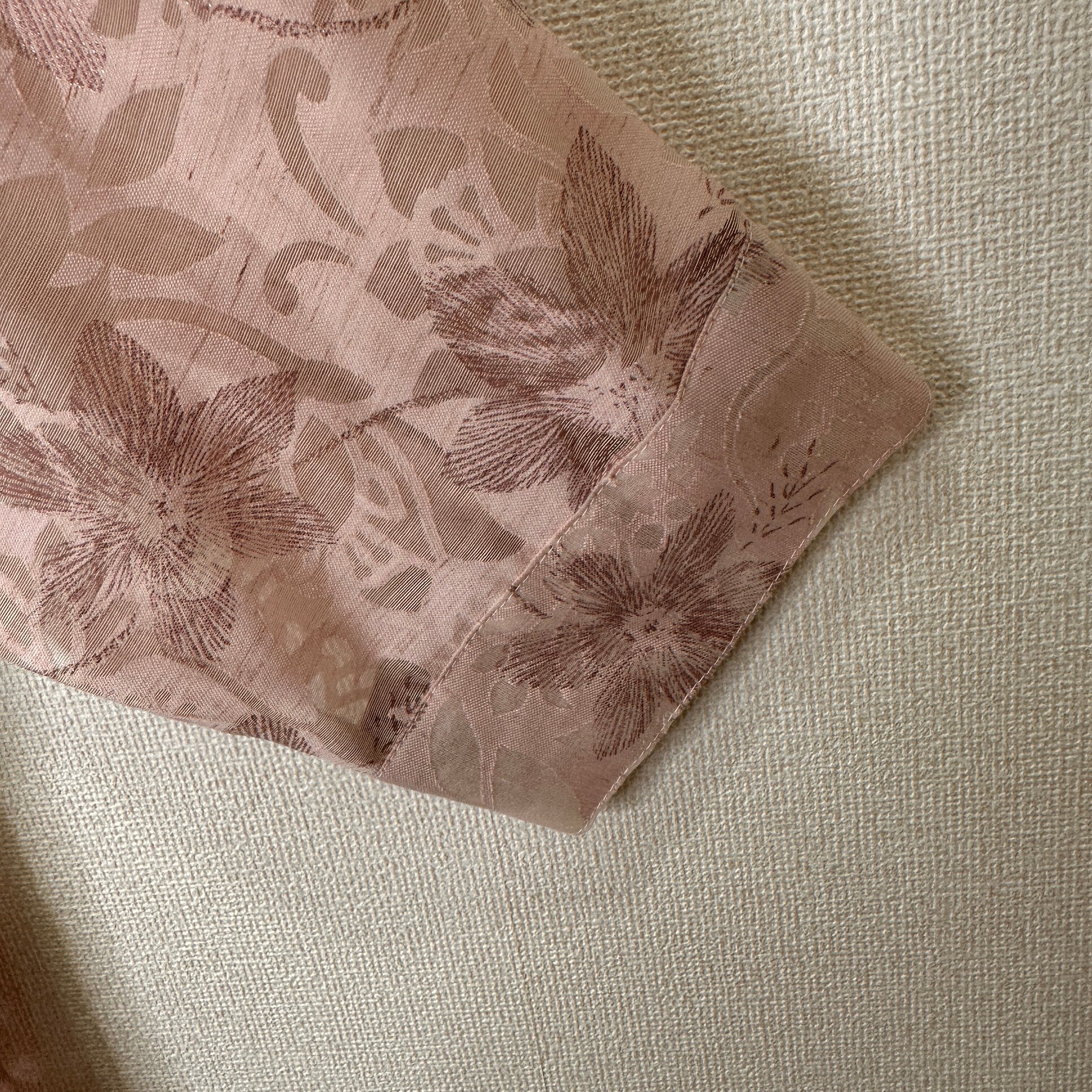 色は淡いピンクベージュ系で、透け感のある素材に同系色の花柄(ジャガード織りのような柄)があしらわれています。