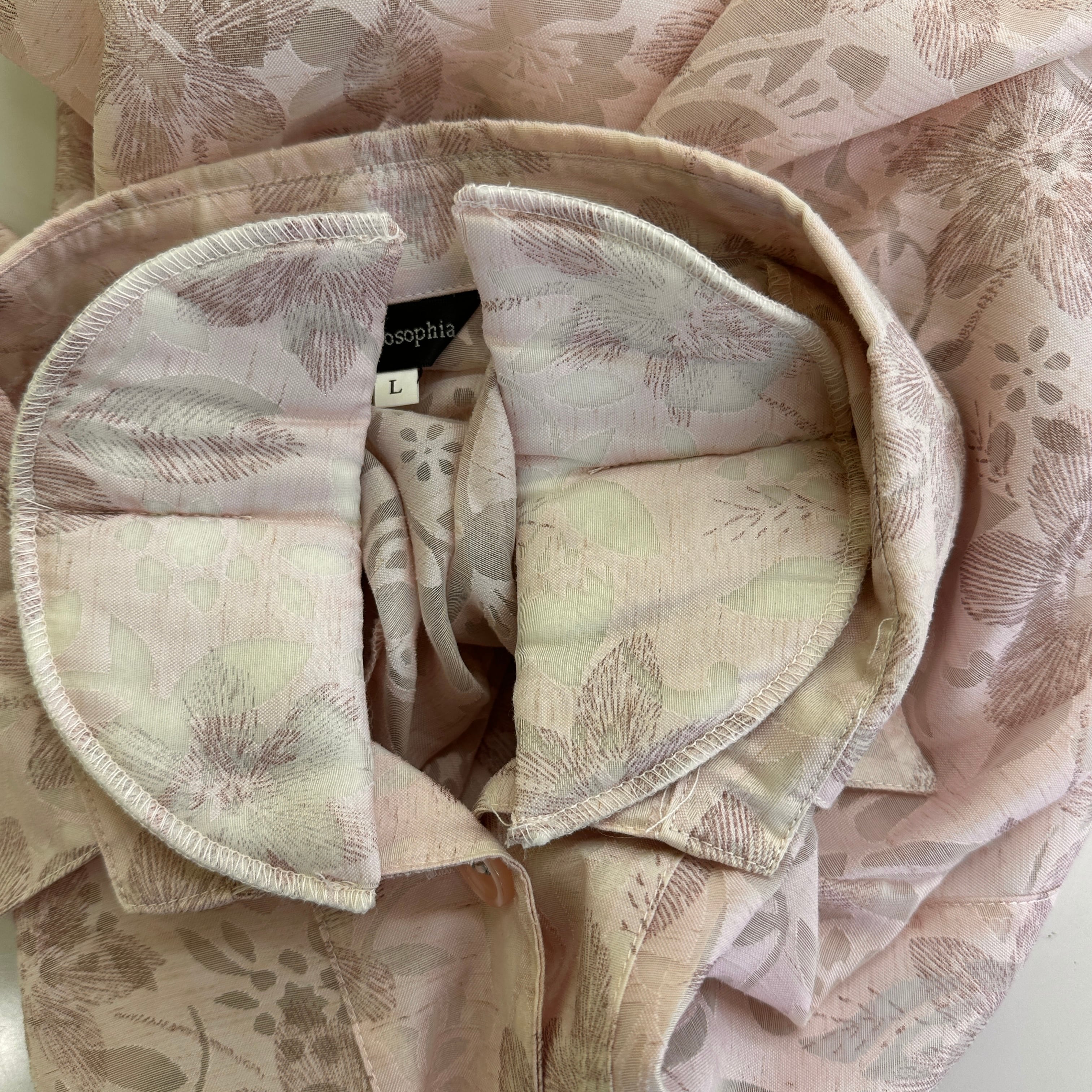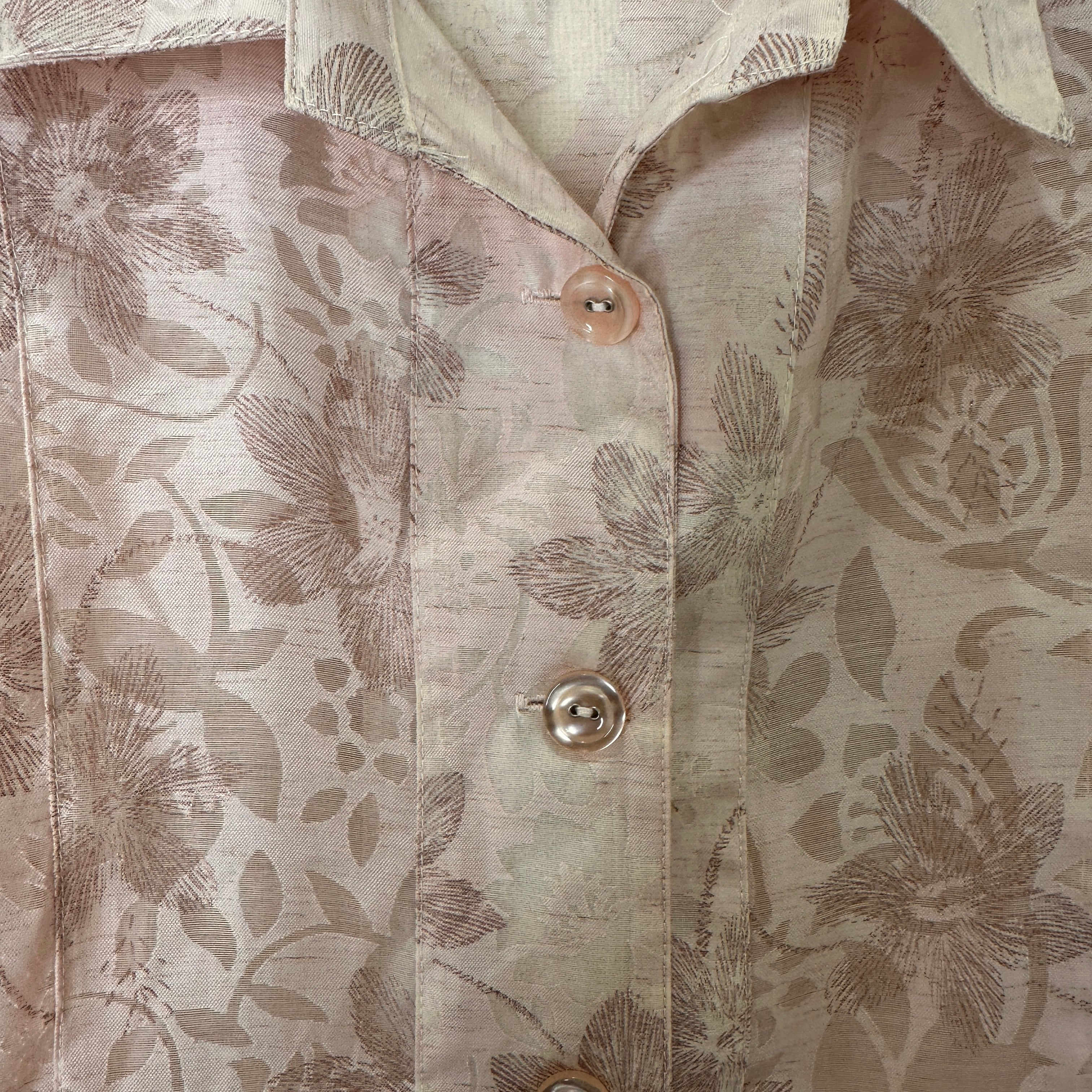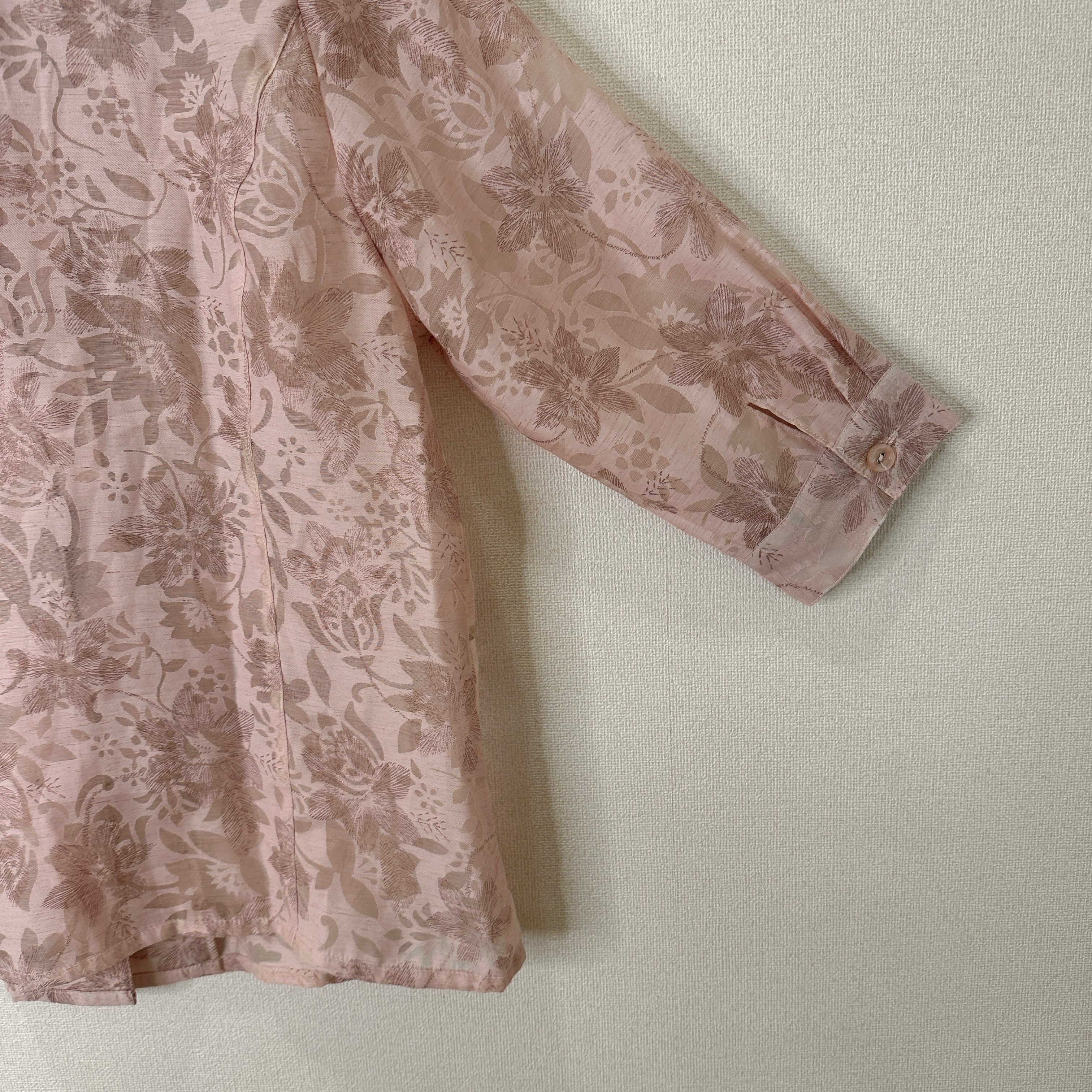 色は淡いピンクベージュ系で、透け感のある素材に同系色の花柄(ジャガード織りのような柄)があしらわれています。