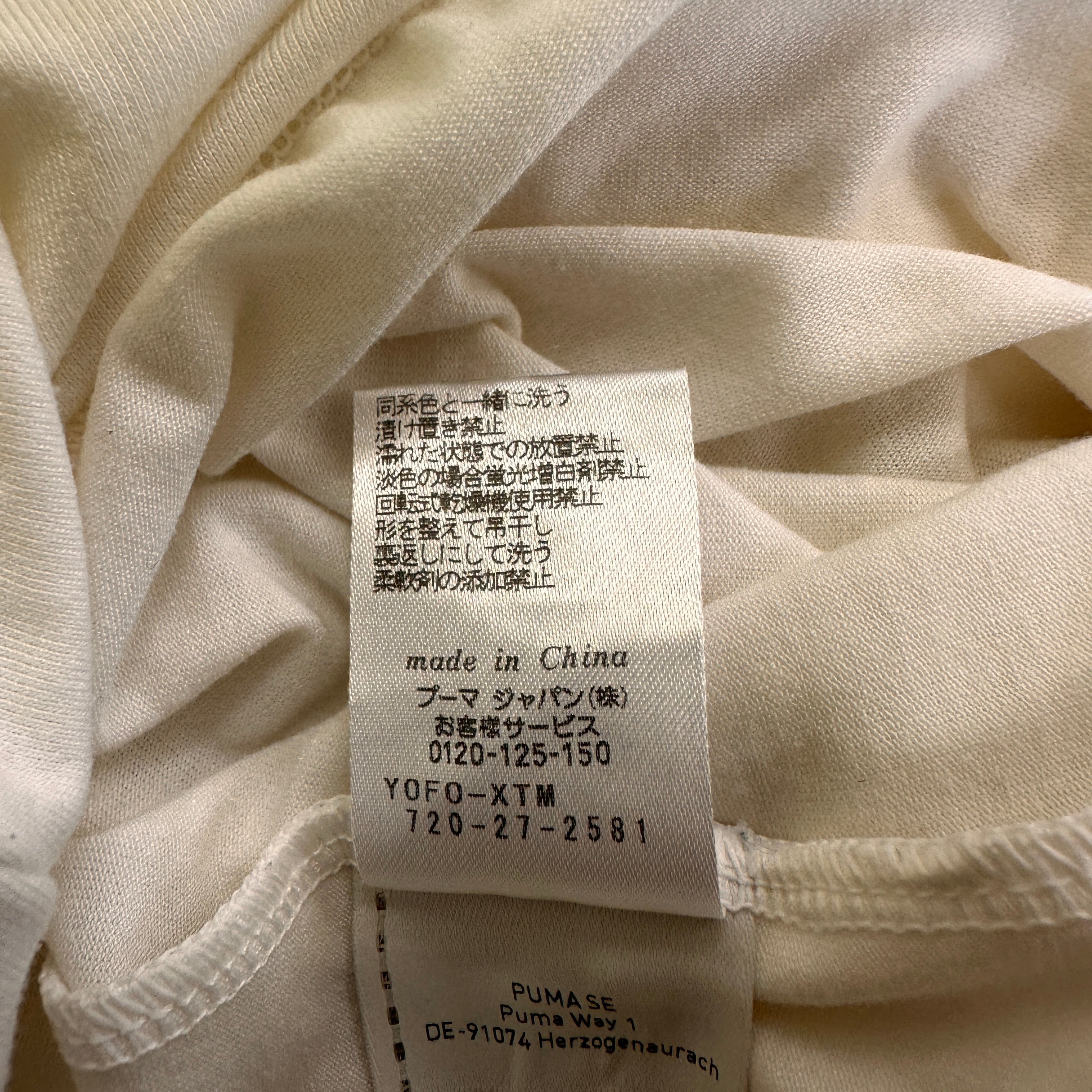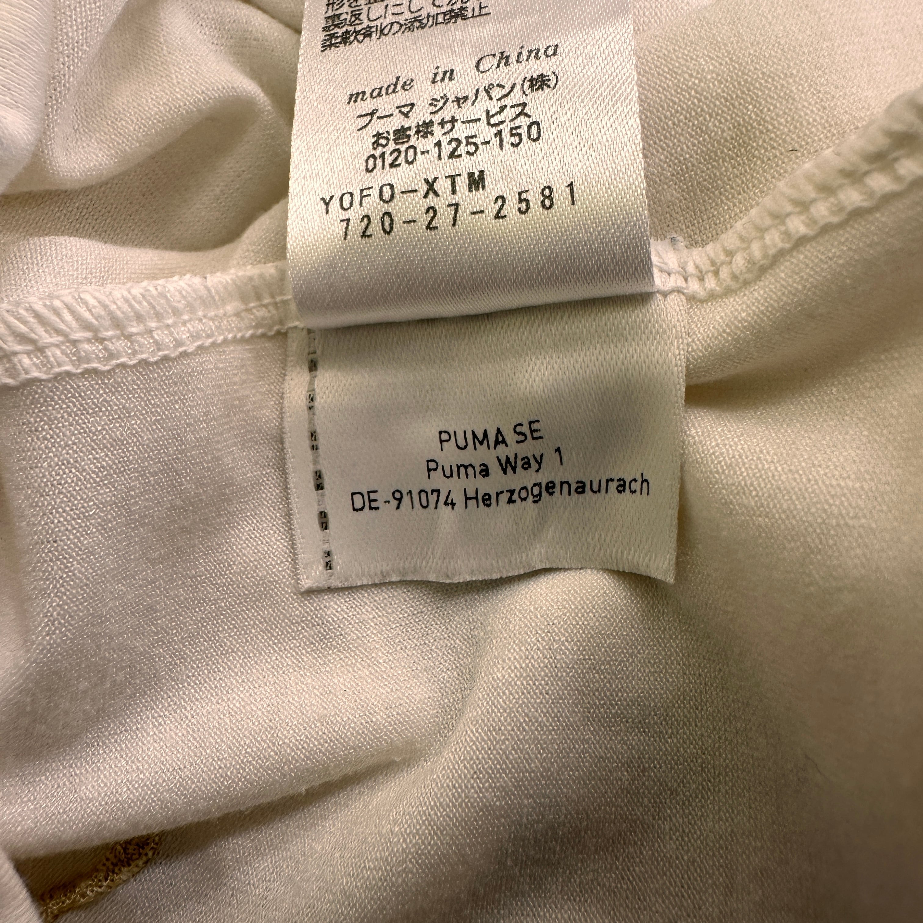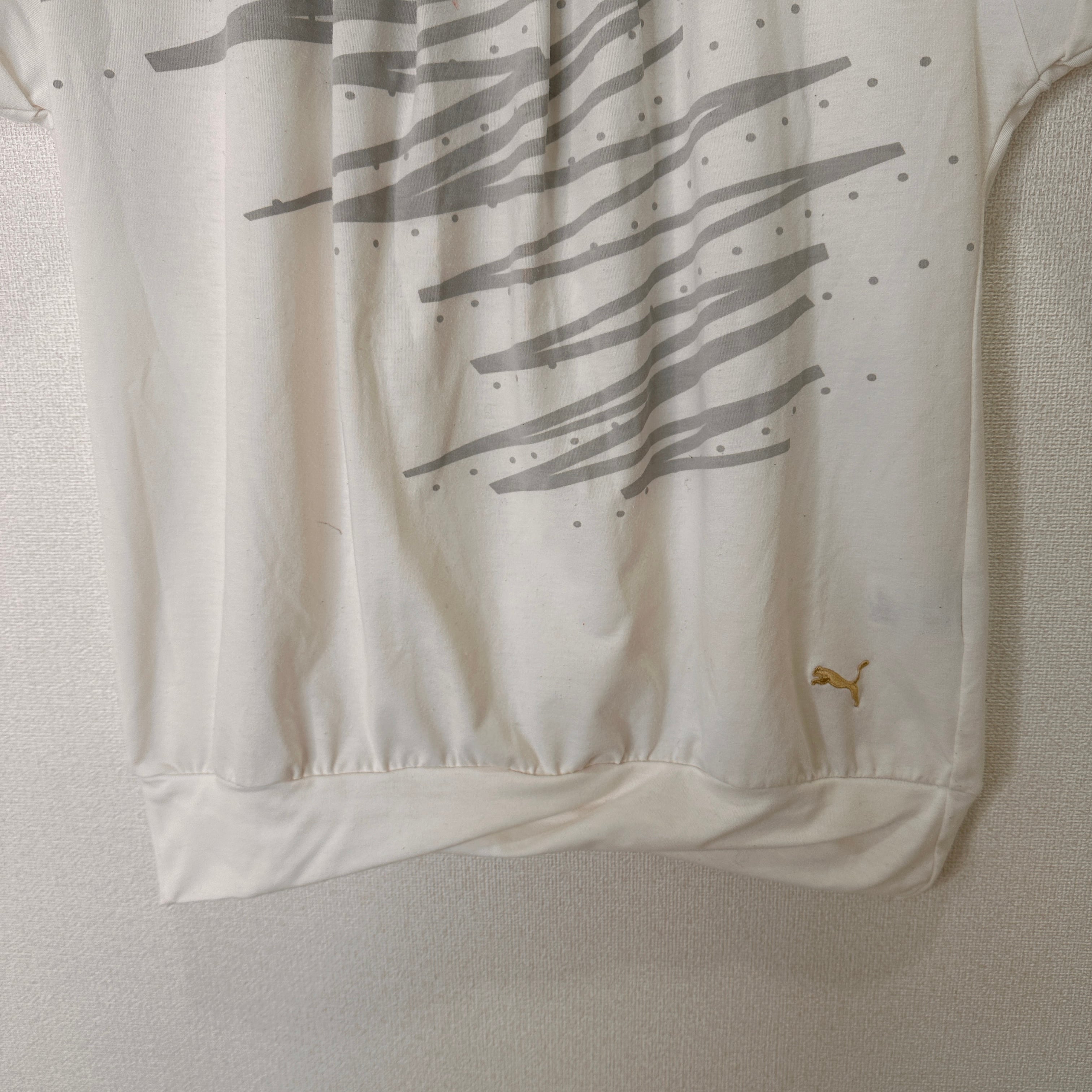 色は白(アイボリー系)で、胸元にはグレーの斜めラインのグラフィックプリント、裾にはゴールドのプーマロゴ刺繍が入っています。