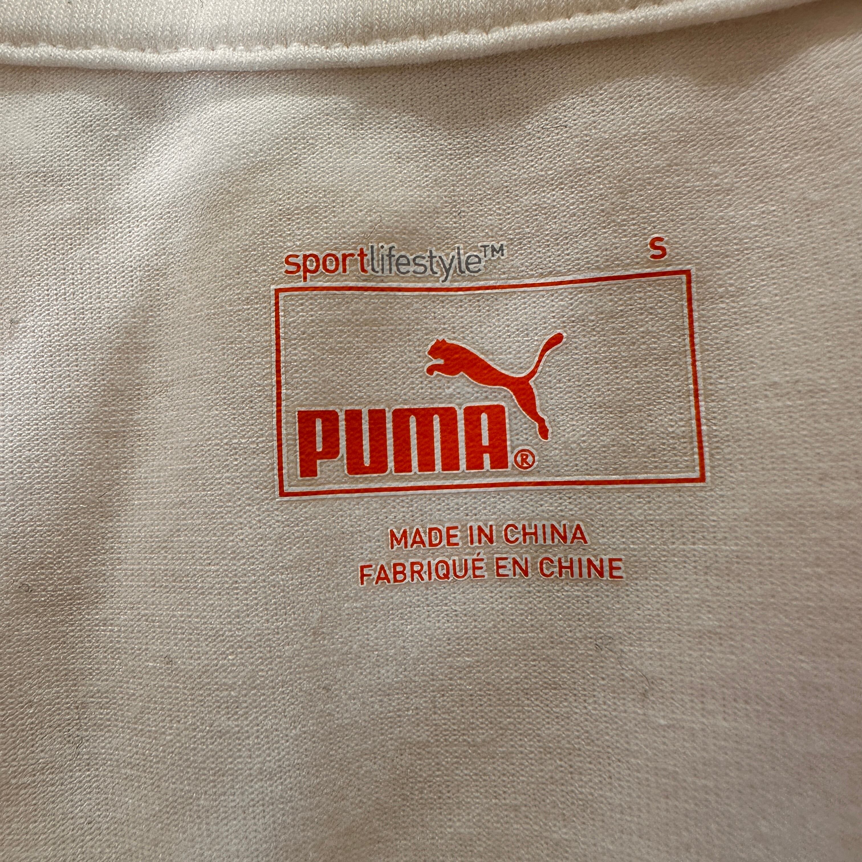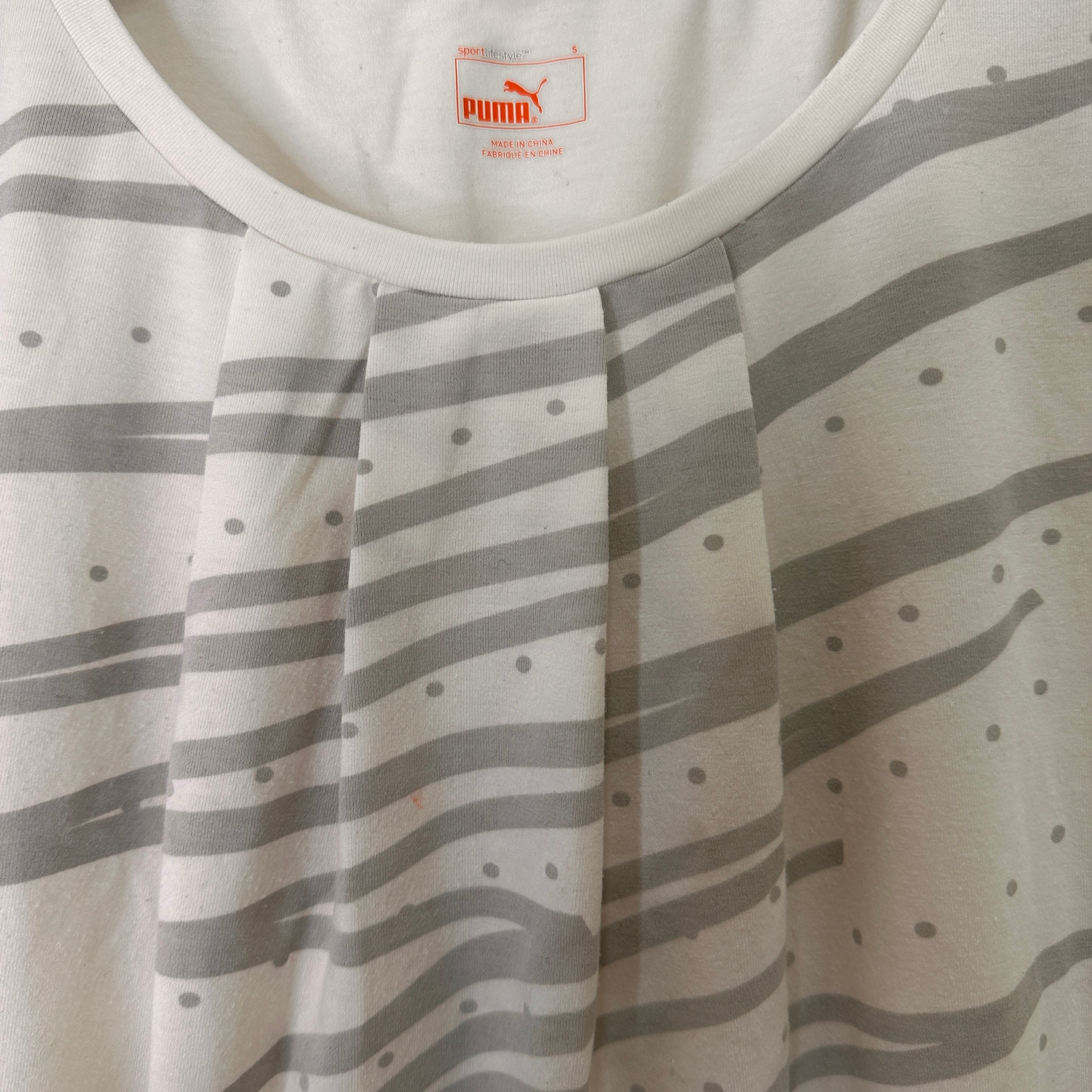 アイロンは低温(110℃を限度)で、プリント部分へのアイロンがけは避けてください。ホワイトのPUMA半袖シャツ、ストライププリントデザイン、サイズS。