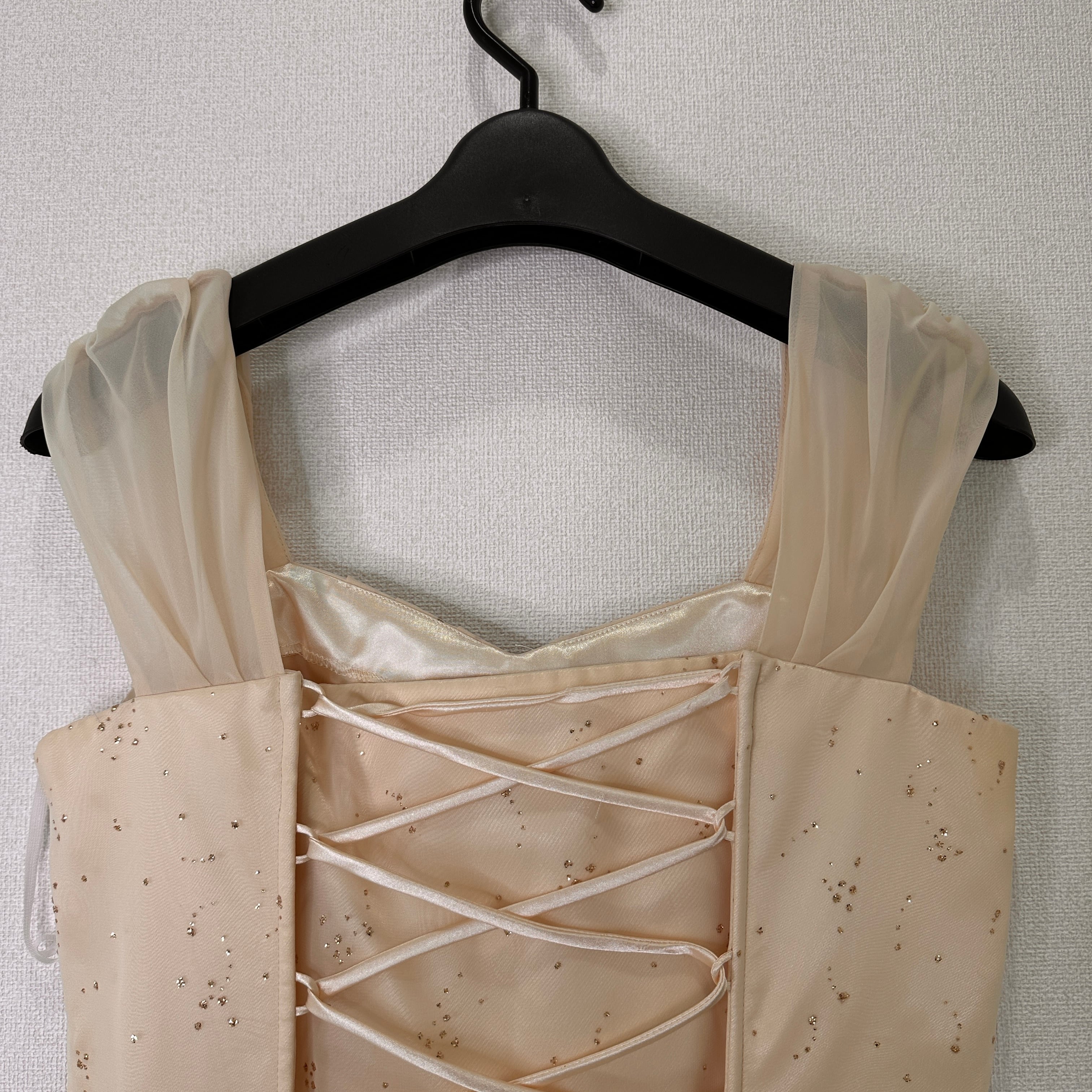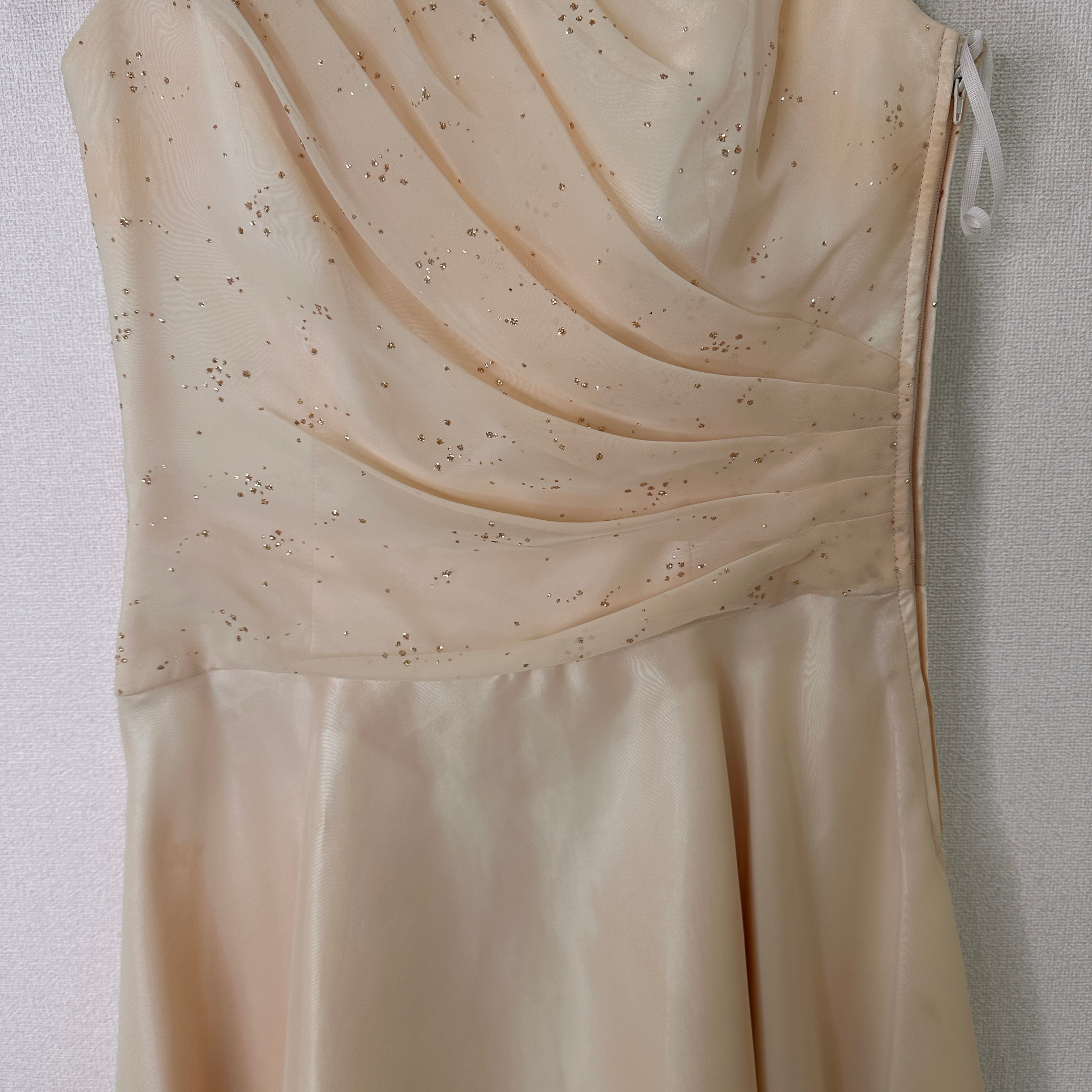 シャンパンベージュのような上品なカラーで、胸元のギャザーと全体に散りばめられた小さなラメ/スパンコールが光を受けてきらめきす。
