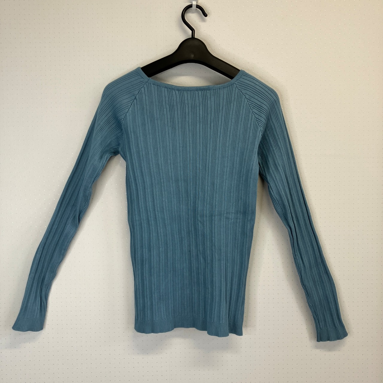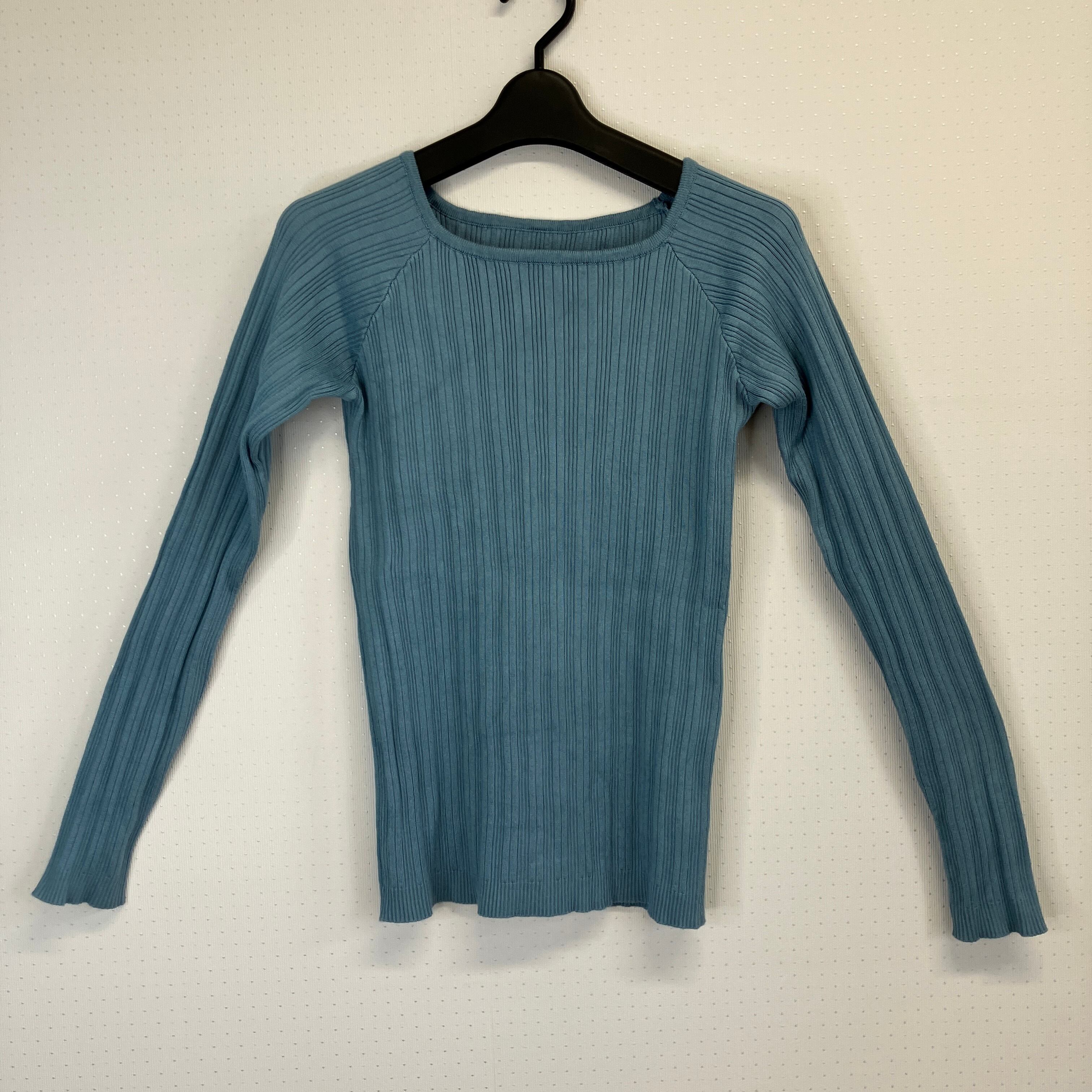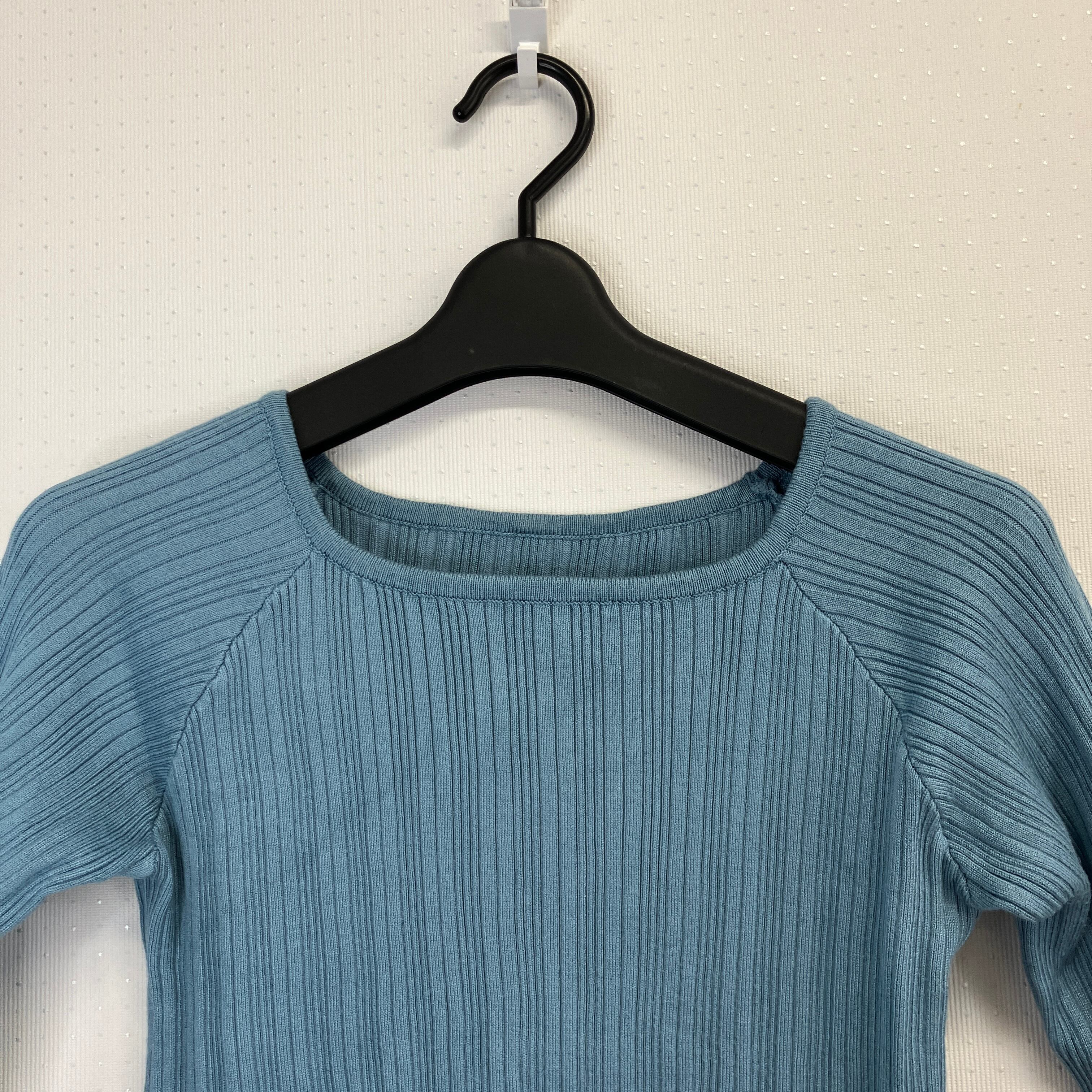 ※状態は写真を見てご判断ください。リブ編みデザインの水色長袖トップス、スクエアネック仕様。