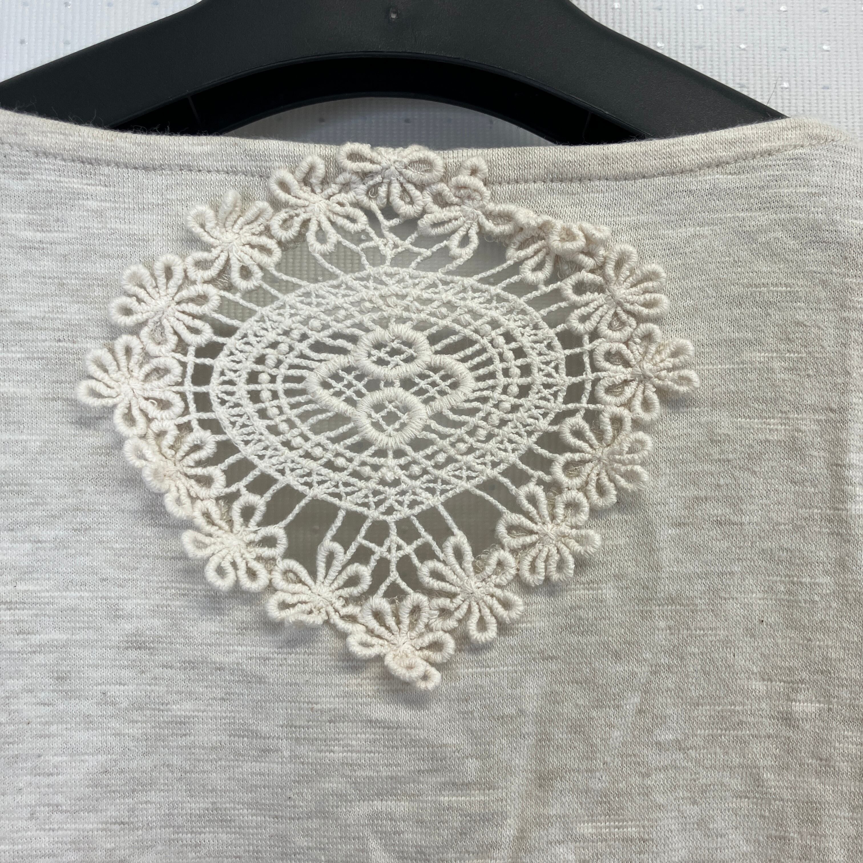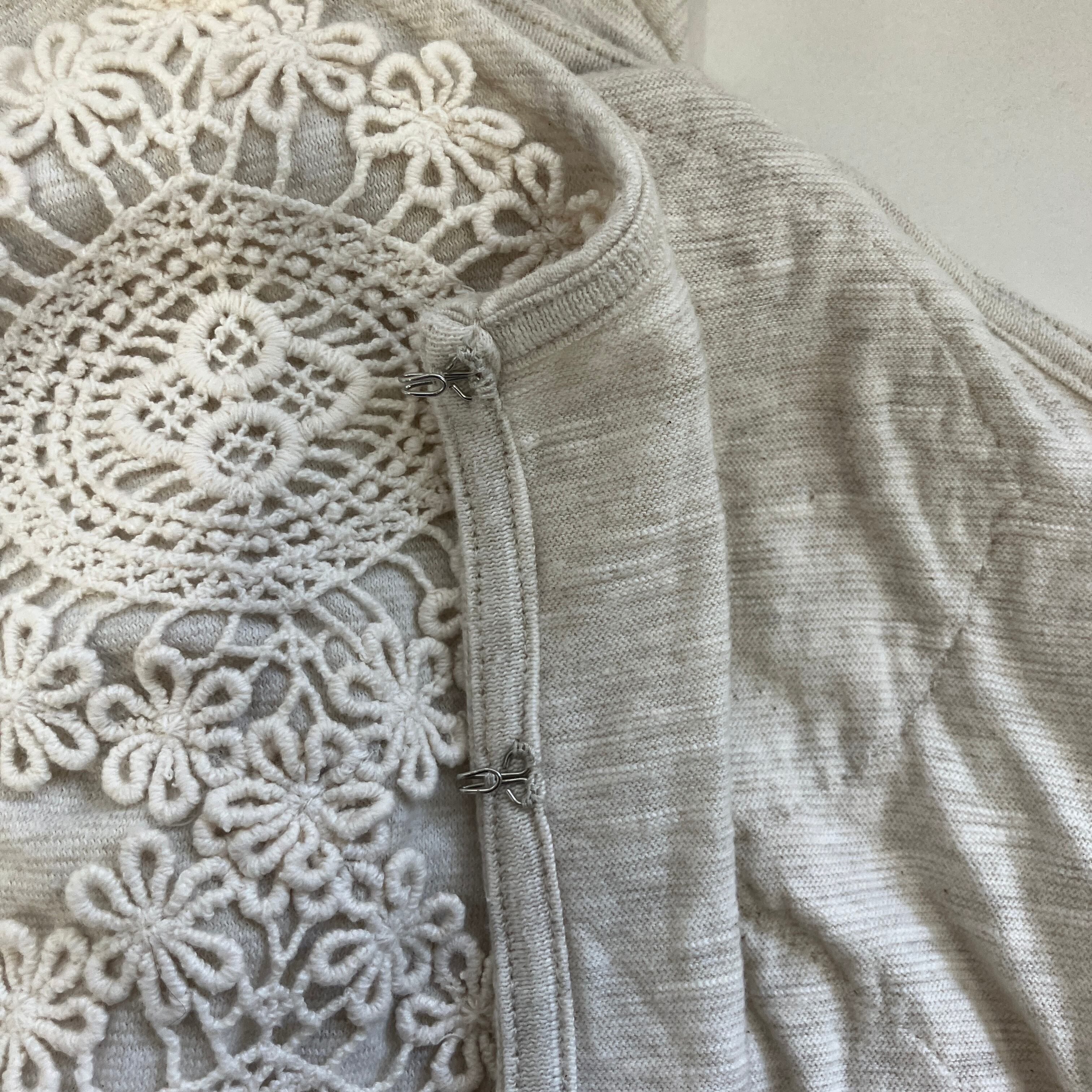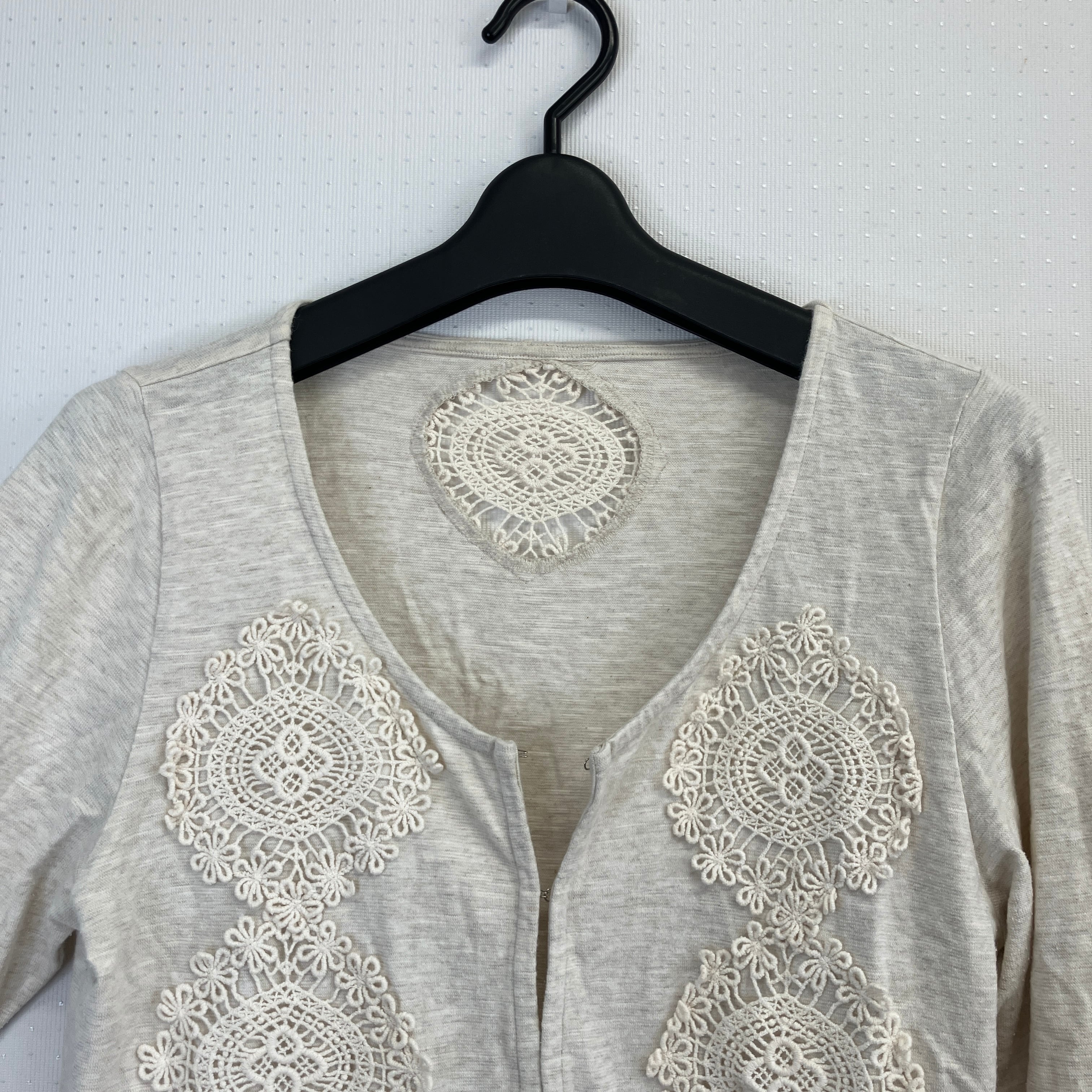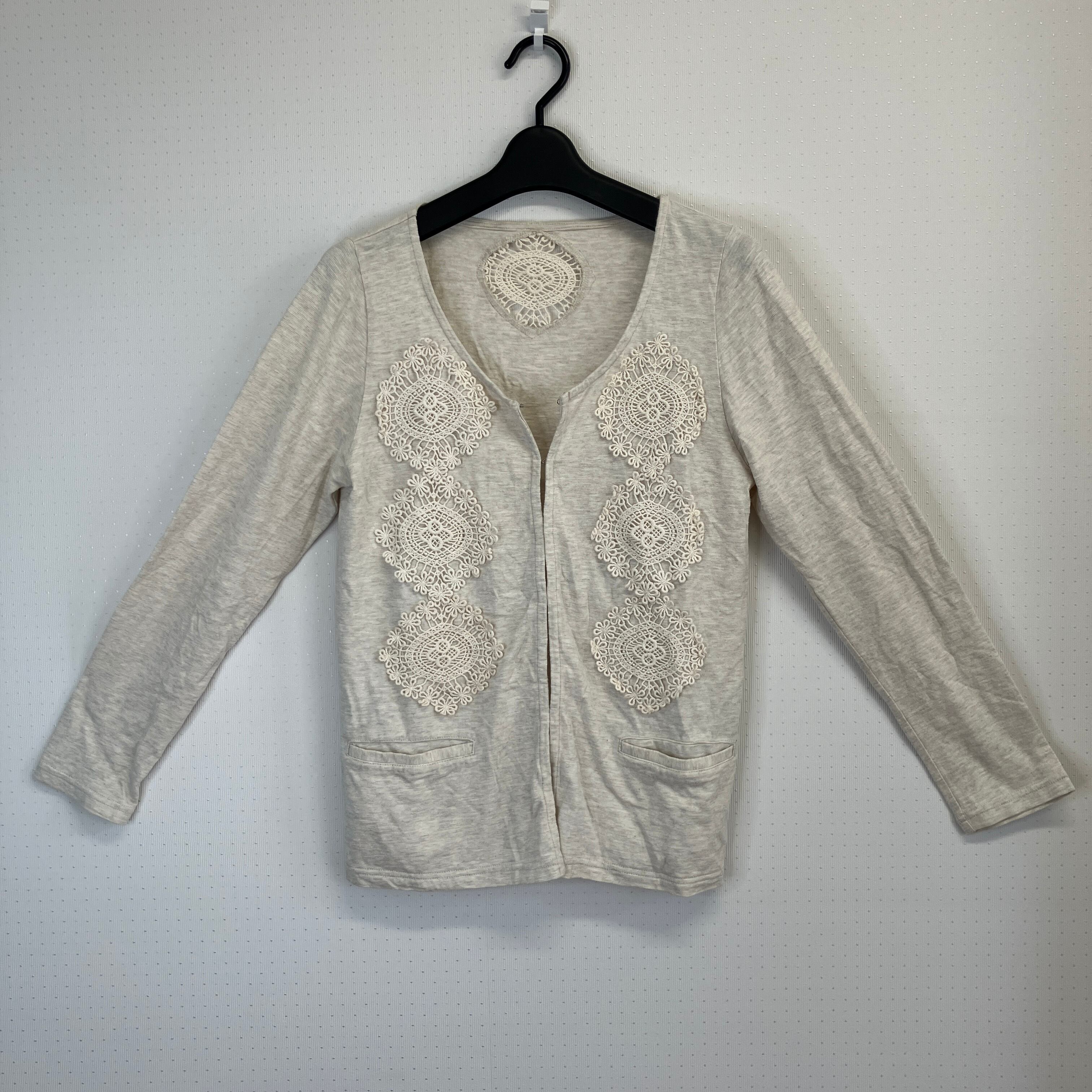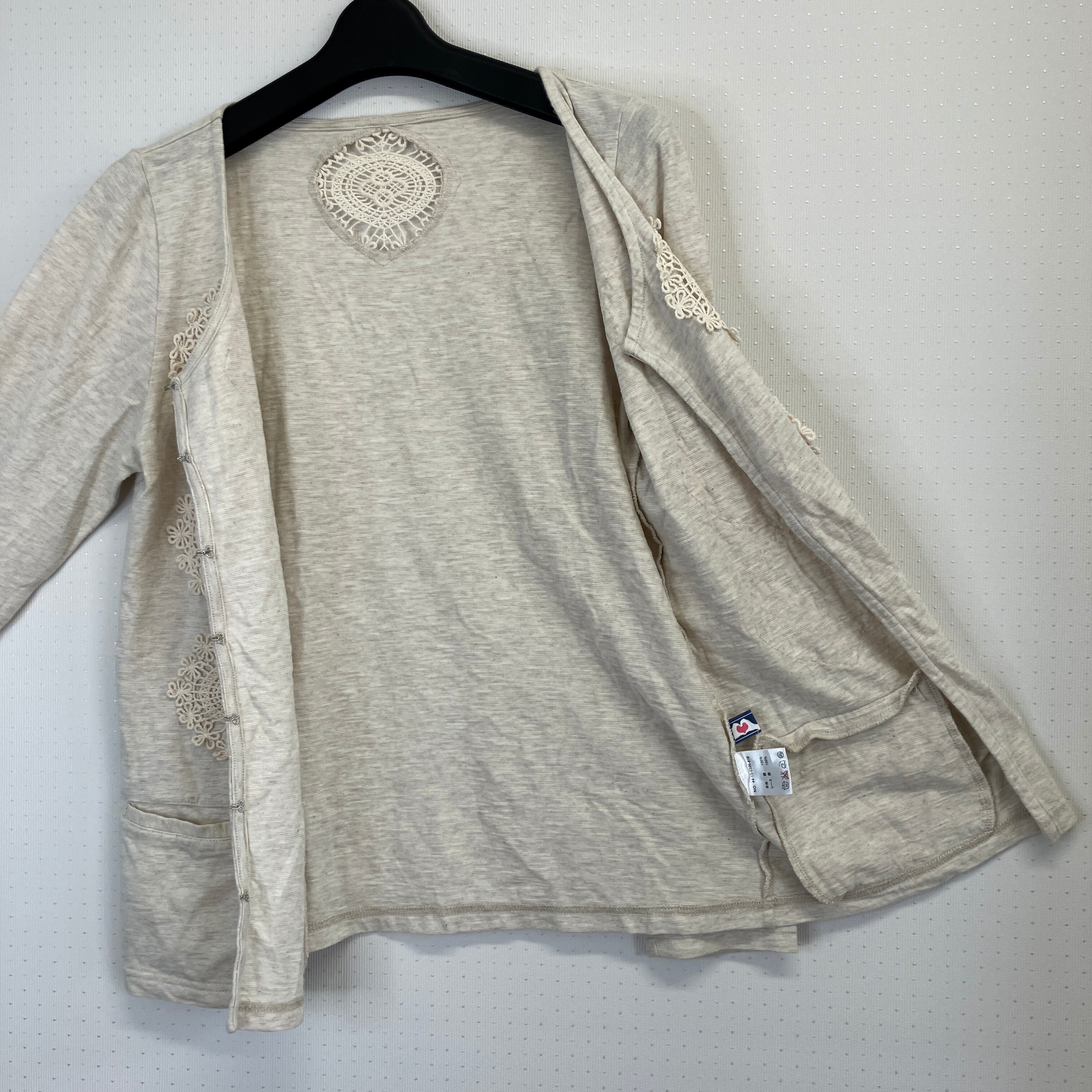 レース装飾が特徴のベージュの長袖カーディガン。