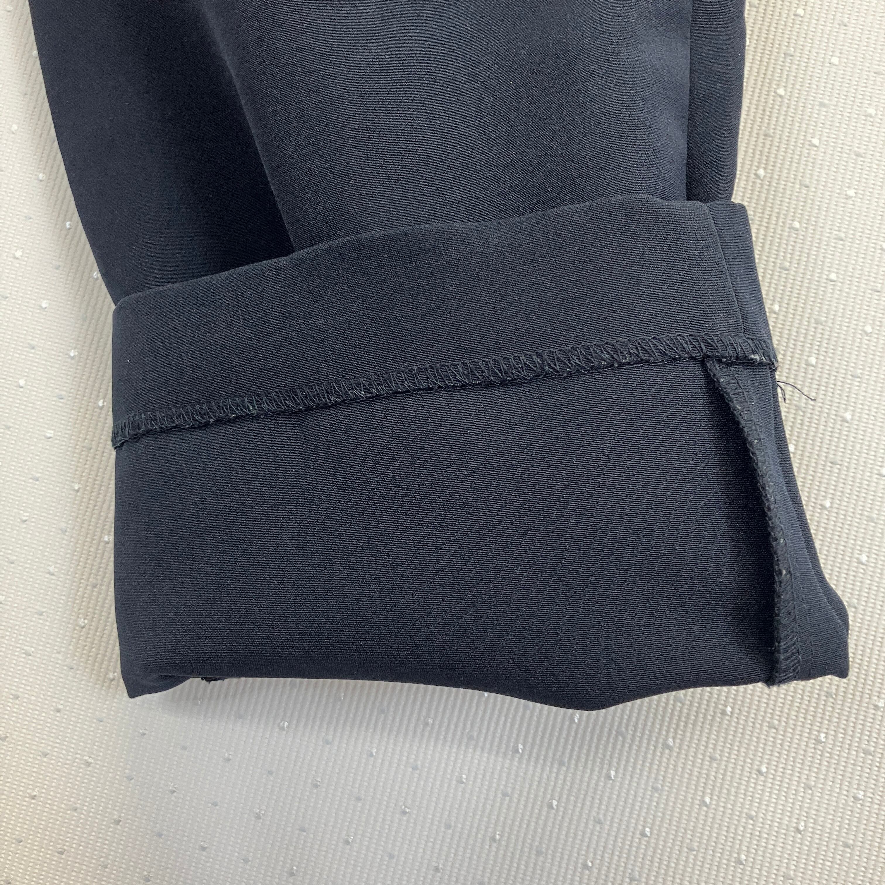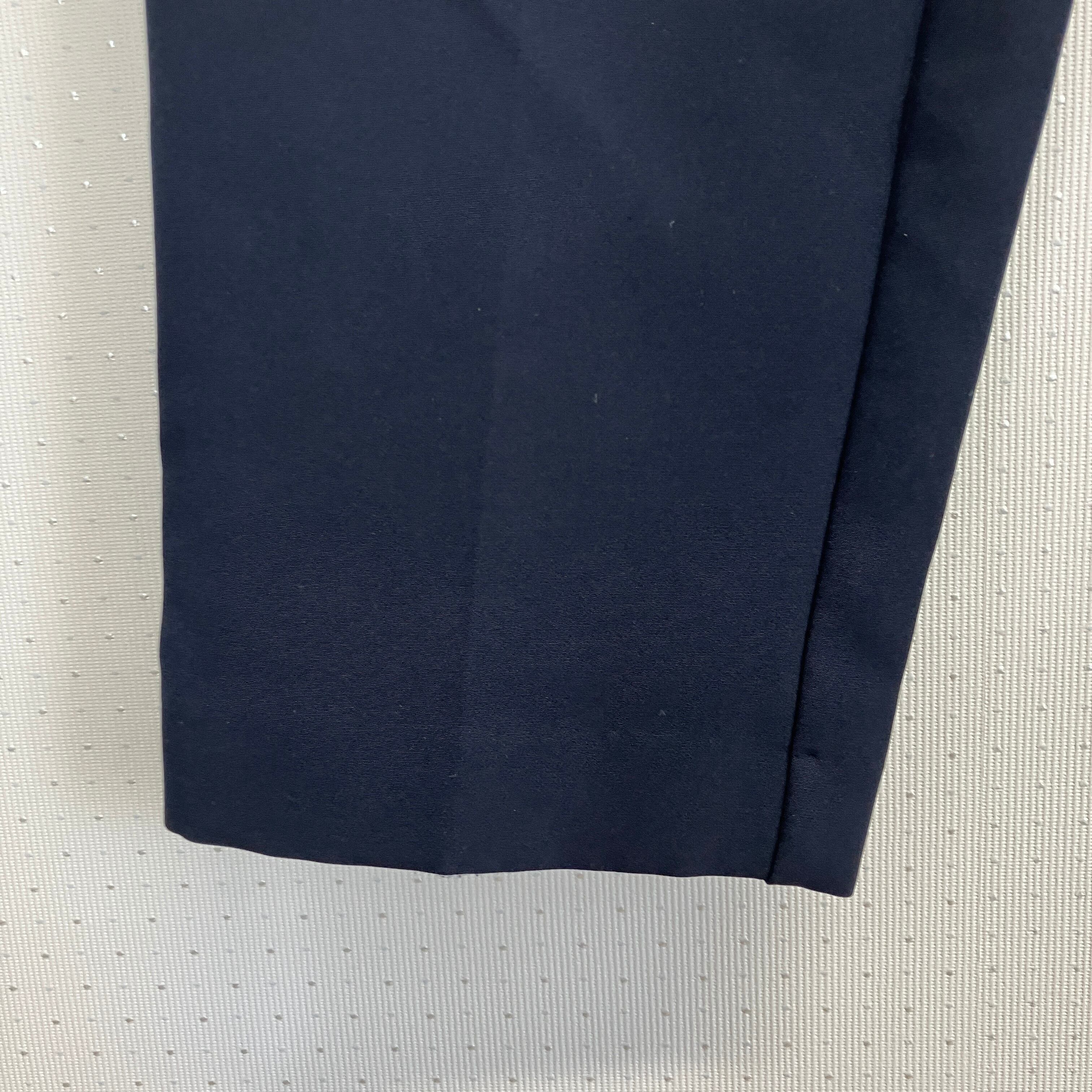 ネイビーのセンタープレススラックス、ジッパーフライ仕様でスタイリッシュ。
