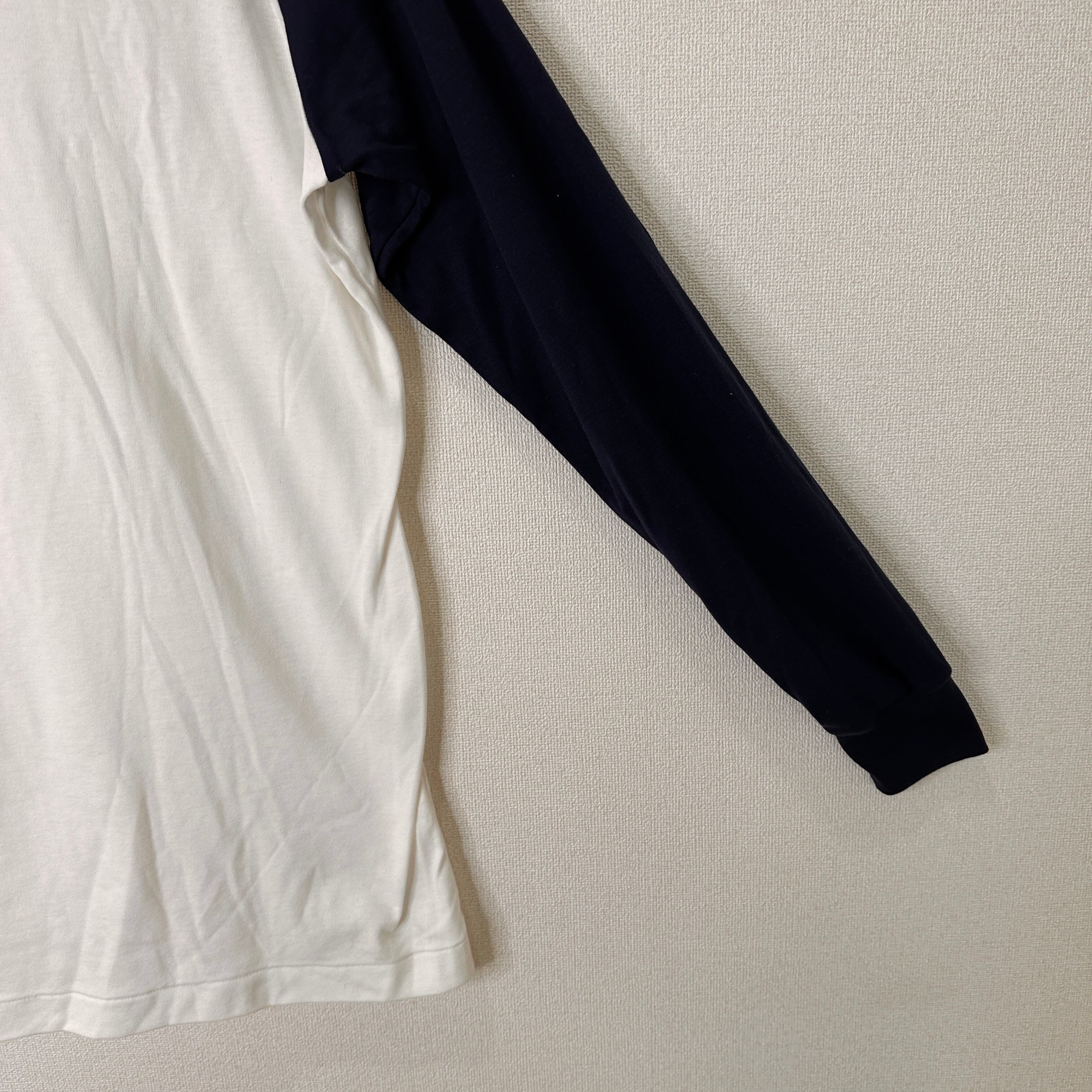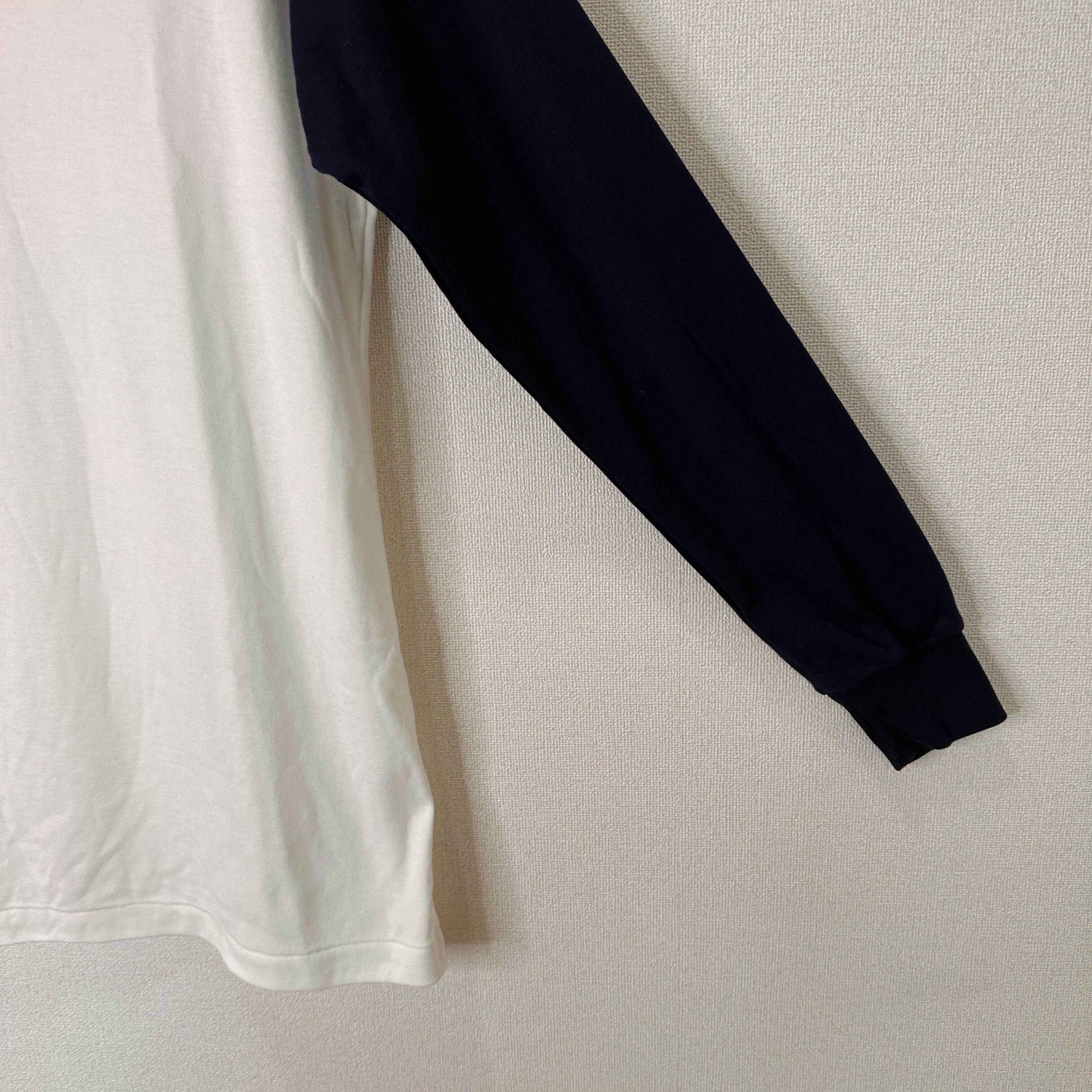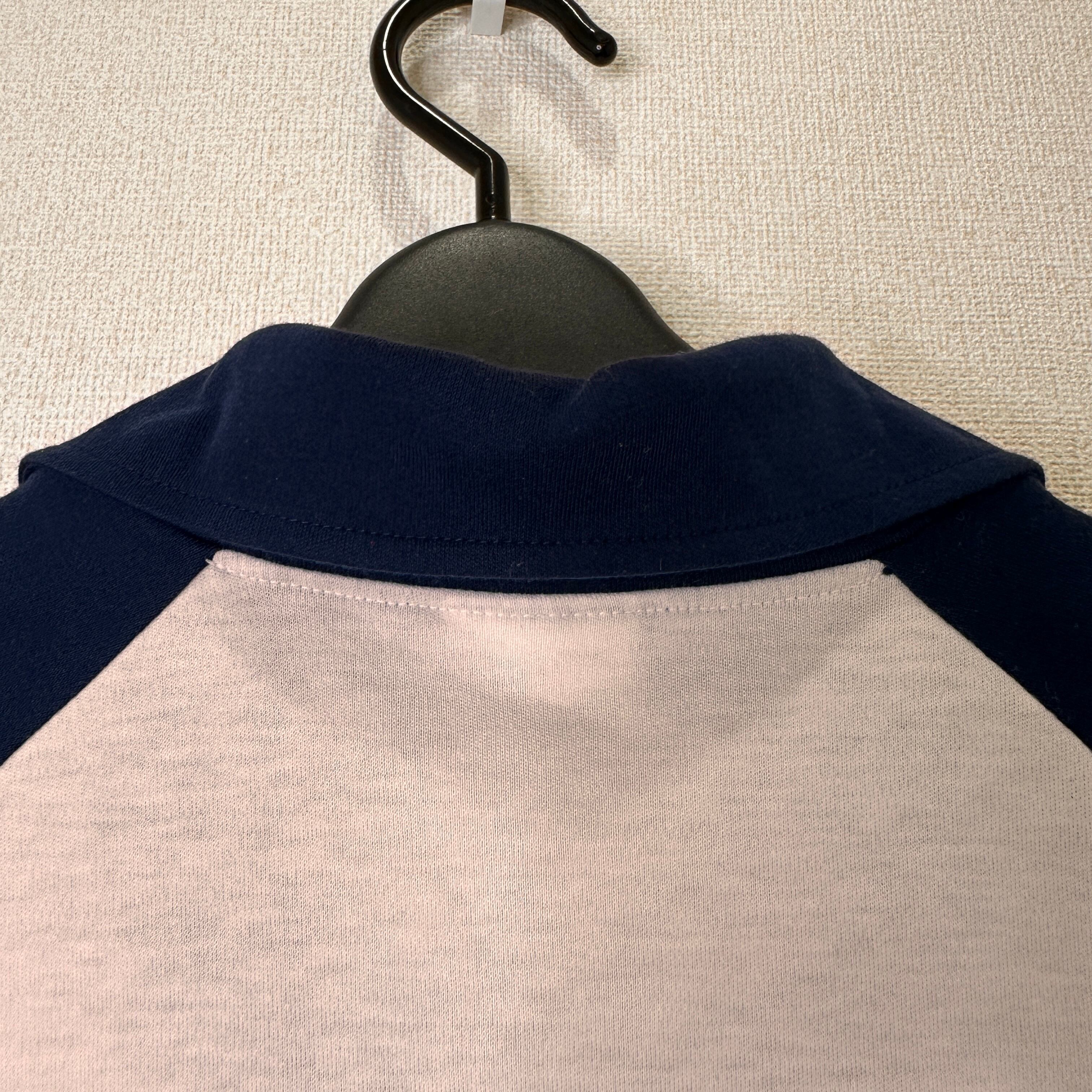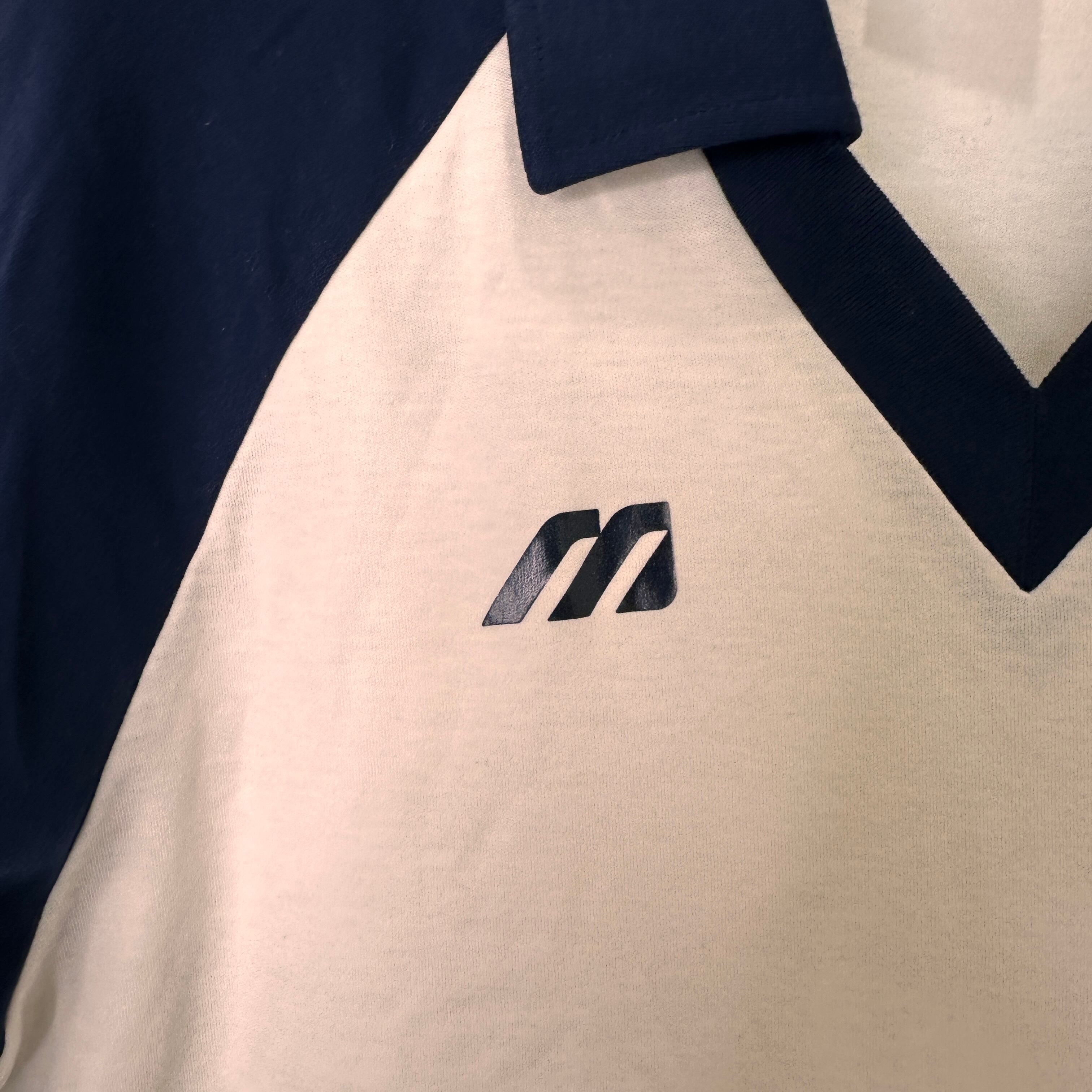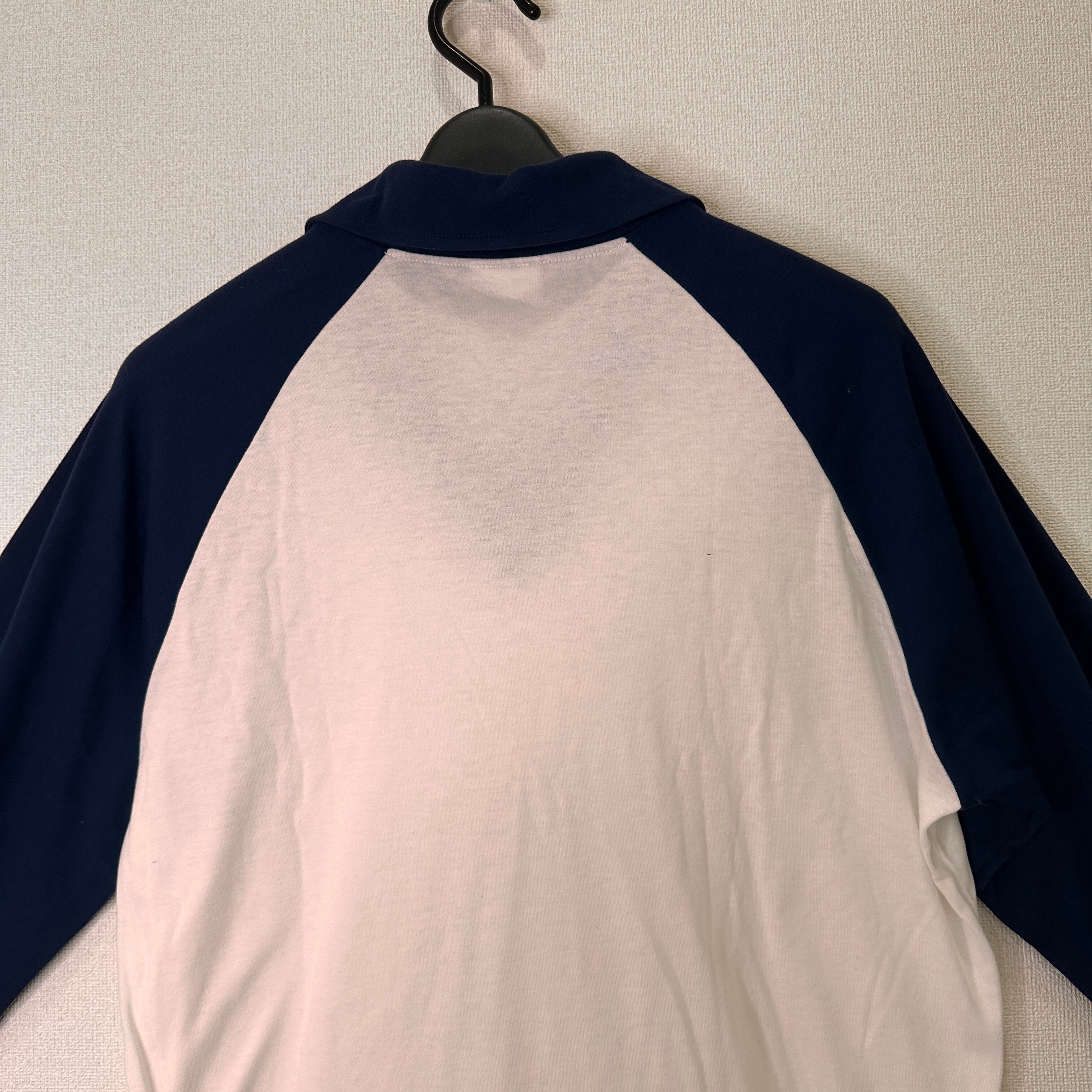 白とネイビー(紺)のバイカラーで、Vネックの襟付きポロシャツタイプです。