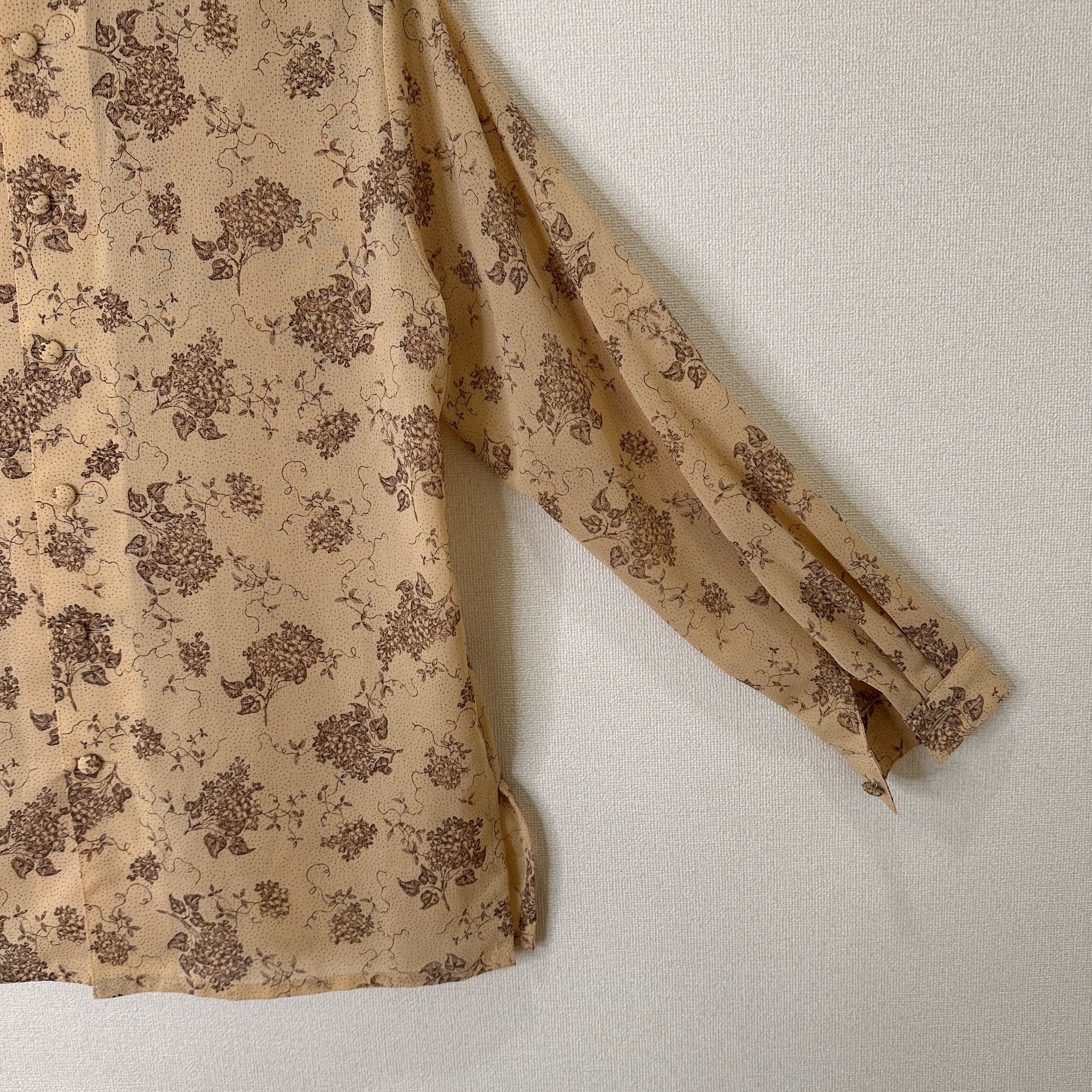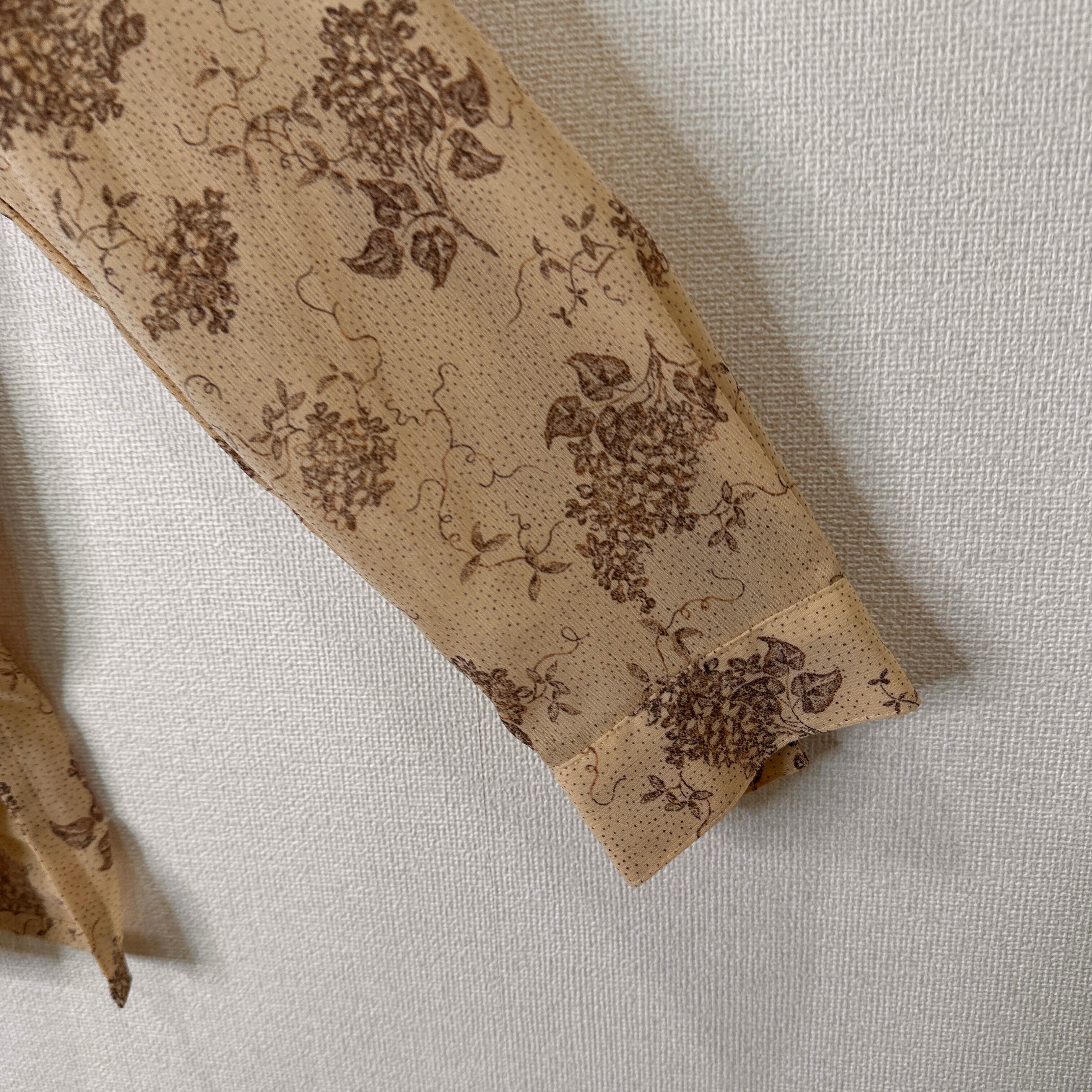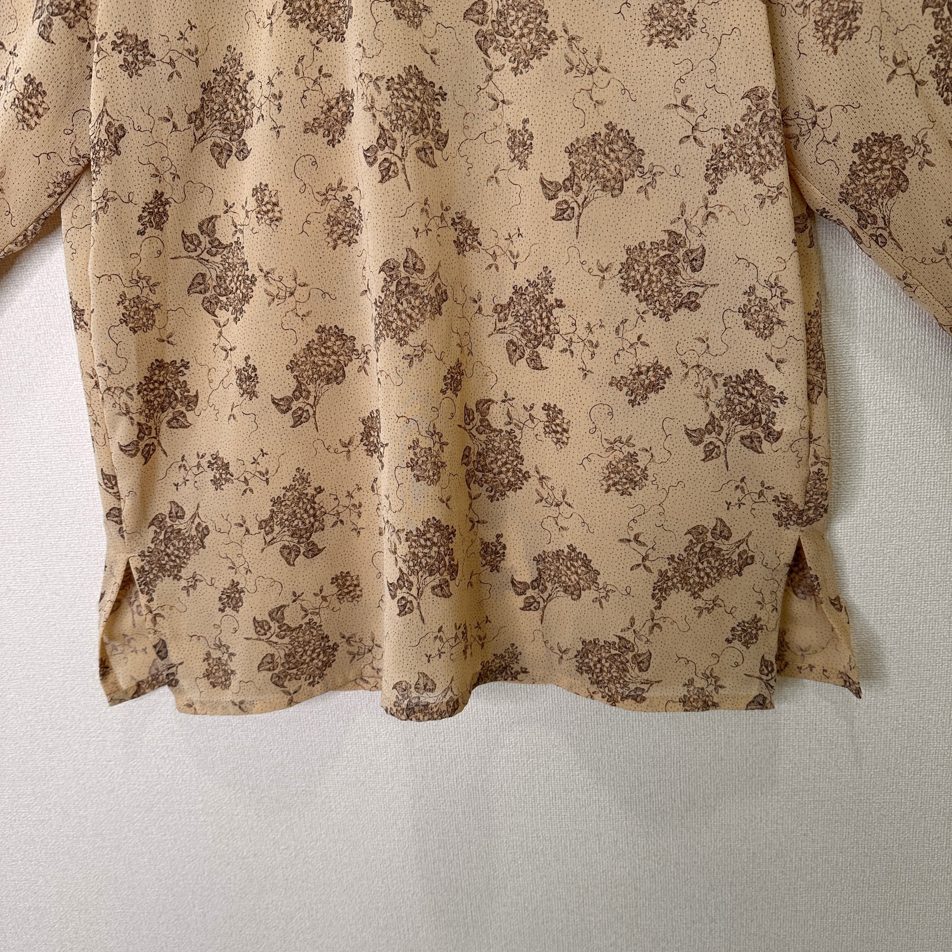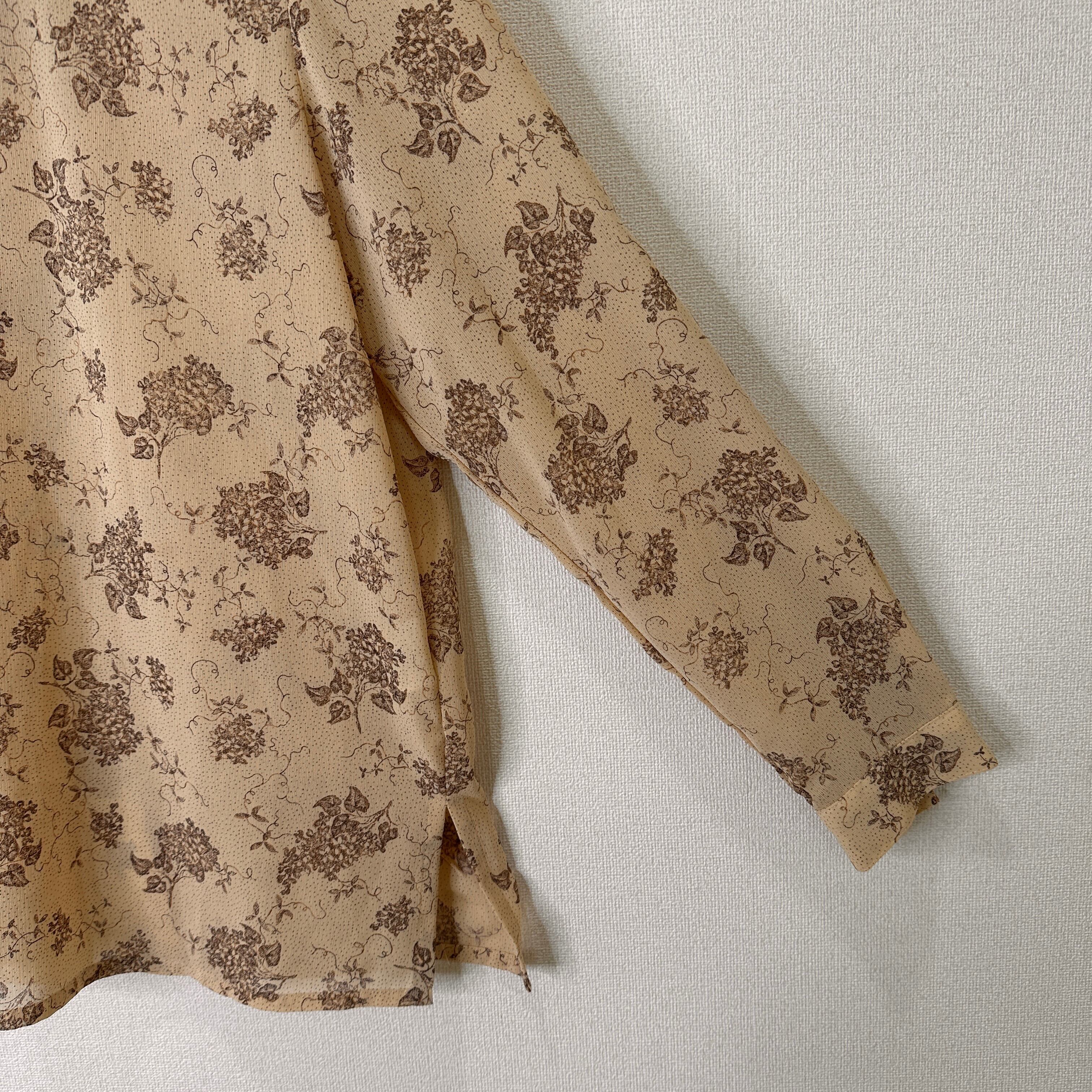 目立った傷や汚れはありませんが、中古品にご理解いただける方のみご購入をお願いいたします。ベージュの花柄デザインの長袖ブラウス。