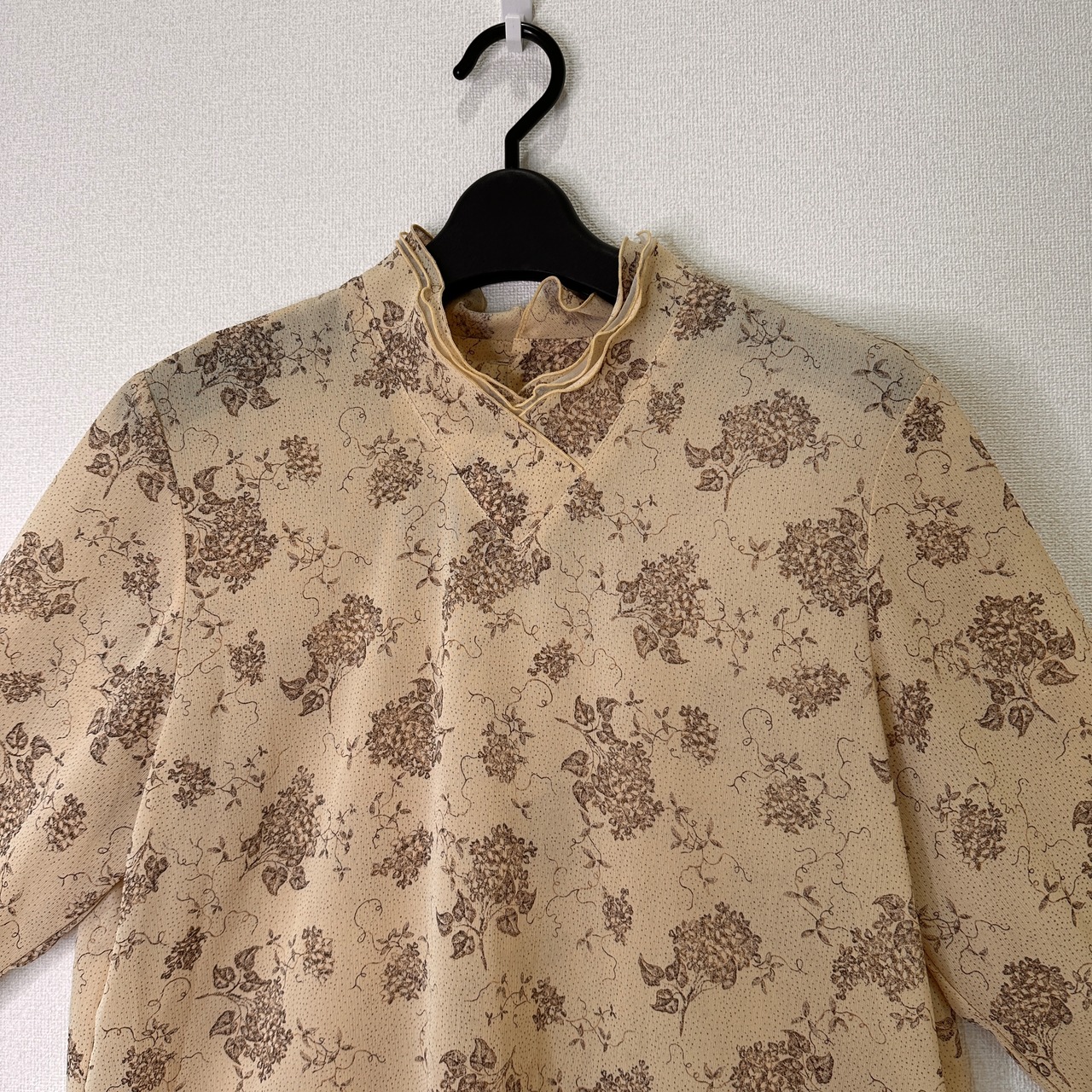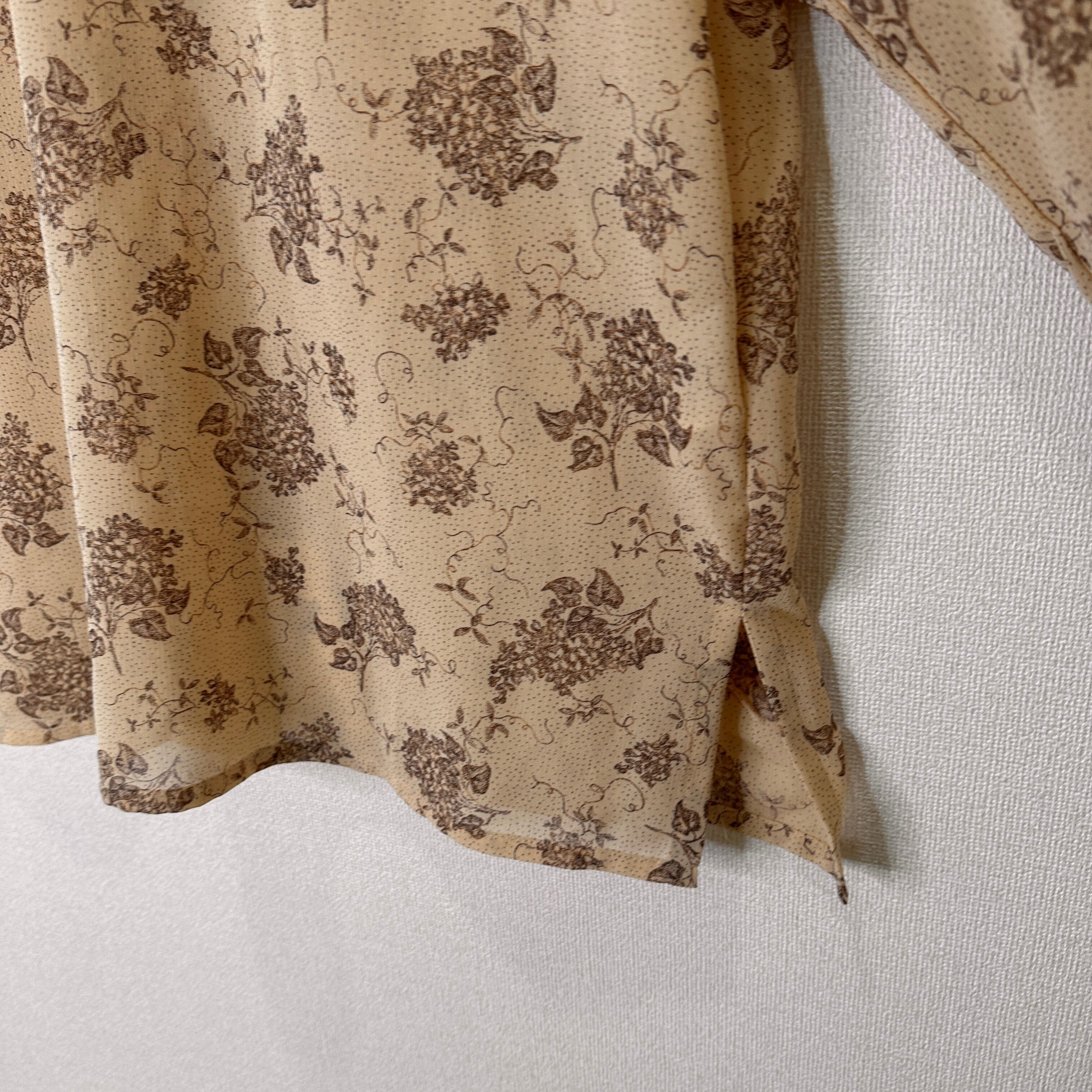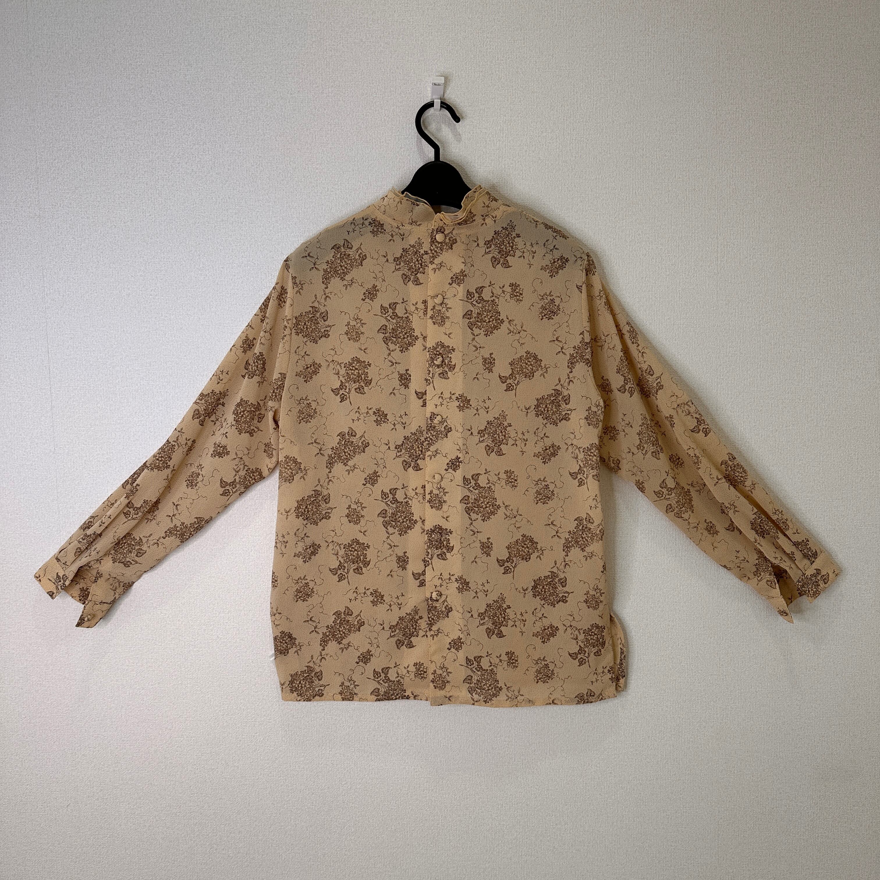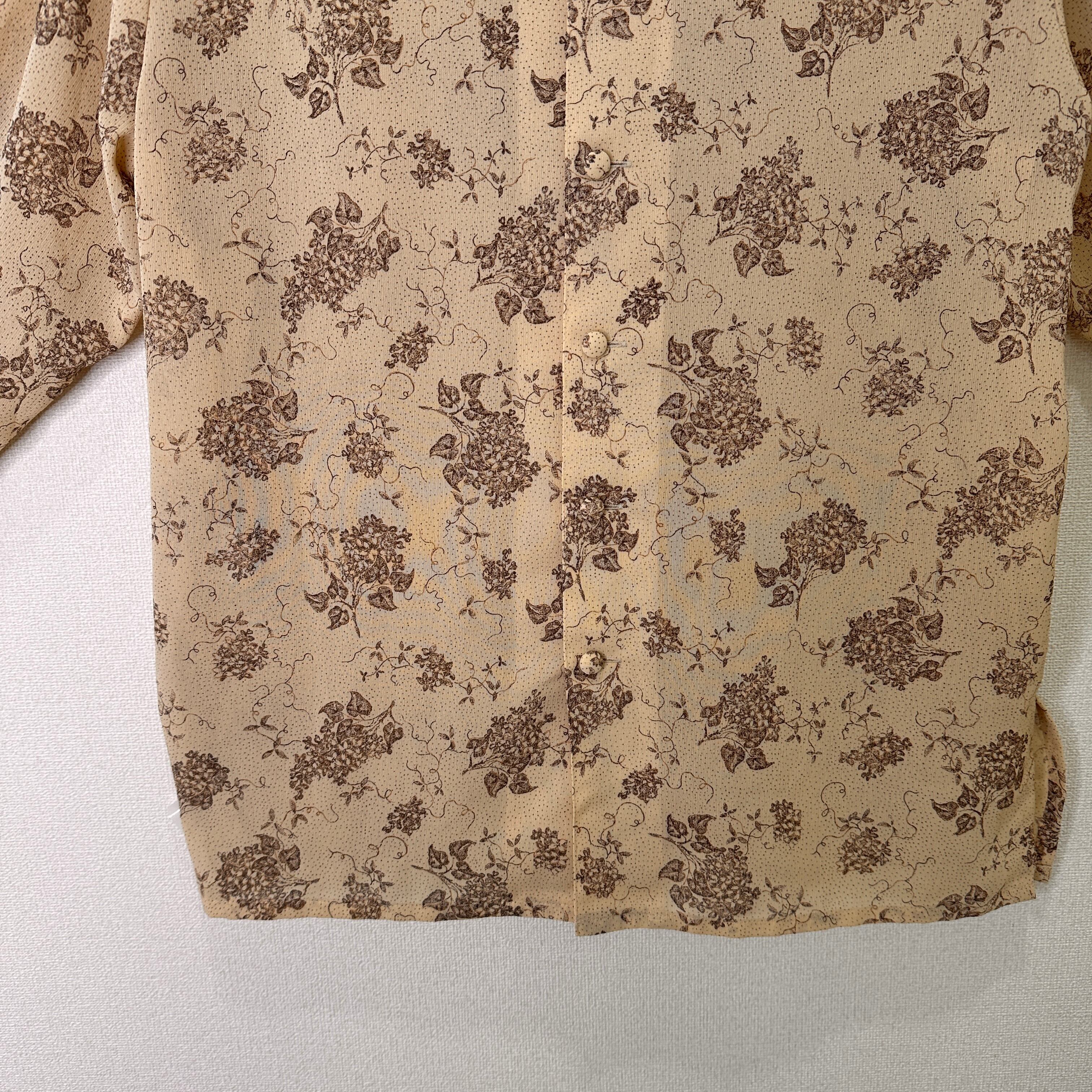 目立った傷や汚れはありませんが、中古品にご理解いただける方のみご購入をお願いいたします。ベージュの花柄デザインの長袖ブラウス。