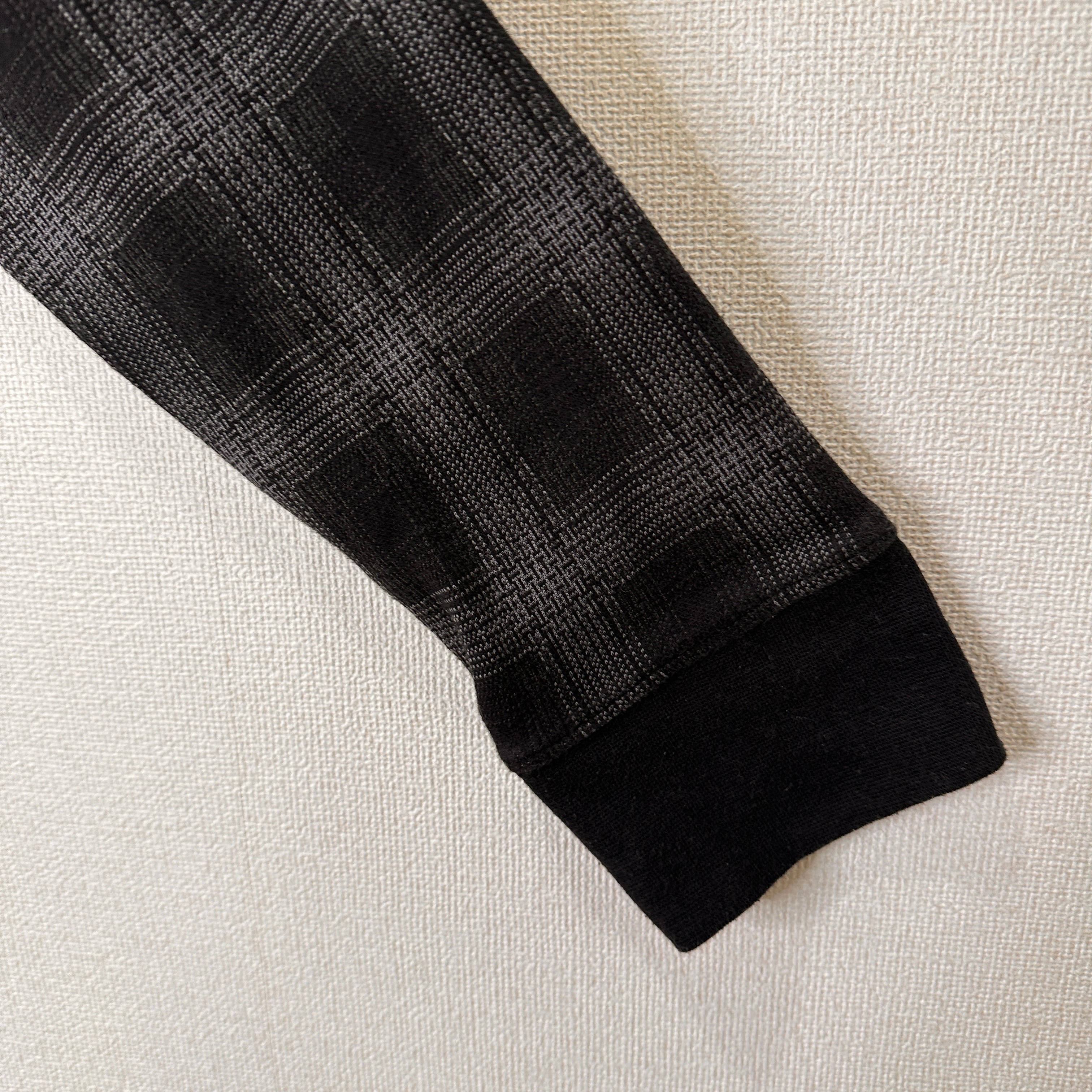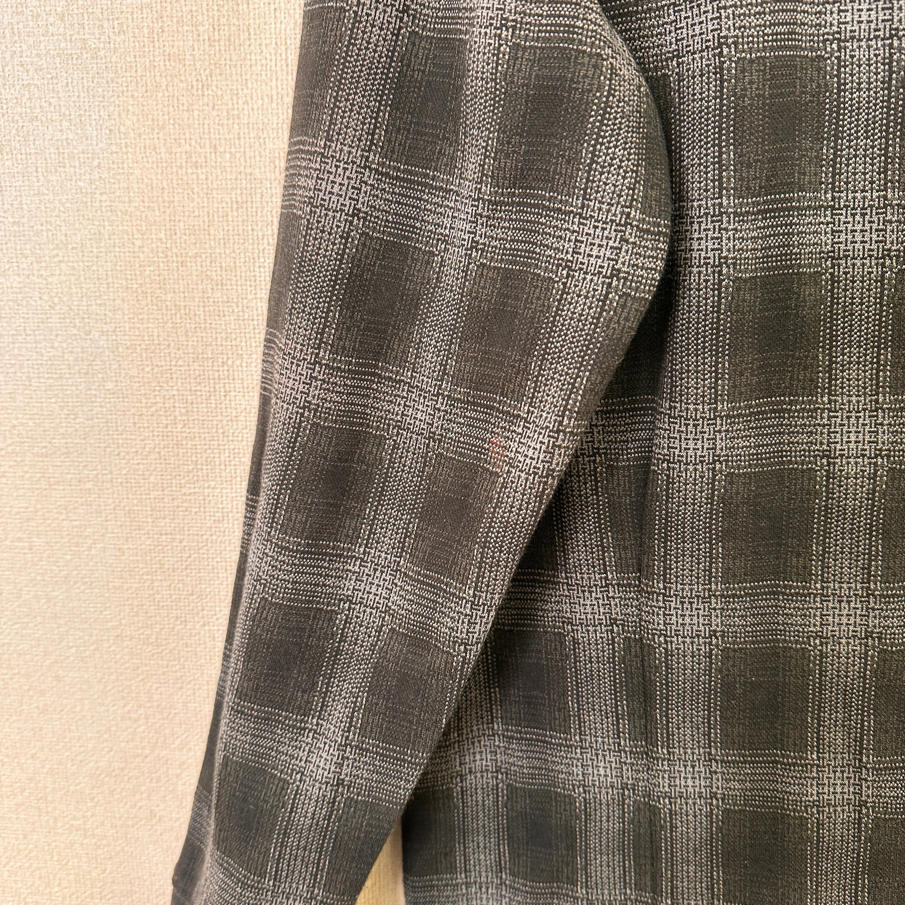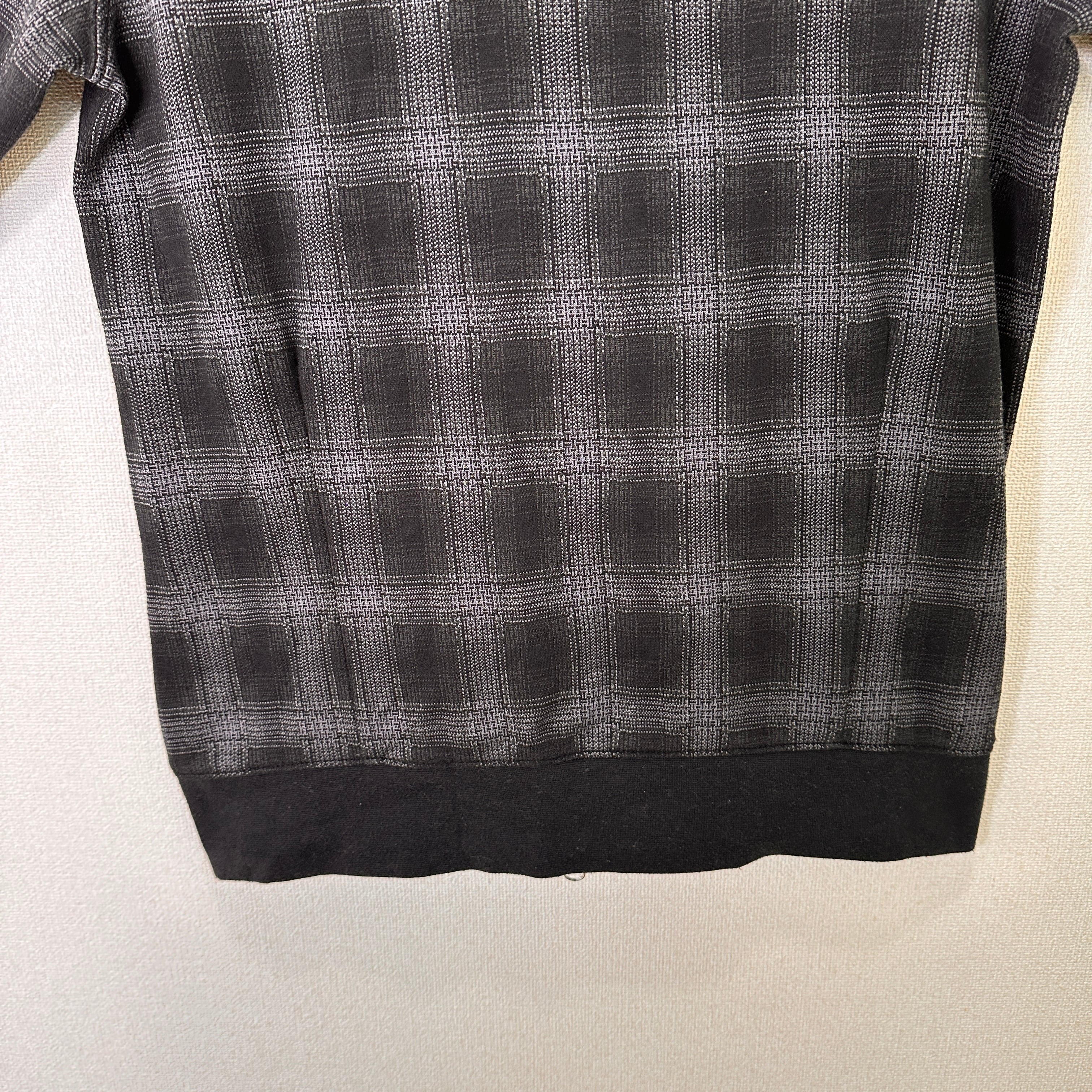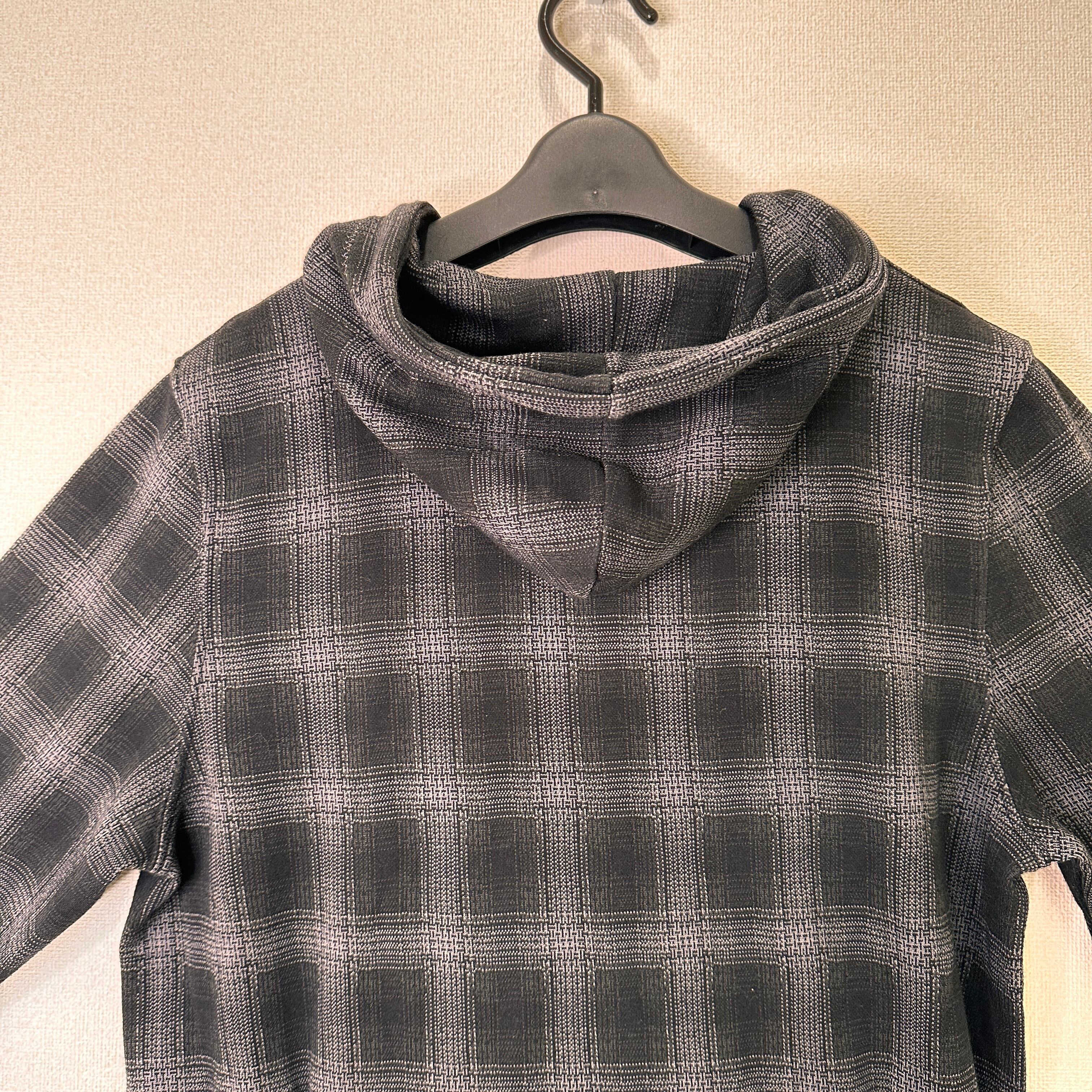 色はグレー系で、細かい千鳥格子のような模様(ジャガード織り、またはプリント)が入ったデザインです。